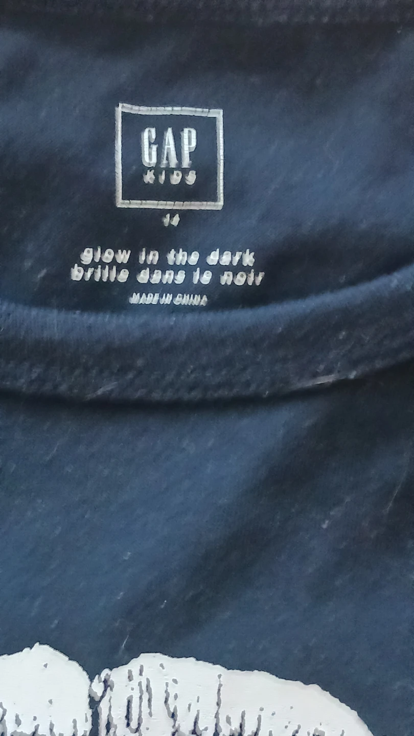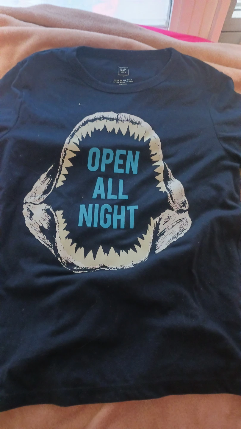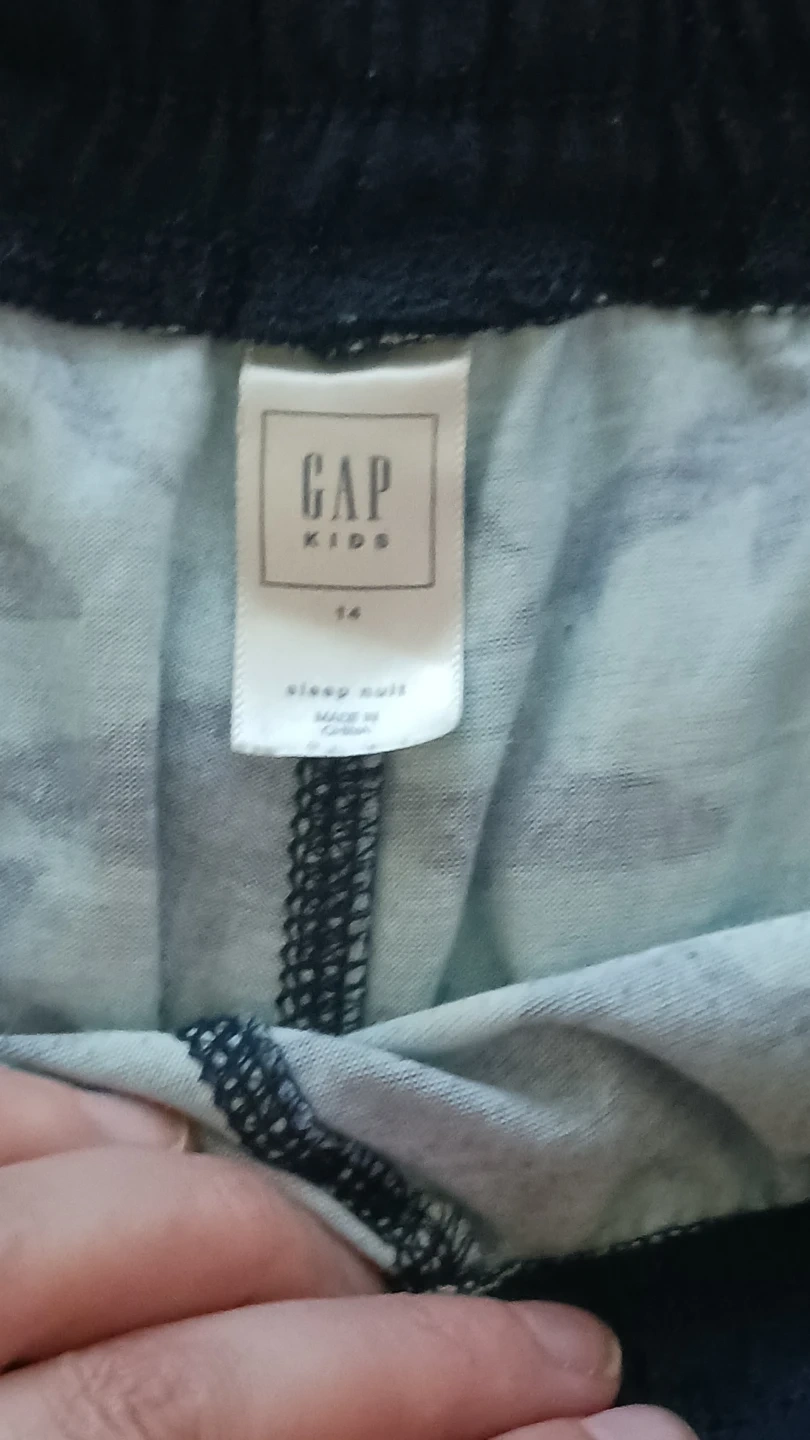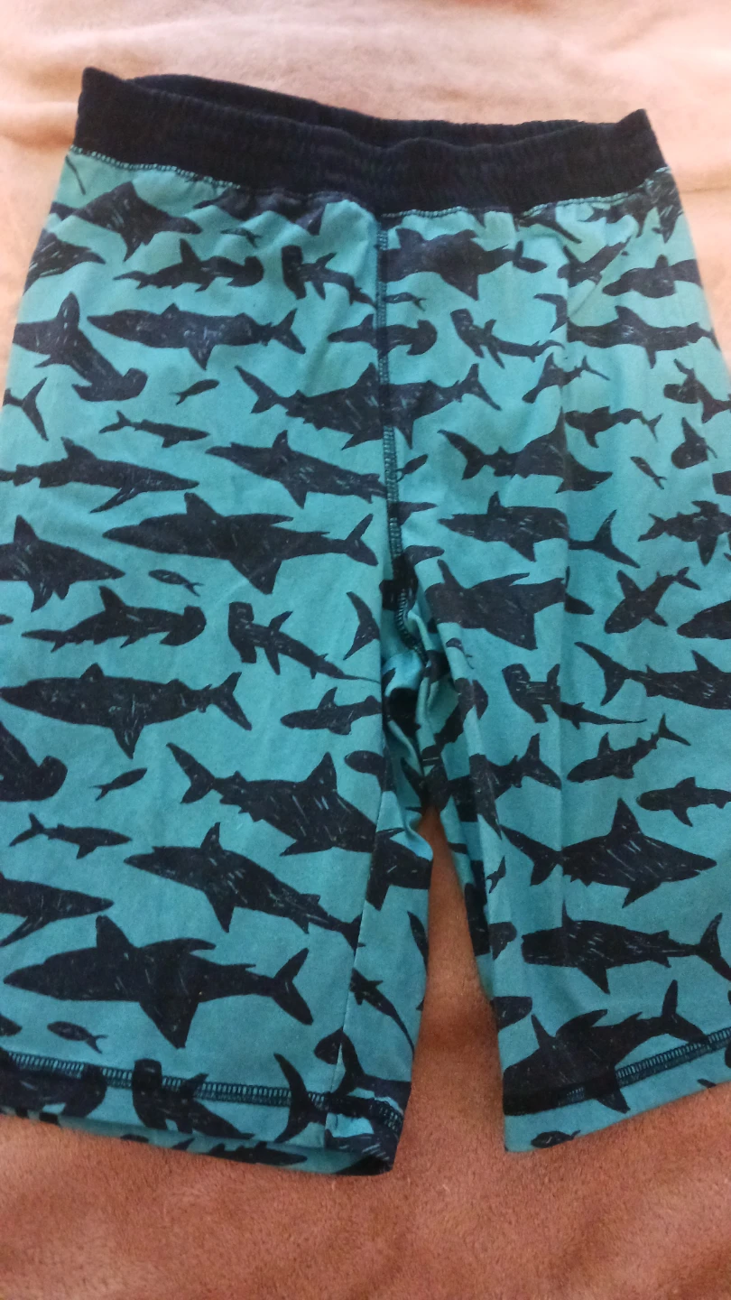 Selling a GAP Kids pajama set featuring a shark design! The set includes a t-shirt with a shark jaw graphic and shorts with a shark pattern. Both pieces are size 14.