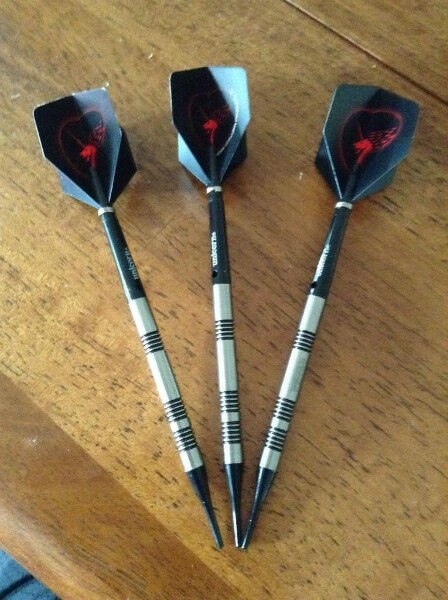 Perfect for all level darters or gift, introduce your friends/family to the exciting games of darts, both steel tip & soft tip Unicorn Soft Tip Core Laser Engraved 80% Tungsten Darts Engraved Unicorn hallmark of quality Includes: Gripper II shafts Unicorn Flights Can be easily converted to steel tip. Also have Unicorn Dart Case - Midi Wallet ($20); Target Playmate wallet ($10); Bulls Keycord Dart Holder Wallet ($10); Harrows Black Box Molded Case ($10); Cosmo fit shafts or flights ($10/set); variety of stems/shafts ($1/set of 3 & up), flights ($1/set of 3 & up); Target Titanium steeltip conversion points ($10) + other accessaries. Serious Buyer ONLY Please!