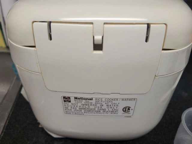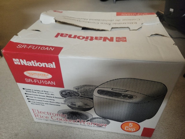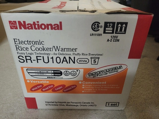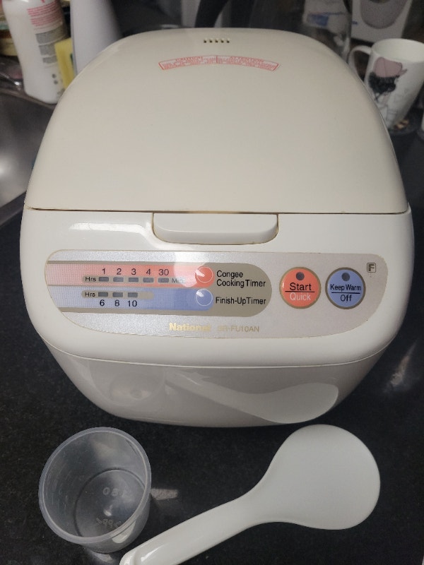 Looks and works like new with brand new measuring cup & rice scoop, scratches on inner bowl coating already reflecting on the low price. Price is firm, no offers, serious buyer and local pickup in Richmond Hill only, please read my full ad and only contact when you are ready to buy. Panasonic SR-DG102 Rice Cooker - 450 W - 1.06 quart - White Prepare up to 5 cups of uncooked rice Microcomputer and advanced Fuzzy Logic continually control and regulate heat for precise cooking and even, delicious results Smart keep warm function maintains optimum serving temperature for up to 12 hours, includes measuring cup and rice scoop Durable diamond fluorine-coated, non-stick inner pan transmits and retains heat in every grain of rice Easily select and set from 5 automatic menu options for a variety of rice, Quick / Slow Cook option, Porridge, Cake, easy to use and read soft-touch buttons