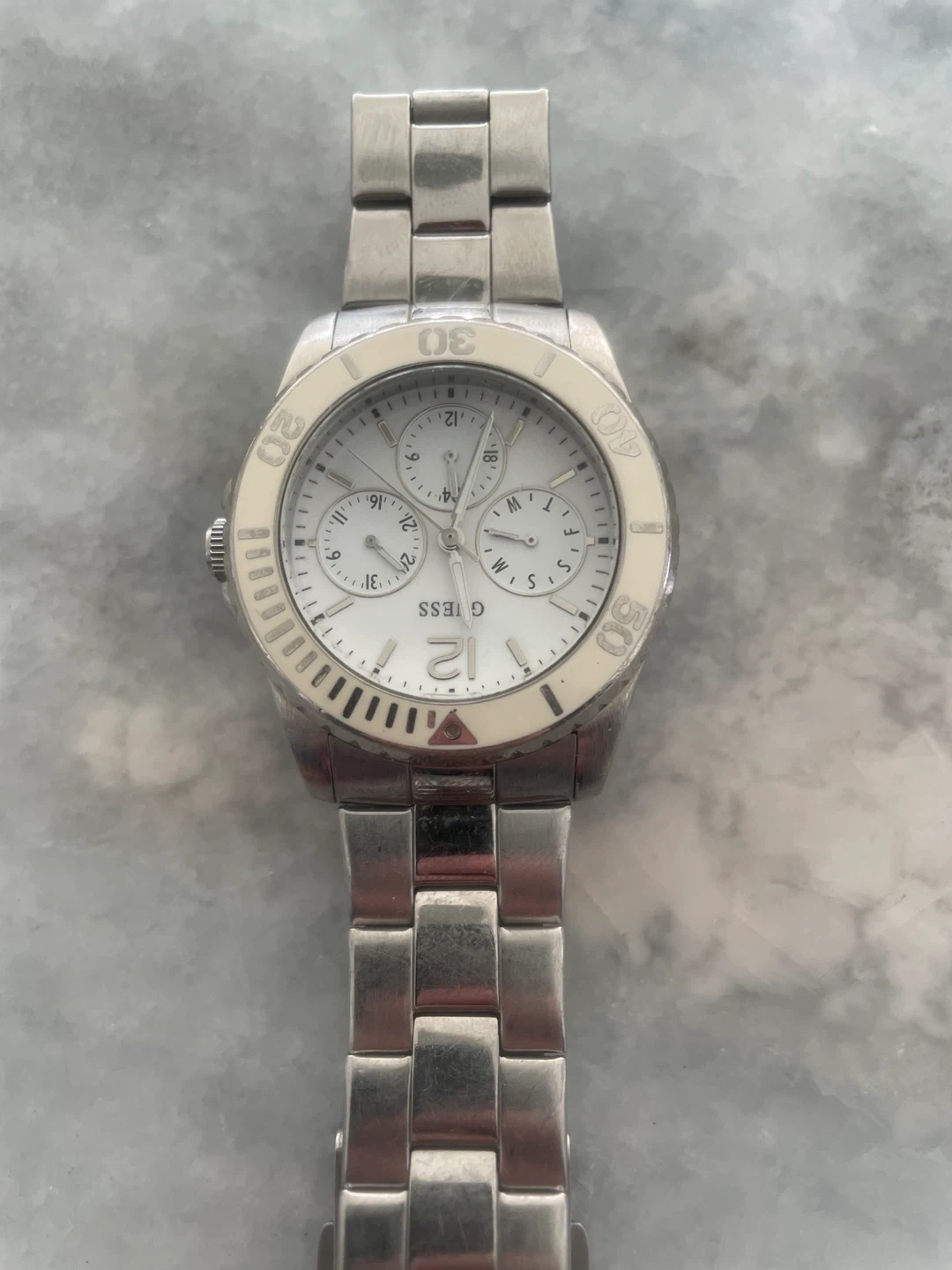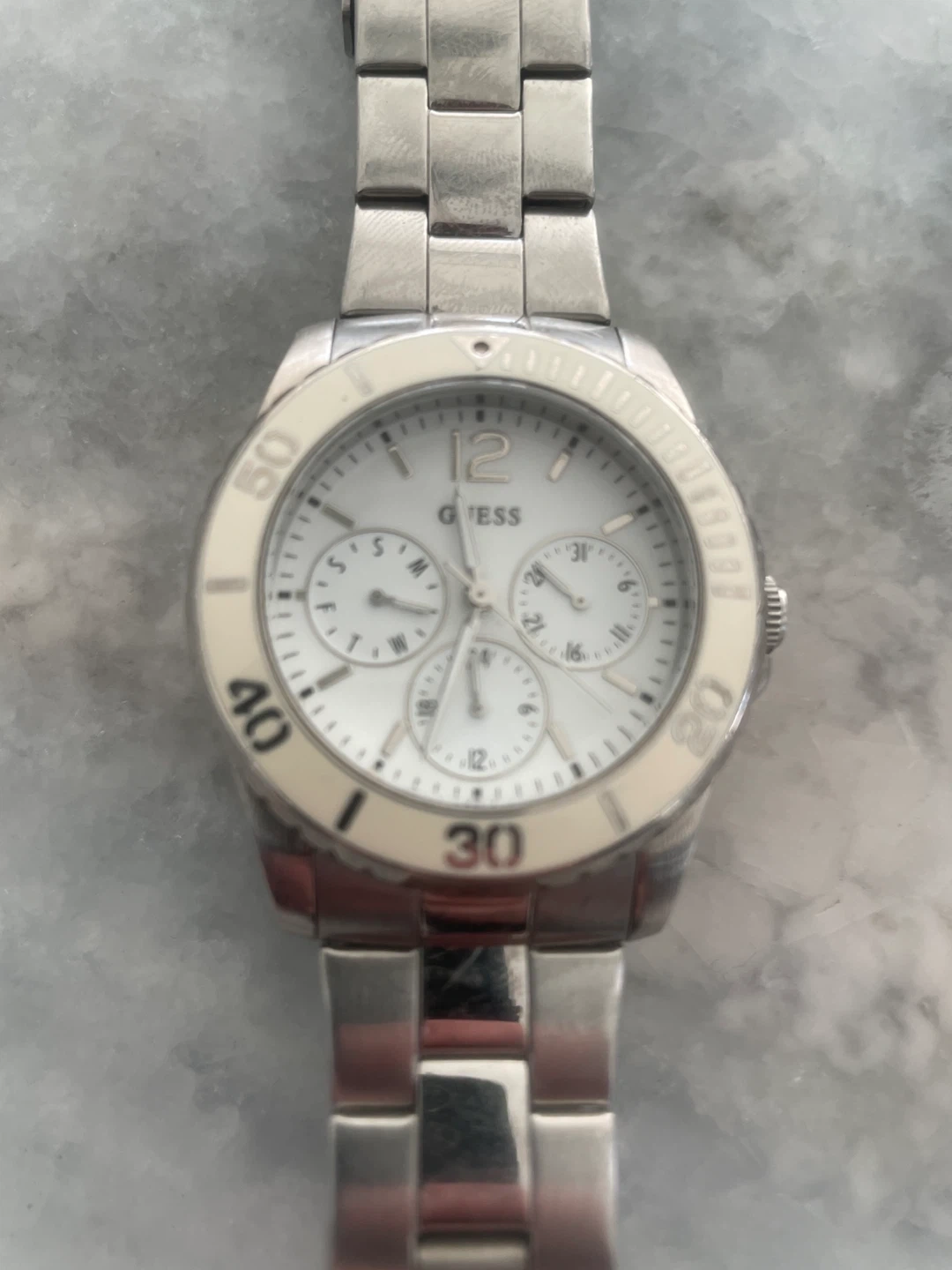 Selling a Guess women's watch in silver. It's in good condition and has a stylish design. Perfect for everyday wear!