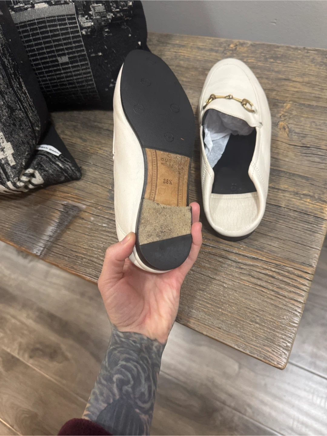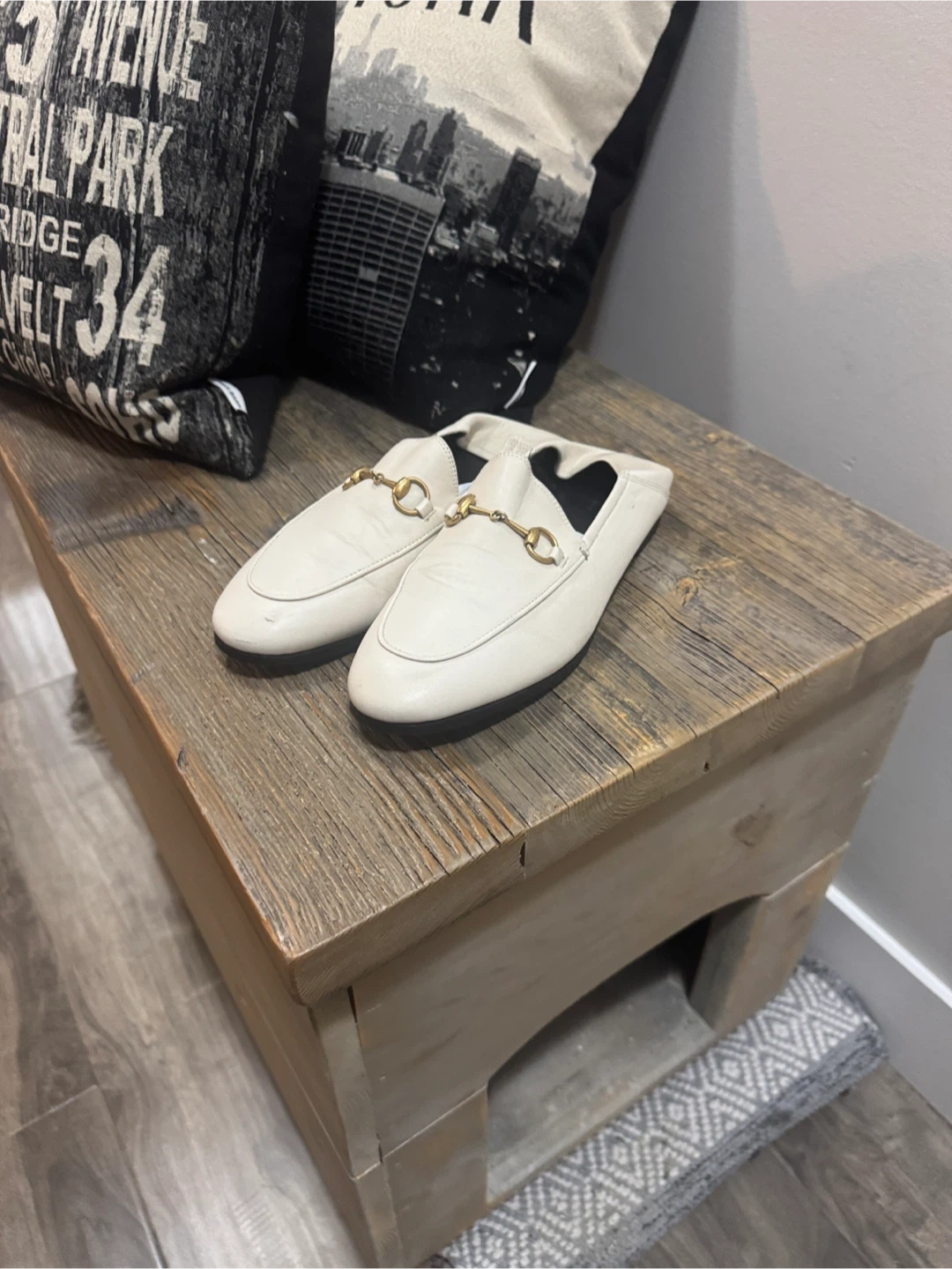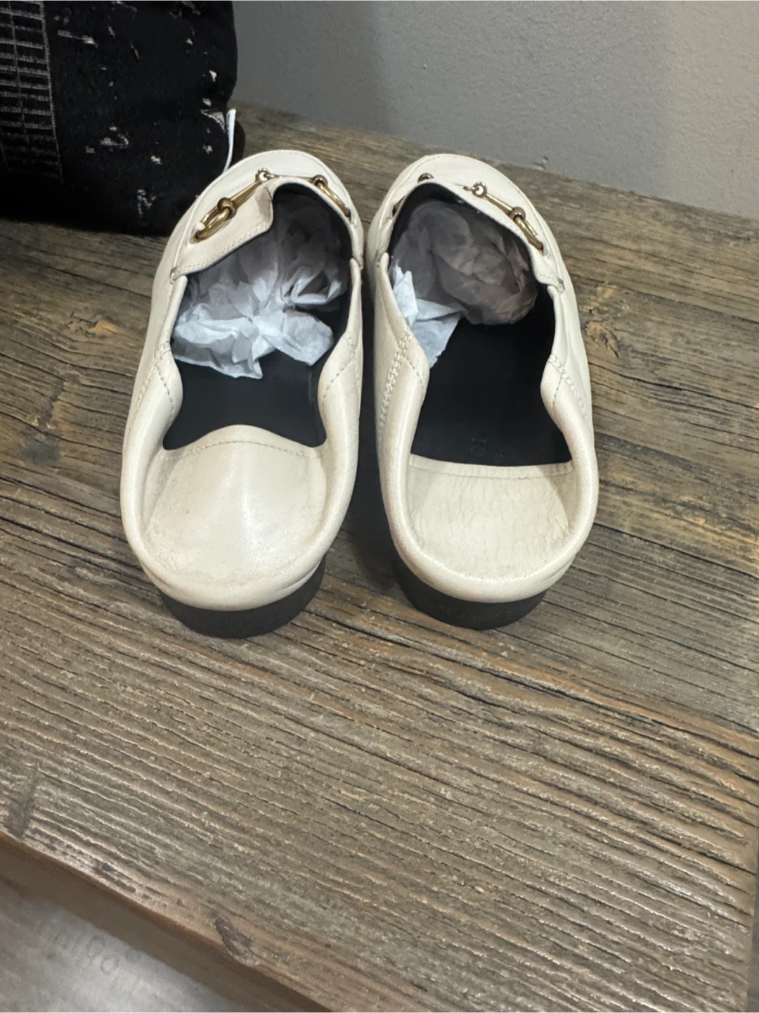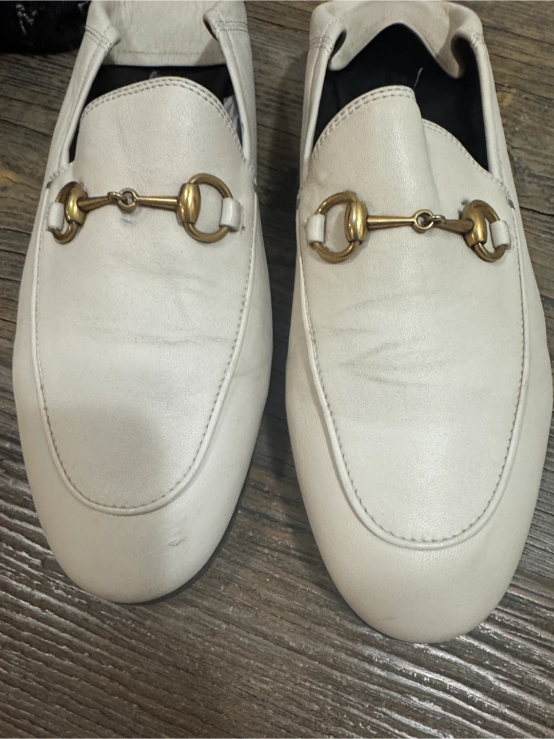 Step out in style with these sleek womens white loafers, featuring a sophisticated gold accent. Perfect for any occasion. As is scuffs to toes from wear & creasing. No box or dust bag. Can provide alternative 1 dustbag