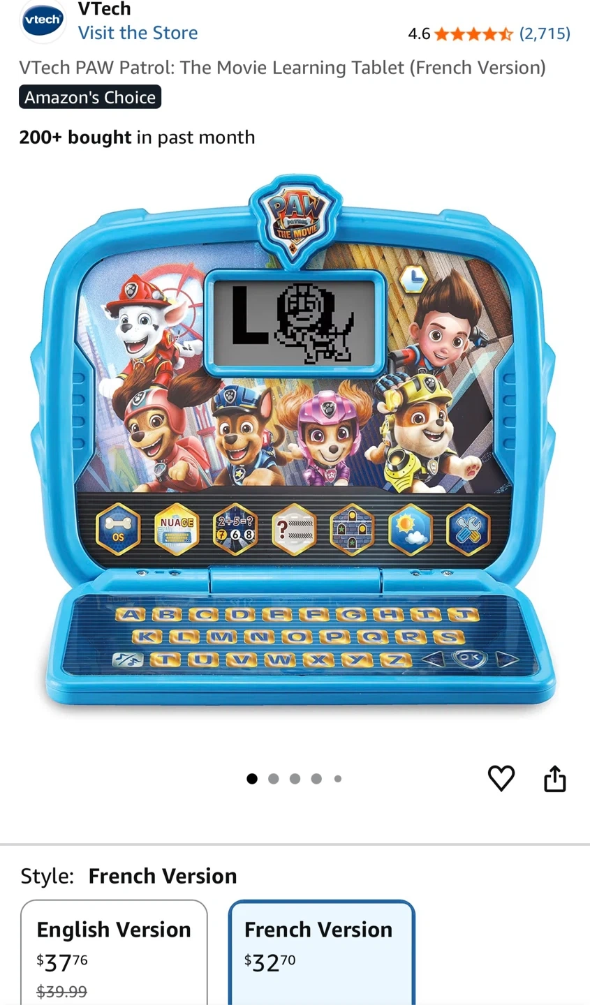 Selling a VTech PAW Patrol: The Movie Learning Tablet in French! Perfect for kids aged 3-6 who love Paw Patrol and want to learn in a fun, interactive way. This tablet has 6 educational activities to discover letters, shapes, and more!