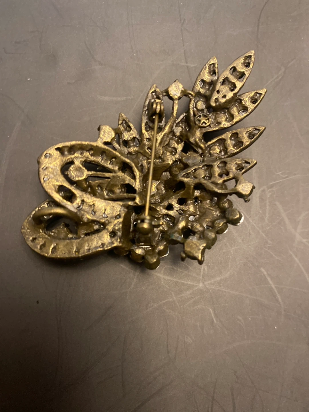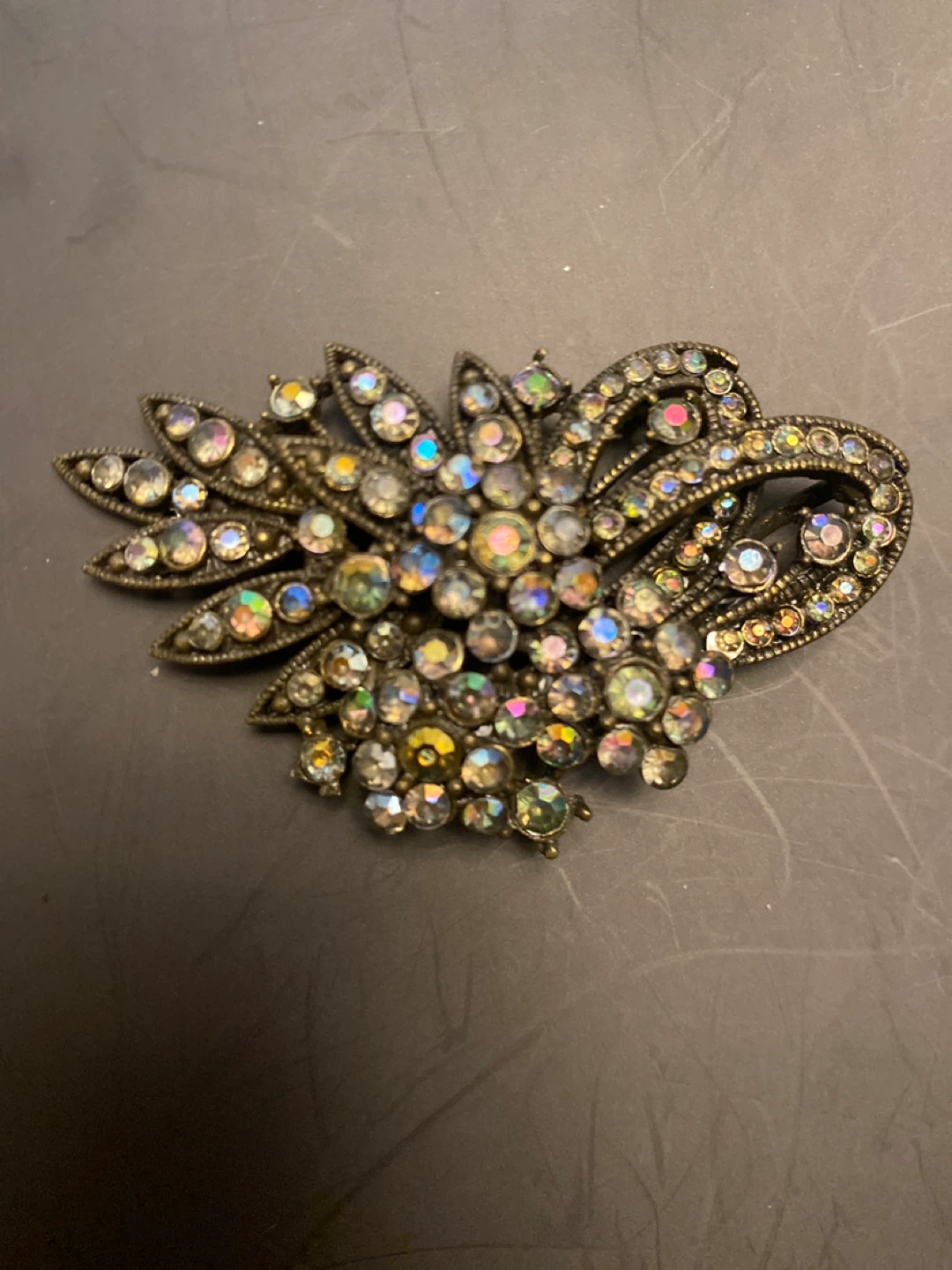 Selling a vintage brooch with lots of sparkling rhinestones! It's a beautiful piece that catches the light nicely. The metal has an antique gold tone. Great for adding a touch of vintage glamour to any outfit!