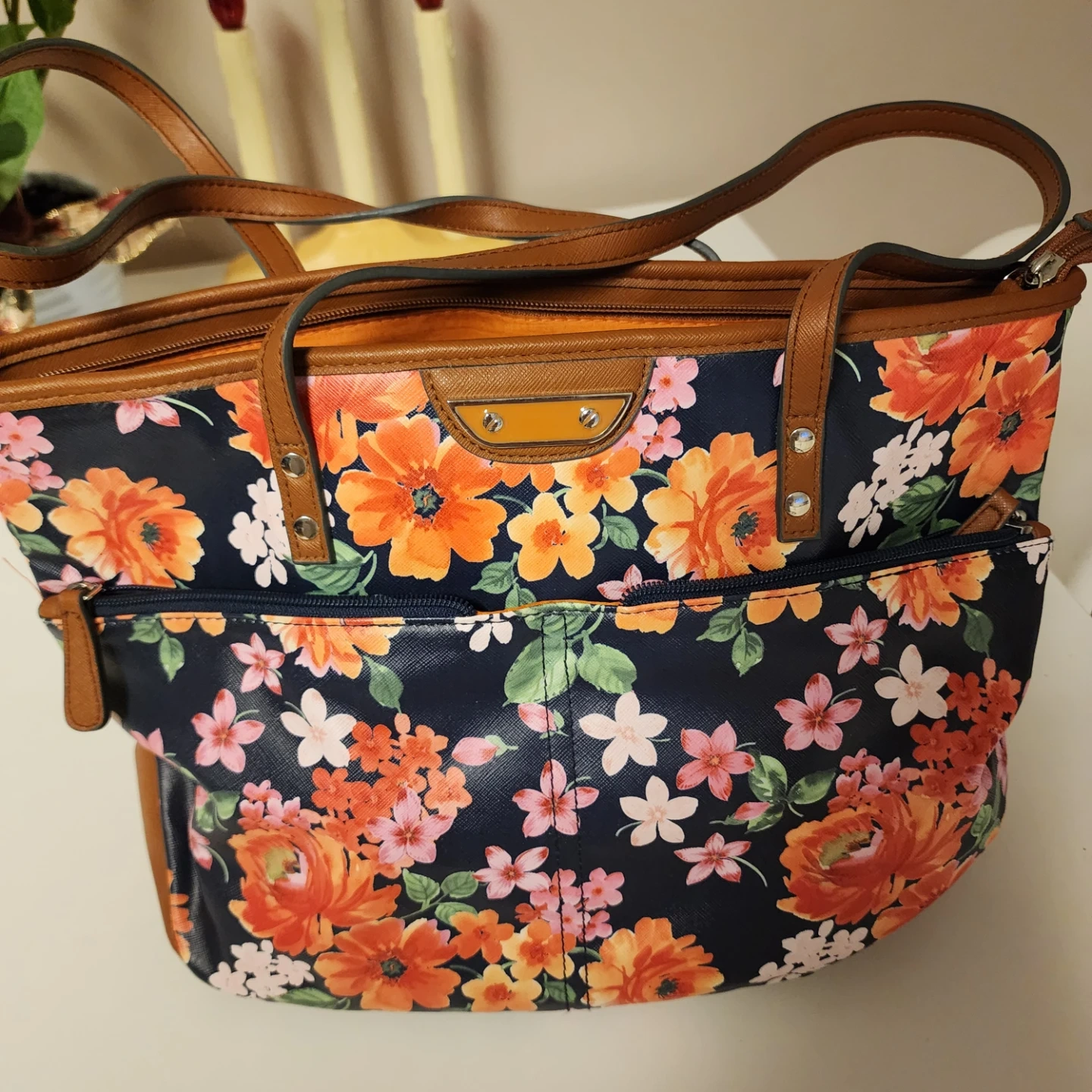 This Stone & Co. tote bag features a beautiful floral pattern on a dark blue background with brown trim. It has a zippered pocket on the front and is in great condition!