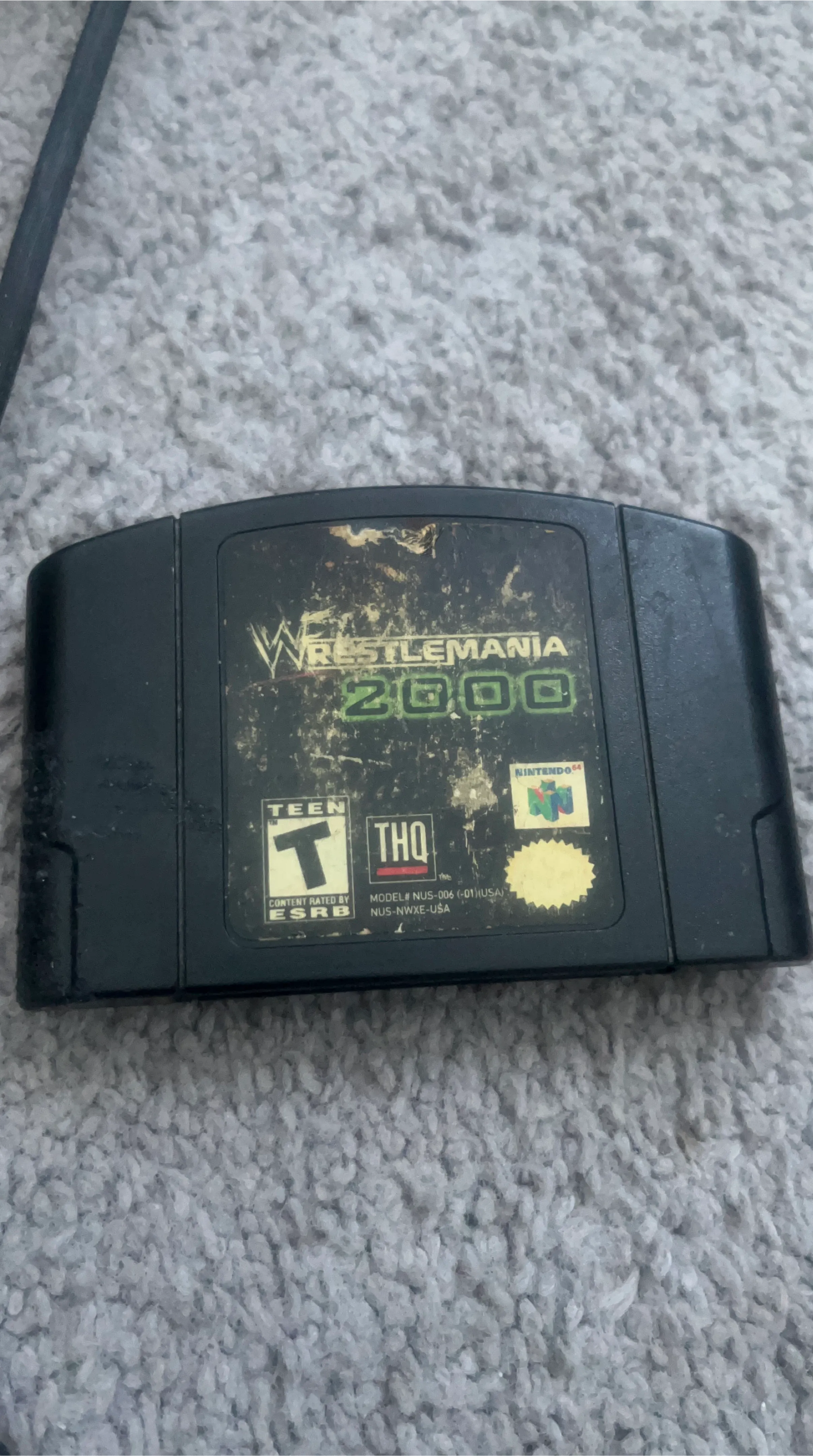 Selling a used Wrestlemania 2000 game for the Nintendo 64. Rated Teen by the ESRB. Model number NUS-006 (-01)(USA).