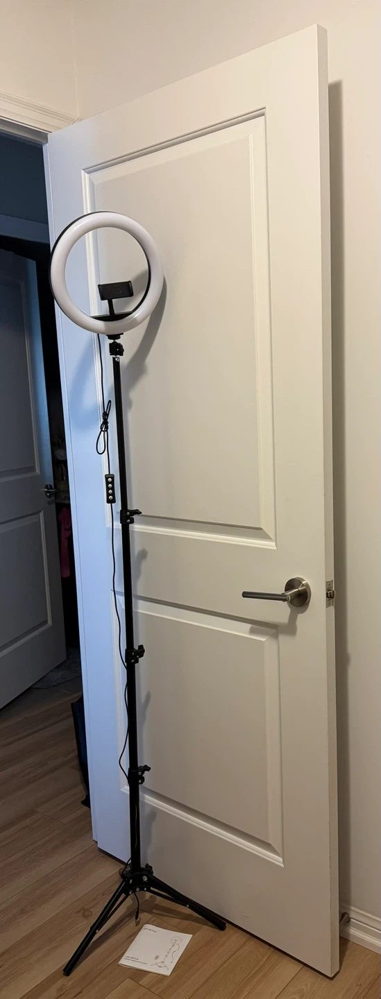 Selling a 4-setting LED ring light with a stand and cellphone holder. It's in good condition (like new) and comes with the instructions. Perfect for video calls or taking photos!