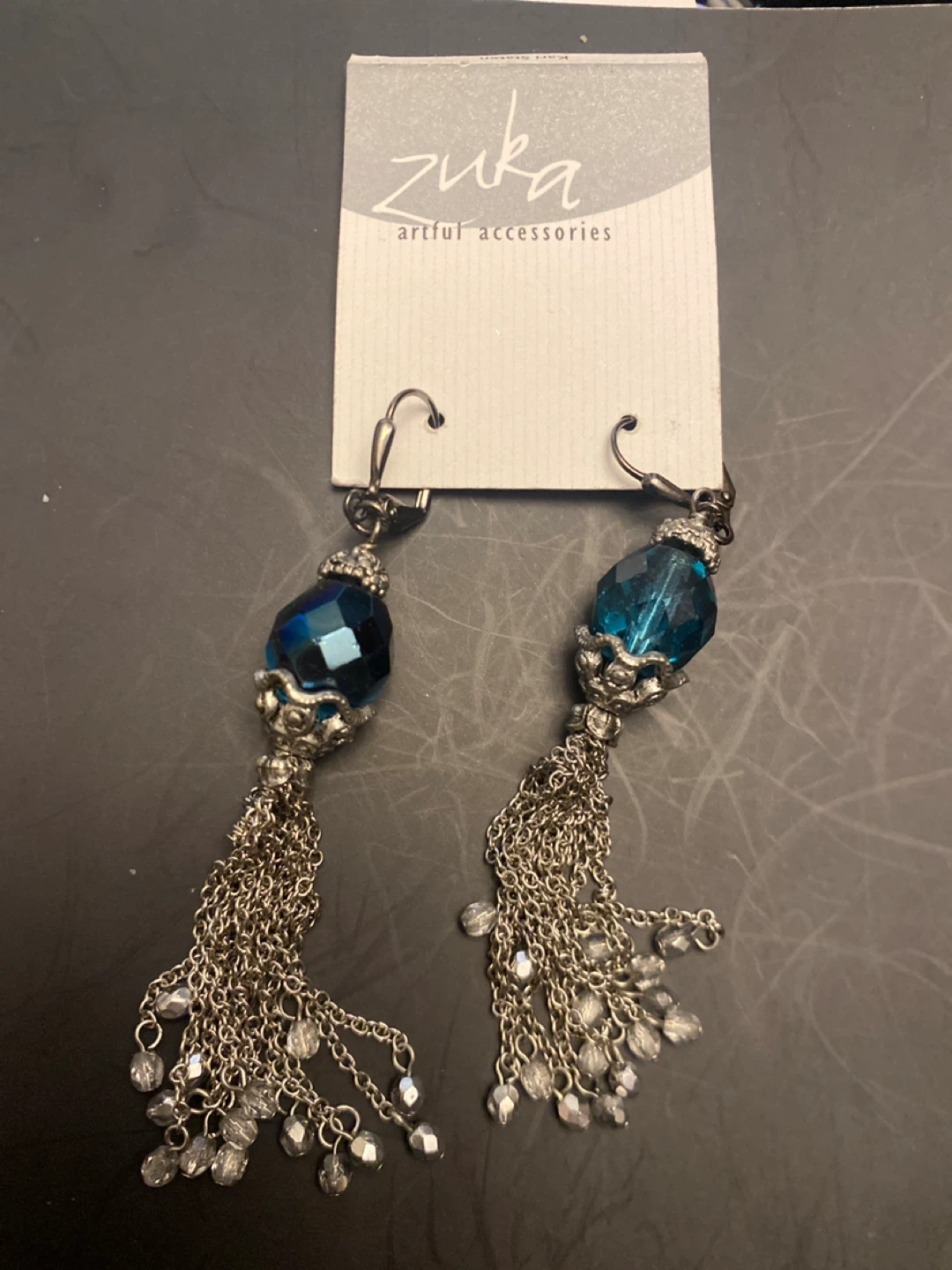 These are a pair of Zuka Artful Accessories earrings! They feature a beautiful blue faceted bead with a silver-tone chain tassel. Perfect for adding a touch of elegance to any outfit