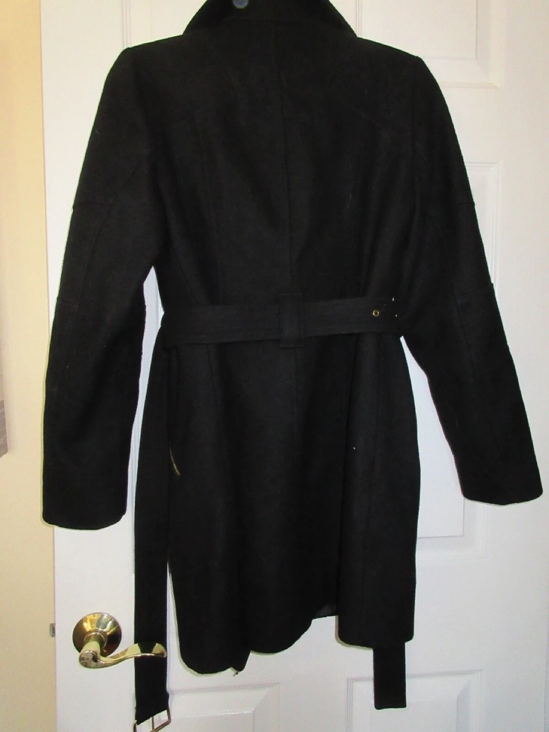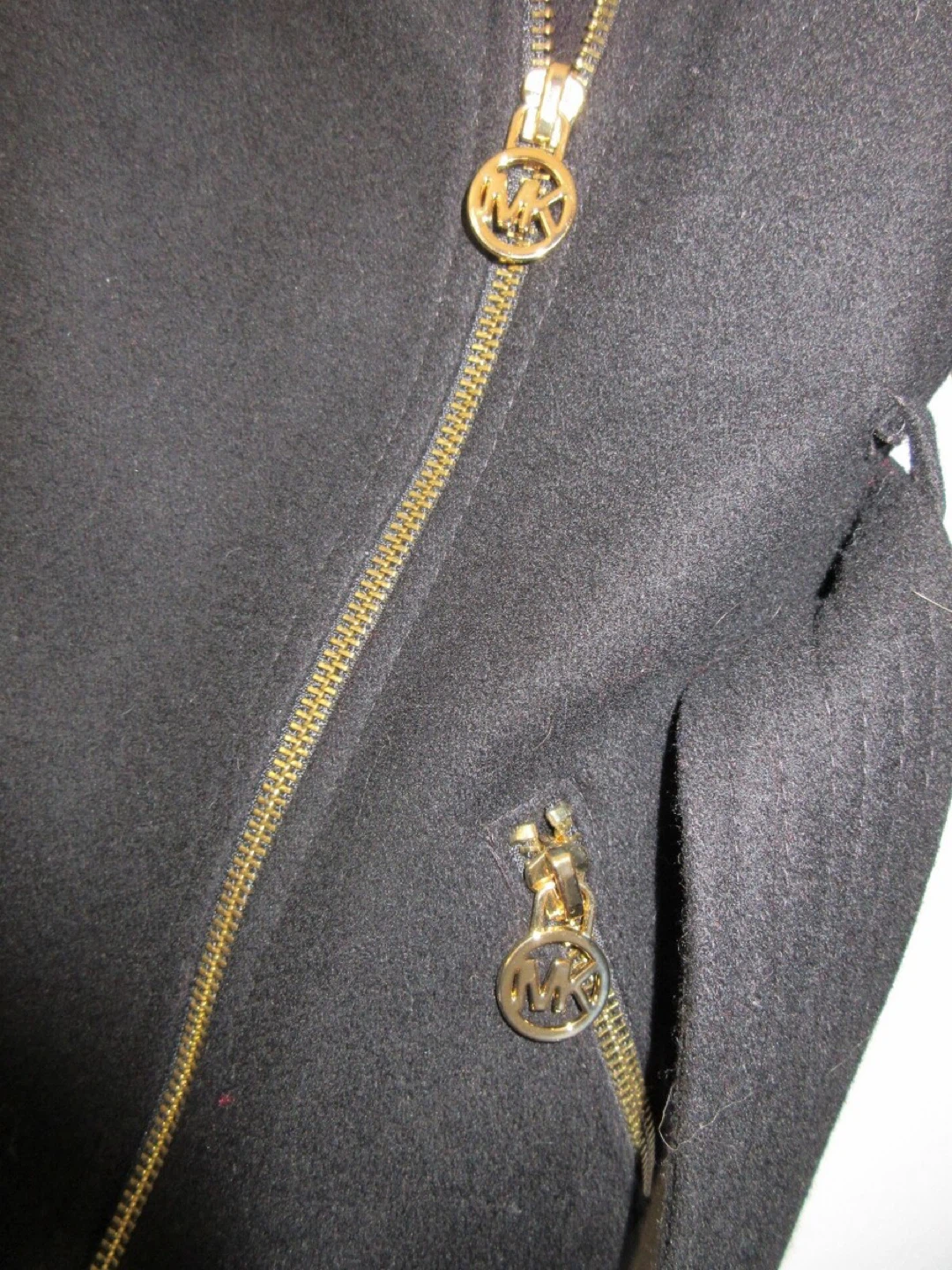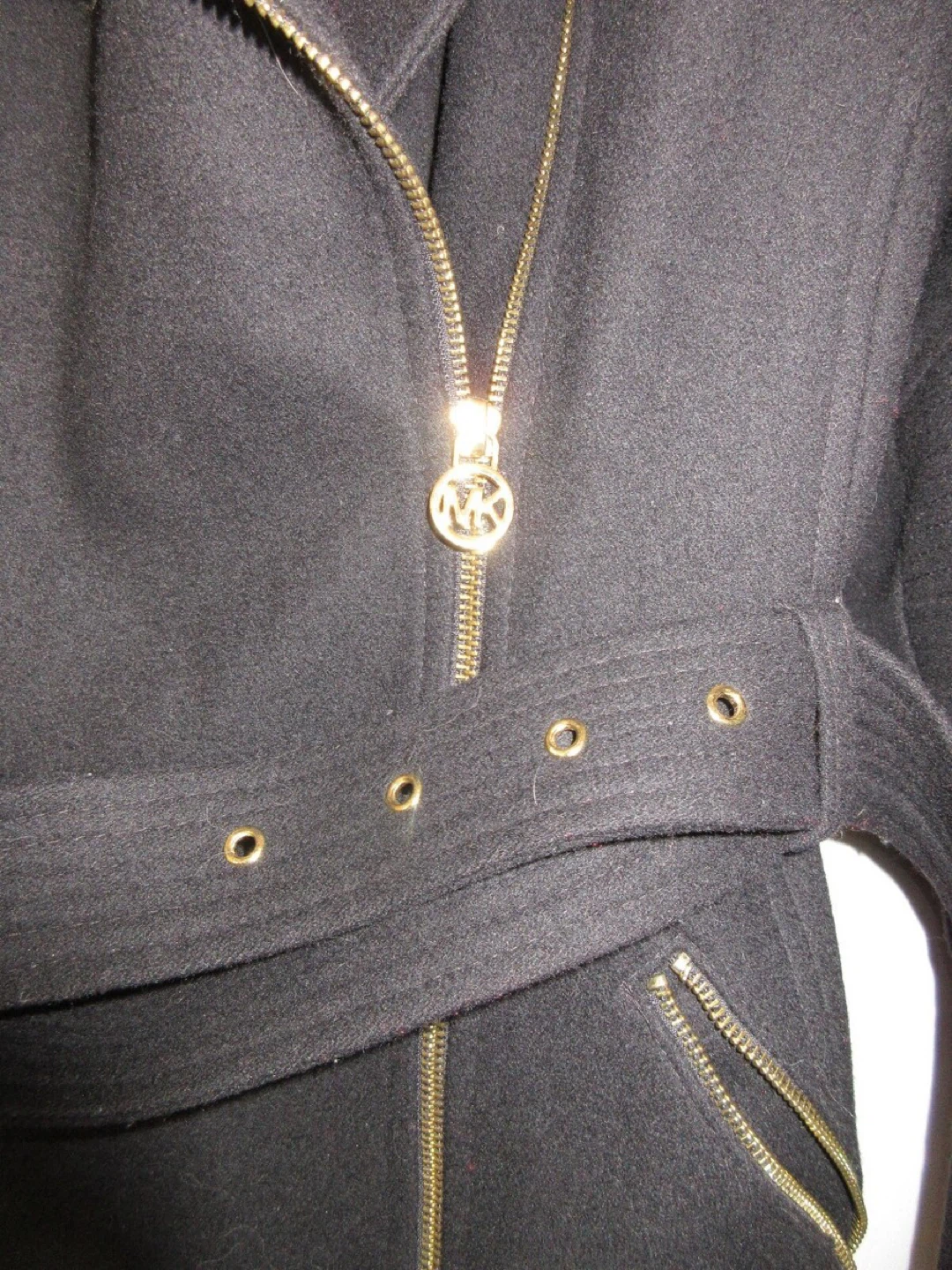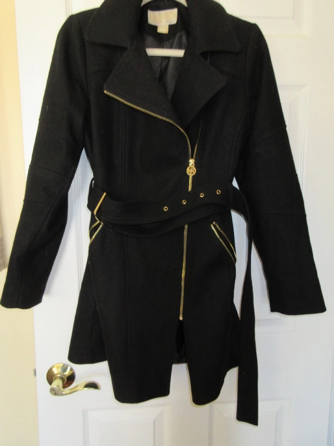 Selling a stylish black belted coat from Michael Kors! It features gold zippers and a flattering silhouette. Perfect for adding a touch of elegance to your wardrobe. Wool material, size medium