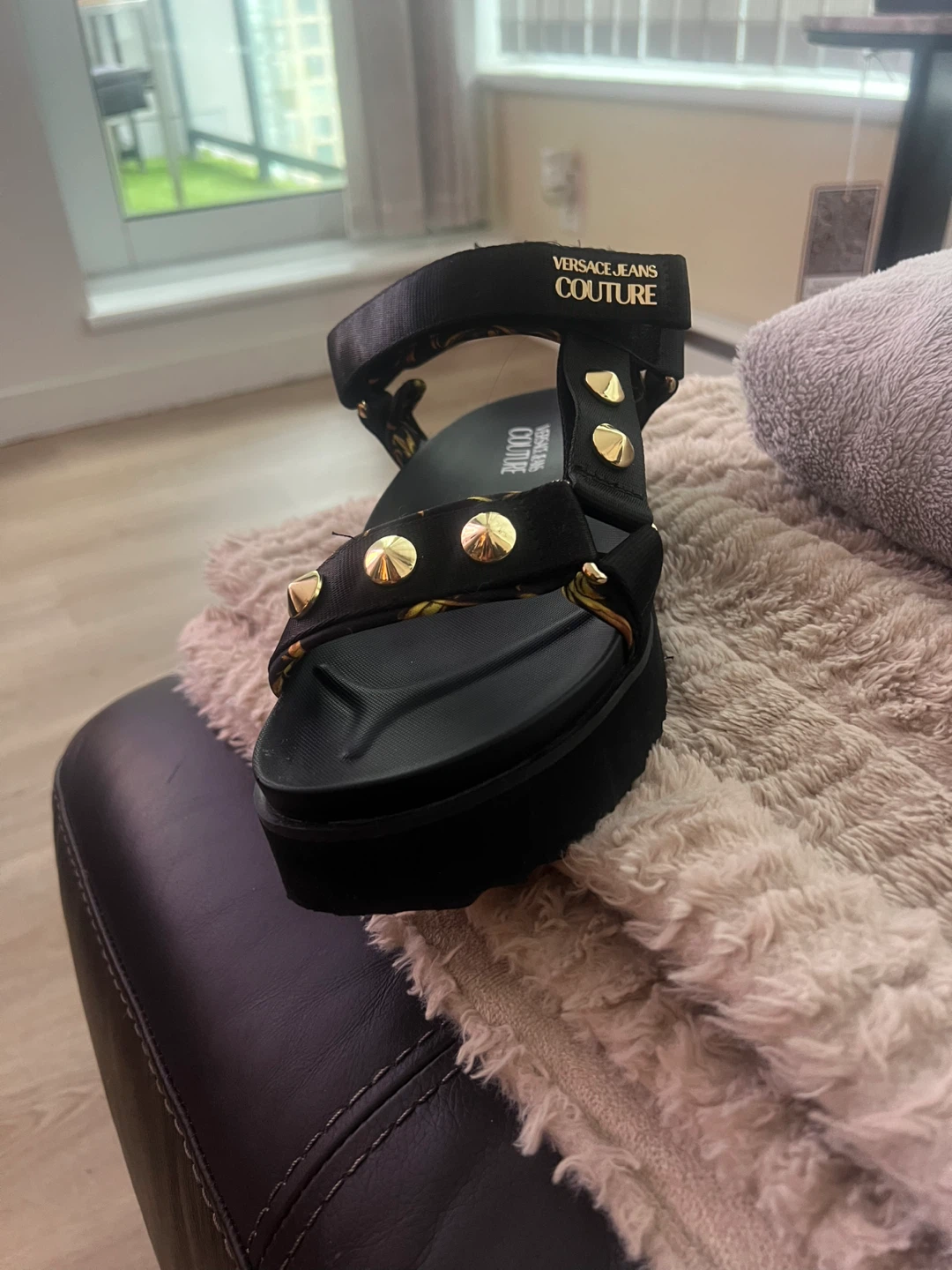 Selling a pair of Versace Jeans Couture sandals in size US 8.5. They feature a black colour with gold stud detailing. Perfect for adding a bit of edge to your summer outfits!