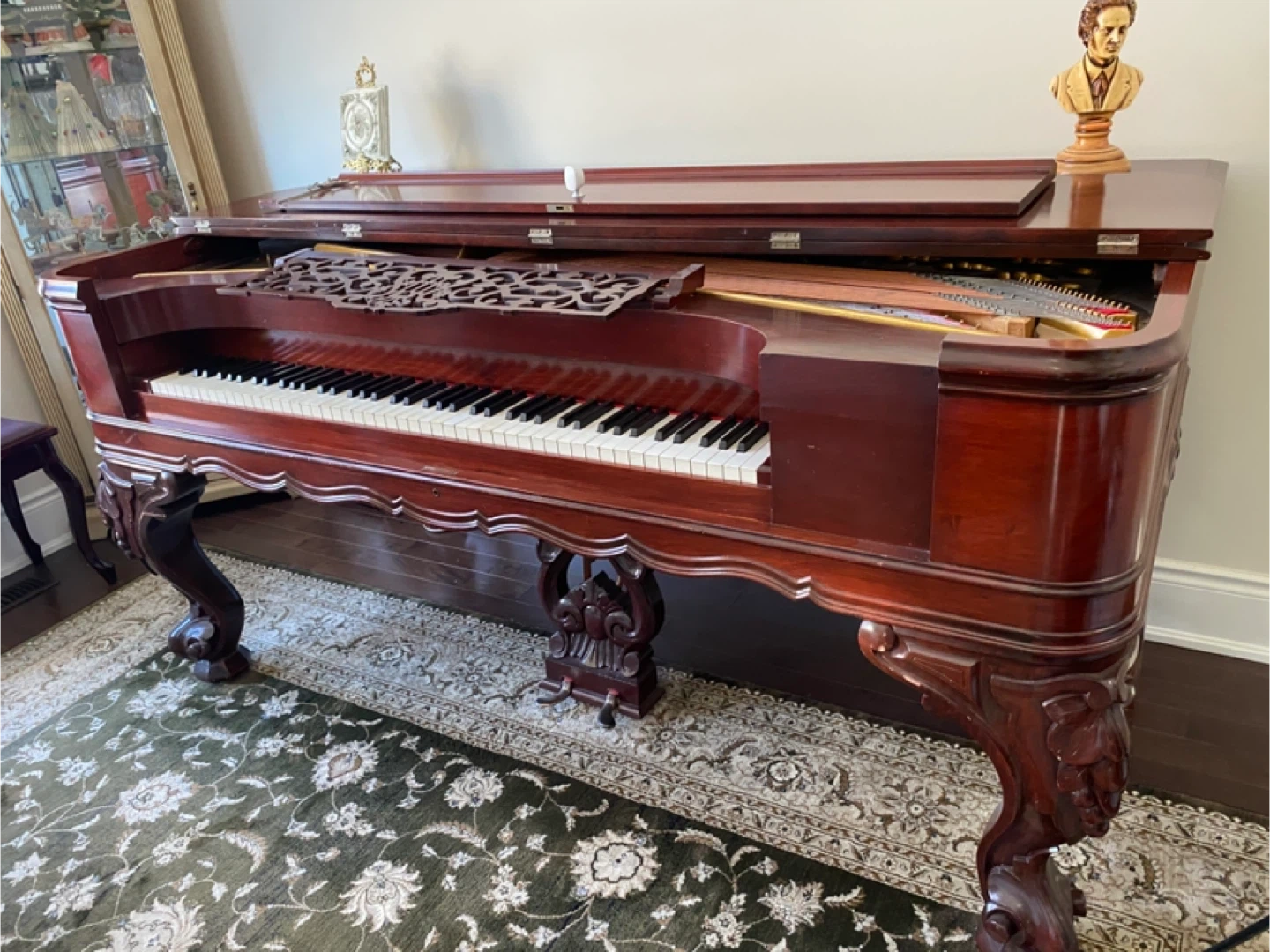 Selling an antique upright piano. It's a beautiful piece of furniture with ornate legs and a dark wood finish. It would make a great addition to any home!