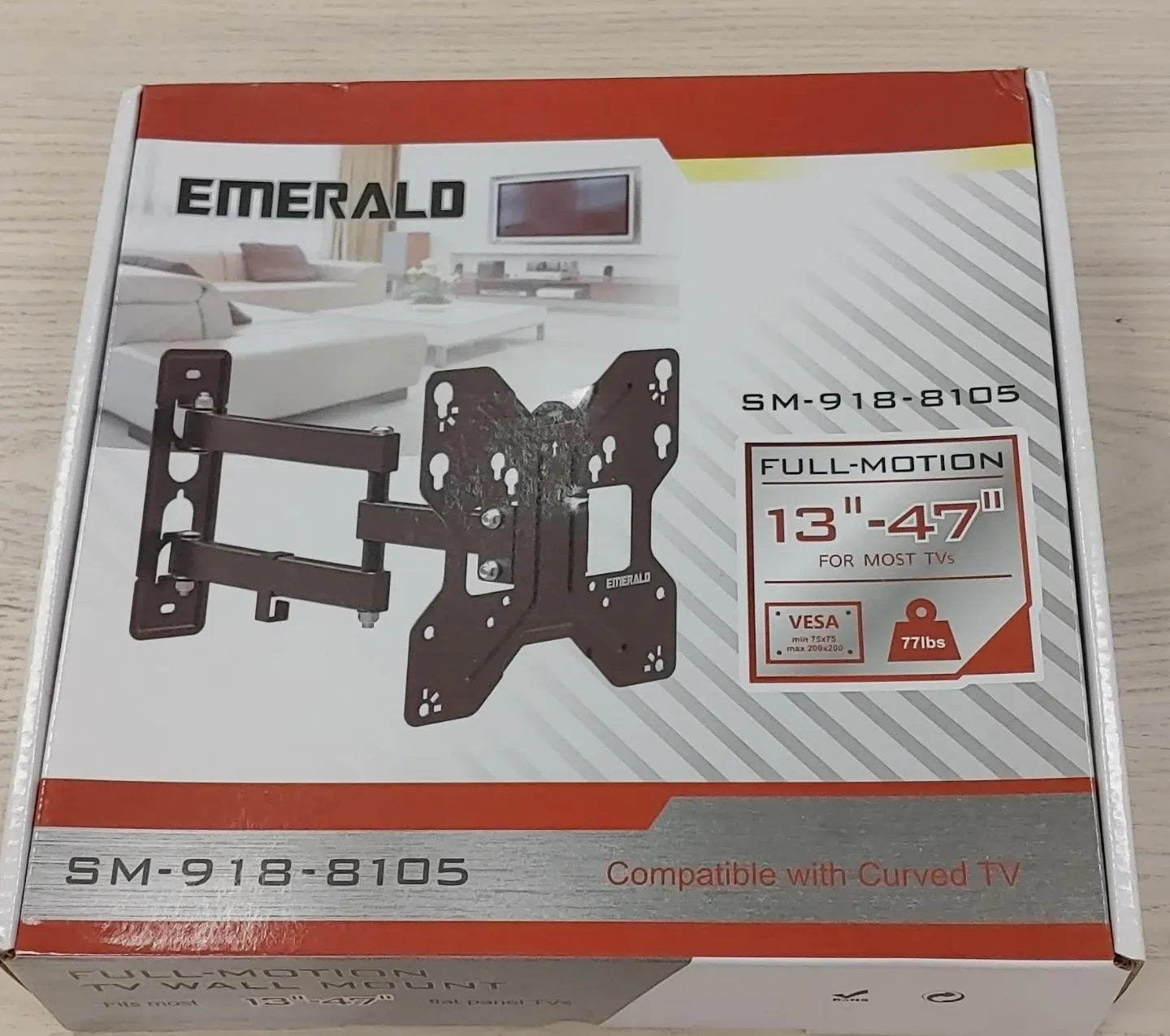 Selling an Emerald full-motion TV wall mount, model SM-918-8105. It's designed for most TVs ranging from 13" to 47". It's compatible with curved TVs and supports VESA patterns from min 75x75 to max 200x200. The mount can hold up to 77lbs. Box included