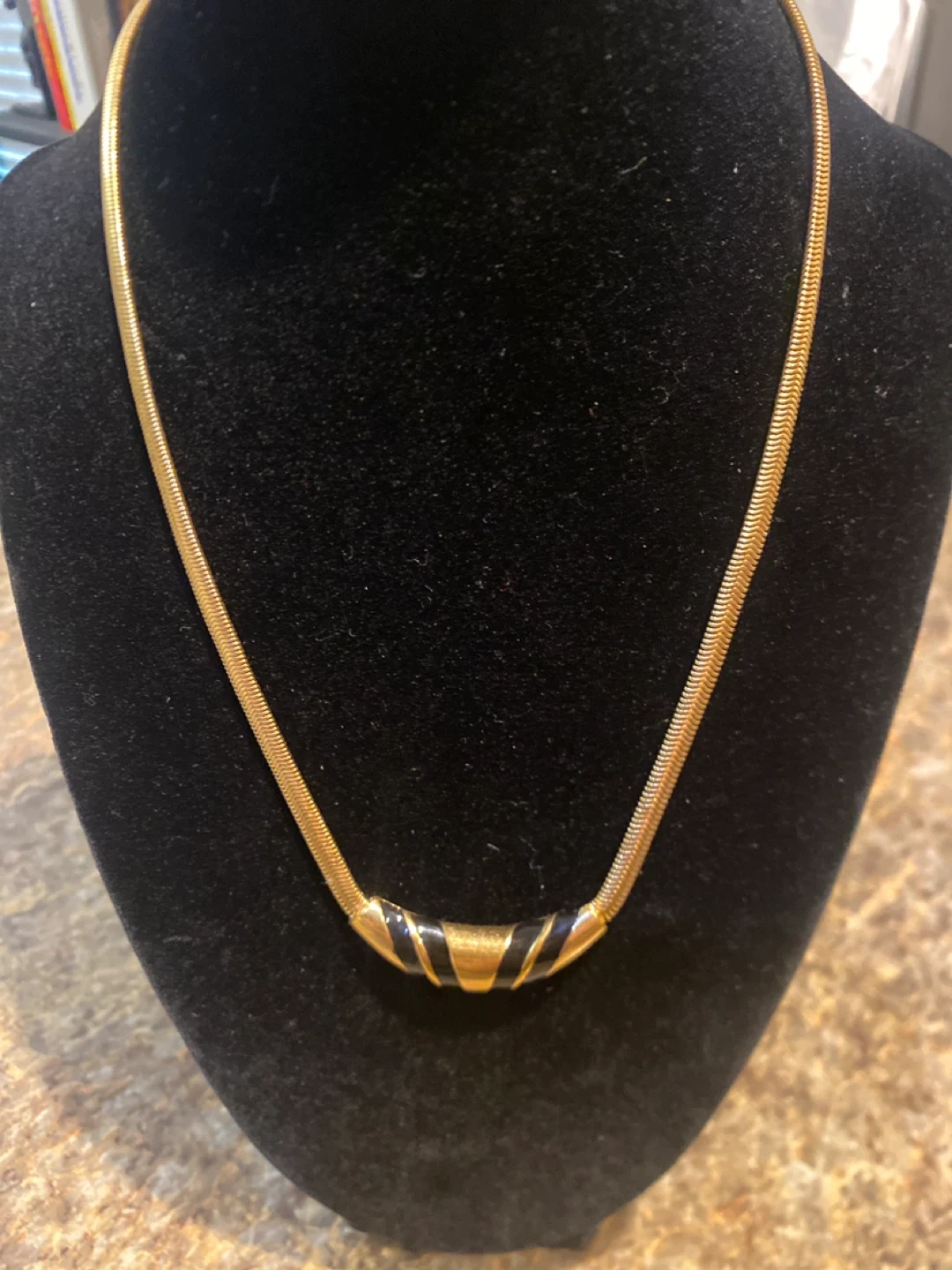 A beautiful gold-tone necklace with a black accent piece. This necklace is in great condition and would be a lovely addition to any jewelry collection!