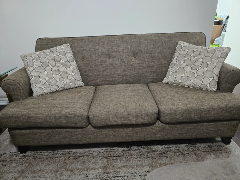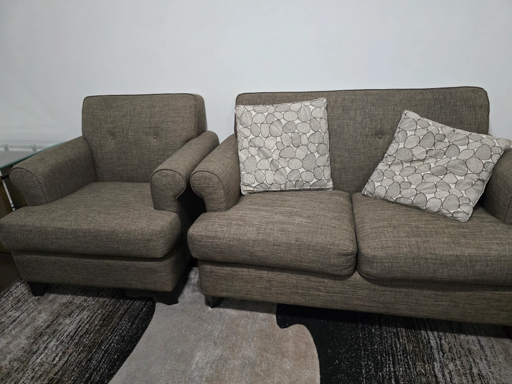 Selling a comfy sofa and loveseat set. The set is in a neutral colour that would fit well with any decor. It's in good condition, and the fabric is durable, machine washable!. Perfect for a living room. Brand is Decor-rest.