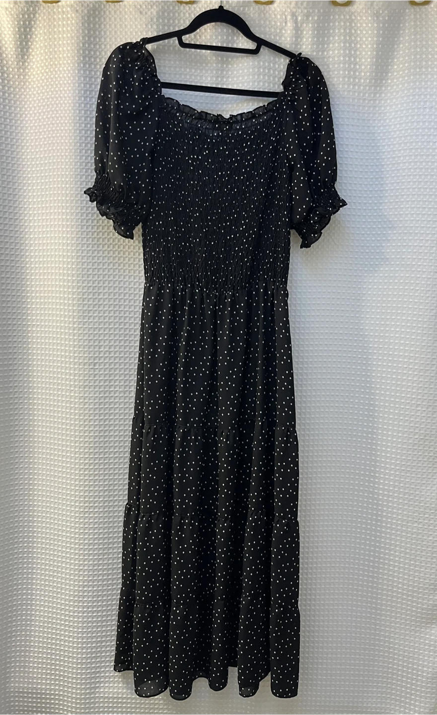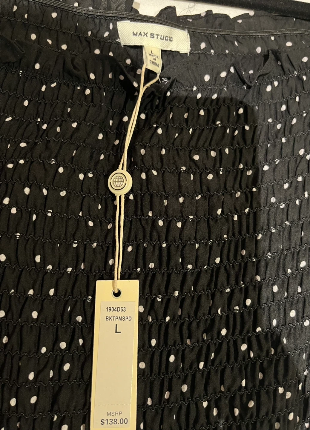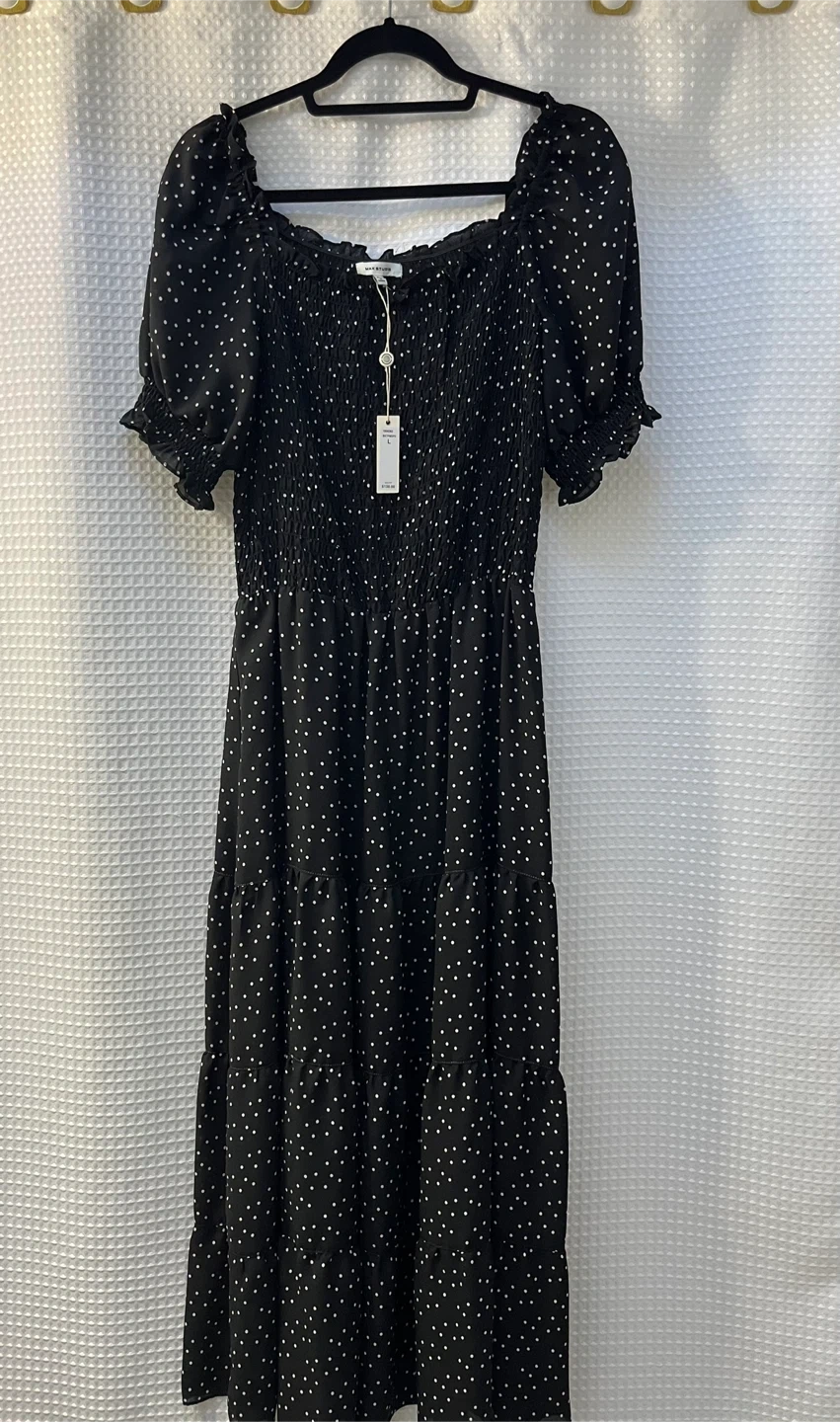Brand new with tags, Max Studio dress in a size large. It's a black dress with white polka dots. Has smocking in the front and back. Polka dots are in this year!!