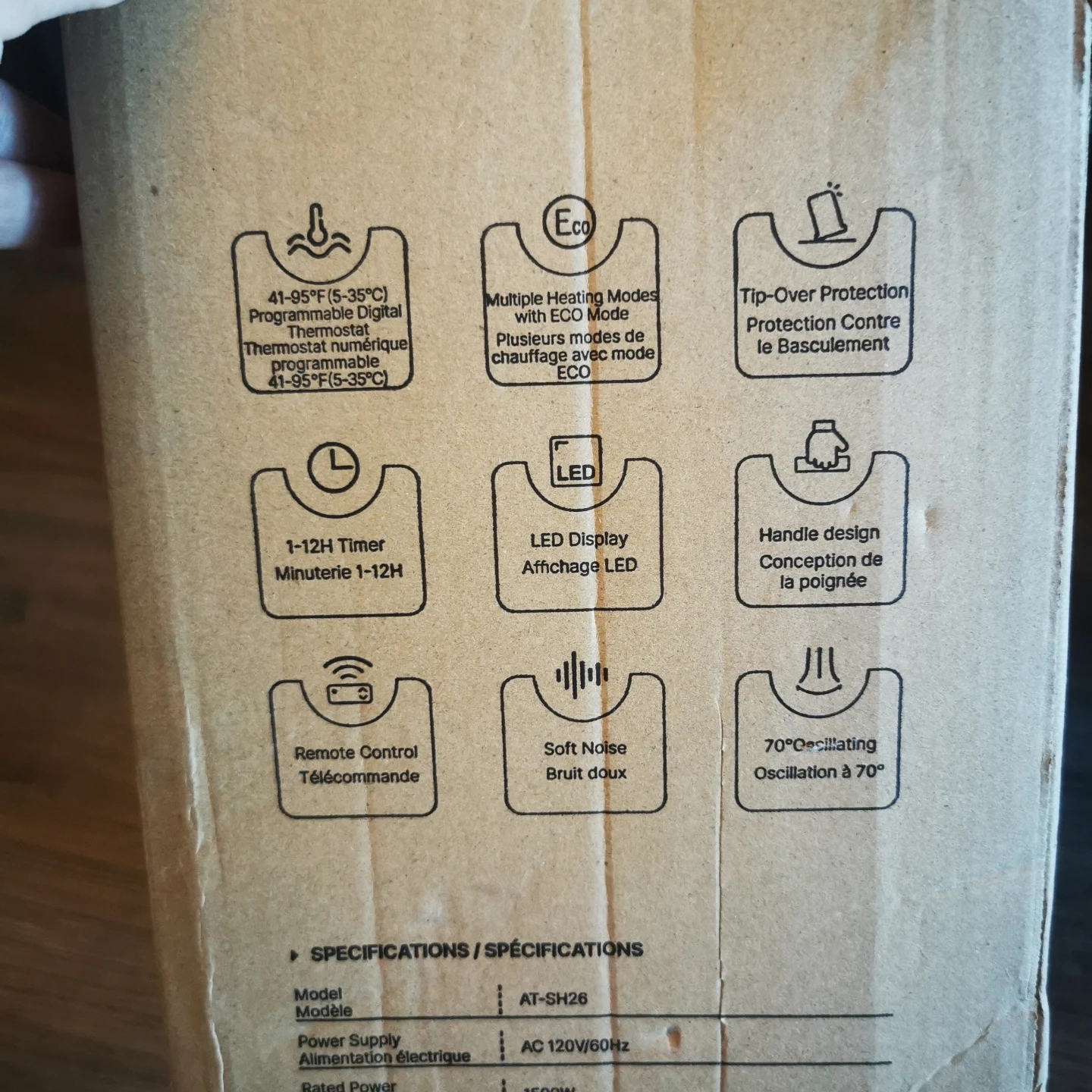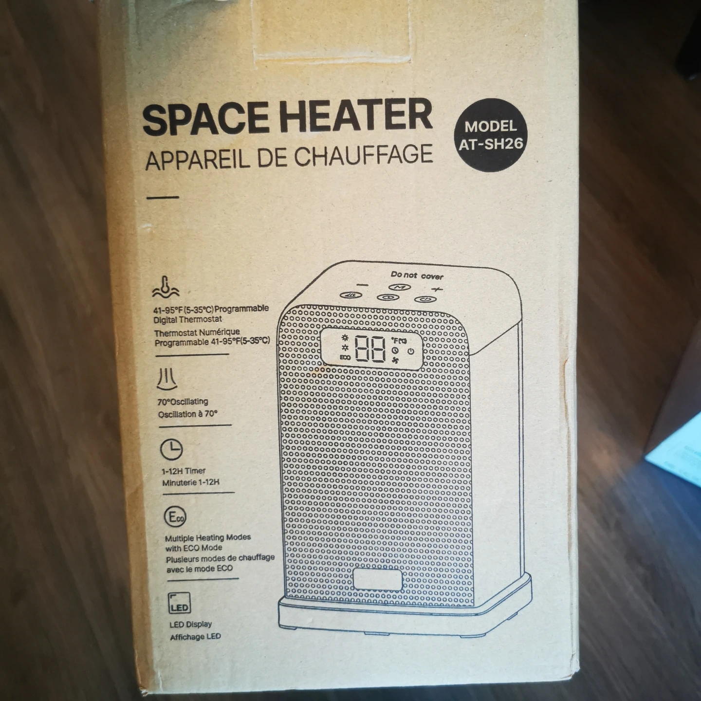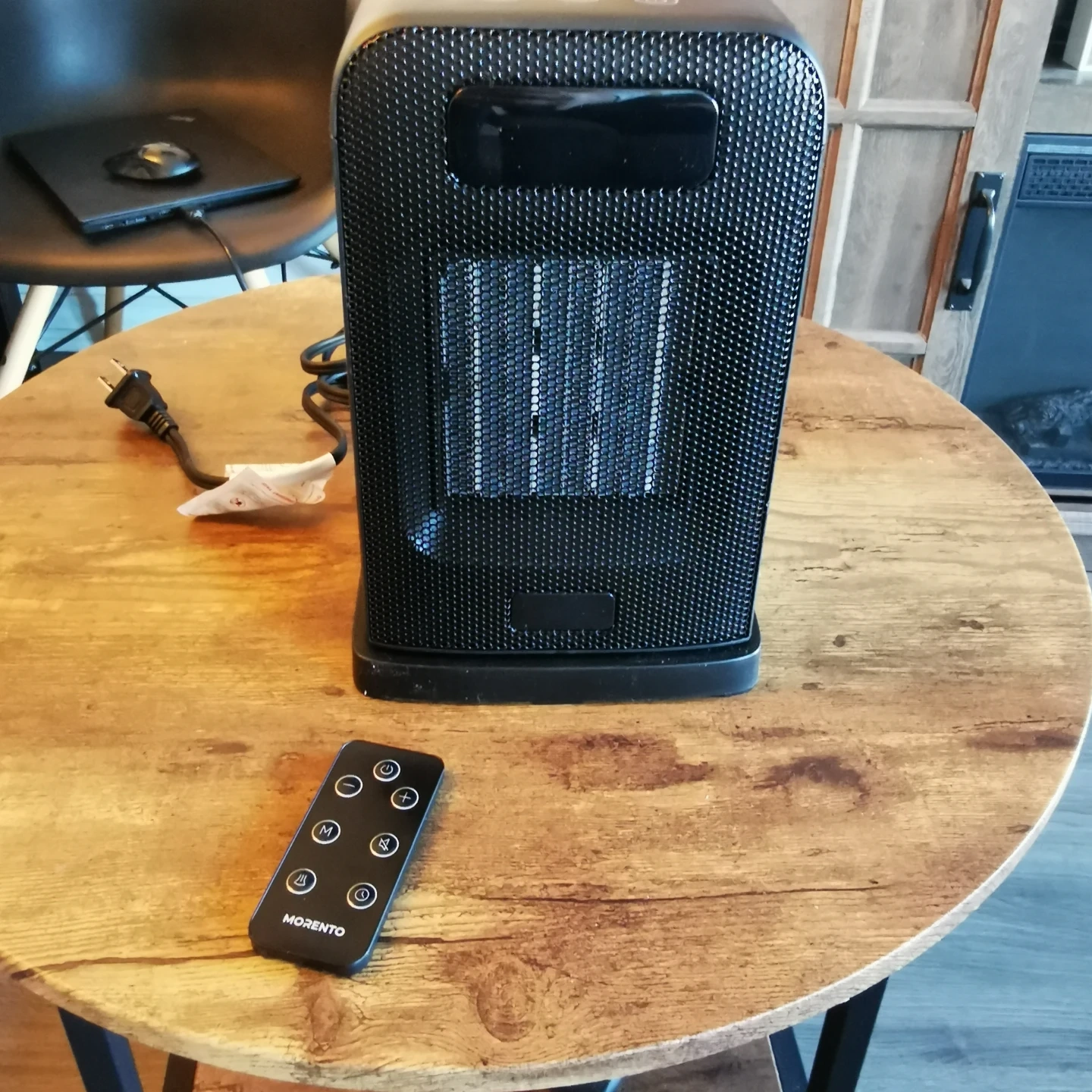 Selling a Morento space heater in great condition! It comes with a remote control. The box shows it has multiple heating modes with ECO mode, tip-over protection, 1-12H timer, LED display, soft noise, and 70° oscillating oscillation. Model number AT-SH26