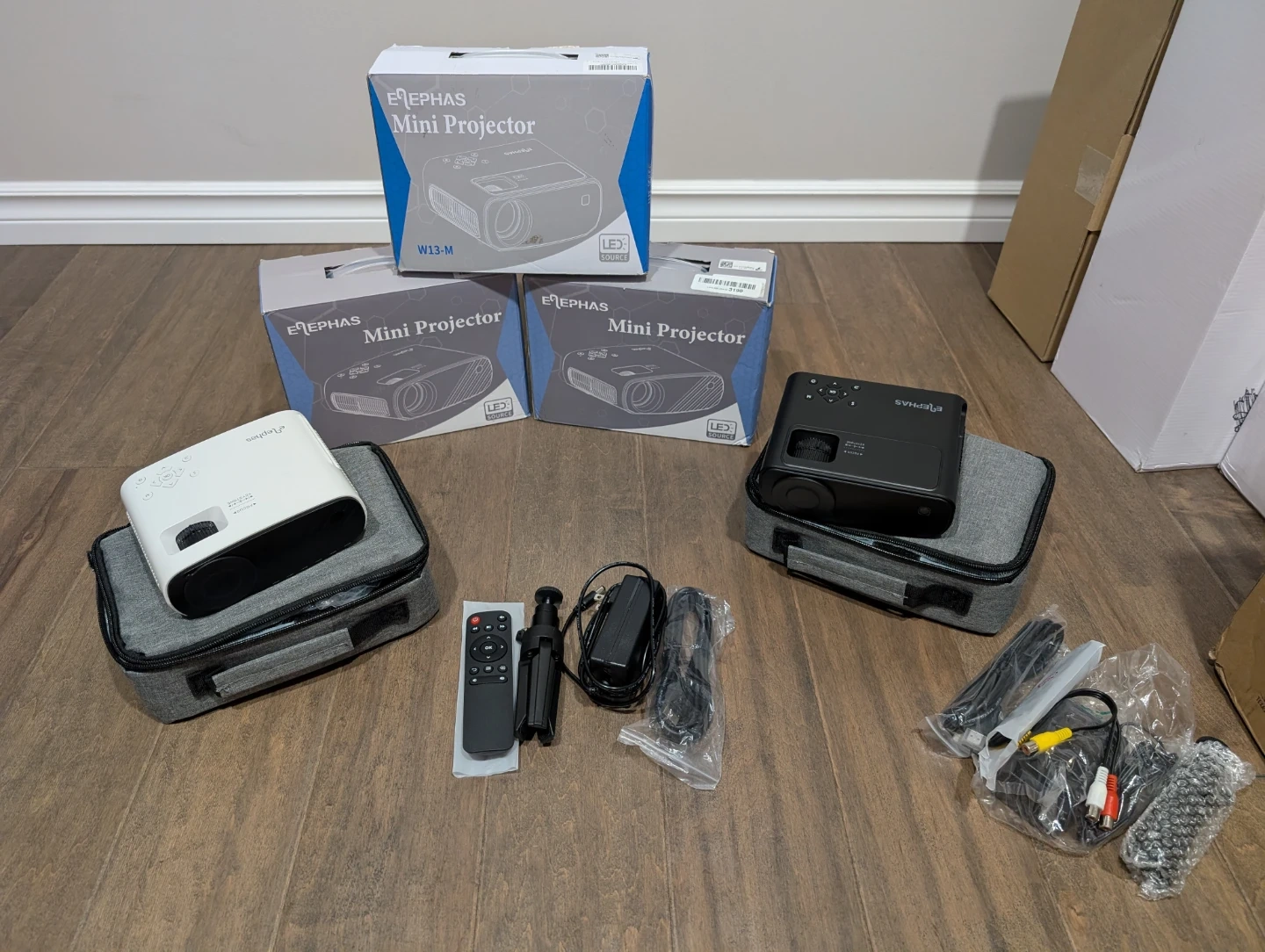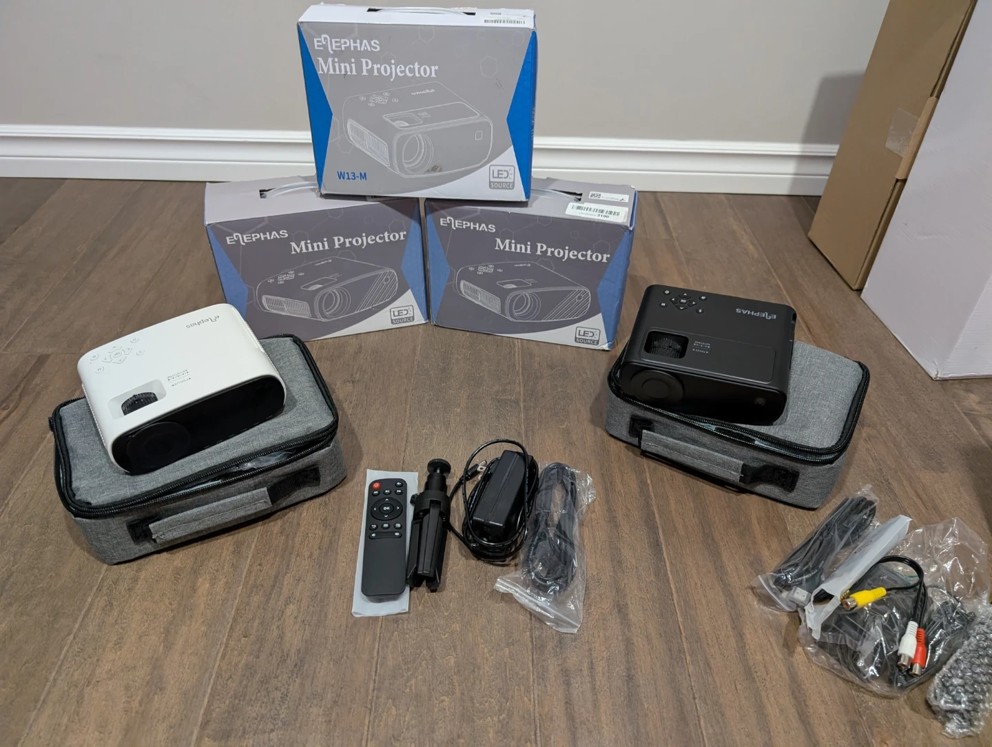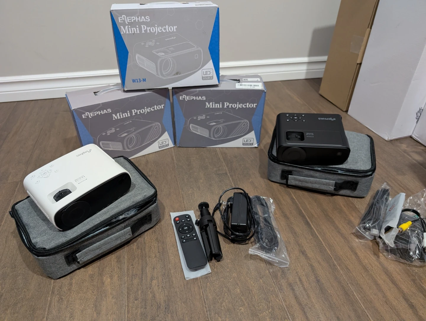 Brand new Elephas LED mini projectors for sale. Full HD 1080p, HDMI, USB. Remote, mini tripod stand included, 8,000 lumens, 50% zoom, 30” up to 200” inch screen home theater, compatible with many devices, $50 FIRM each. Black one is $60 FIRM, it is 5G wifi.
