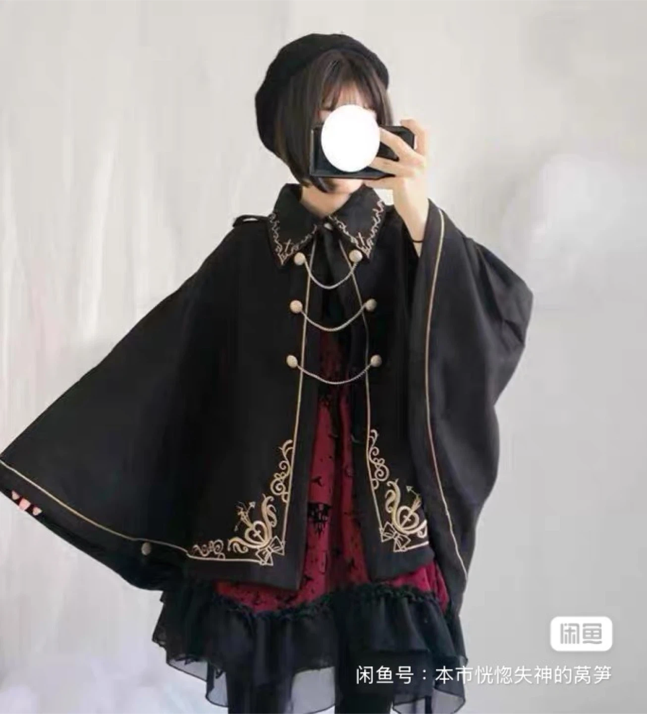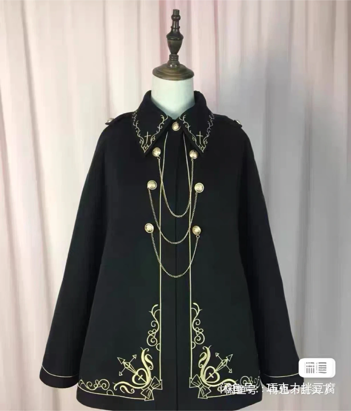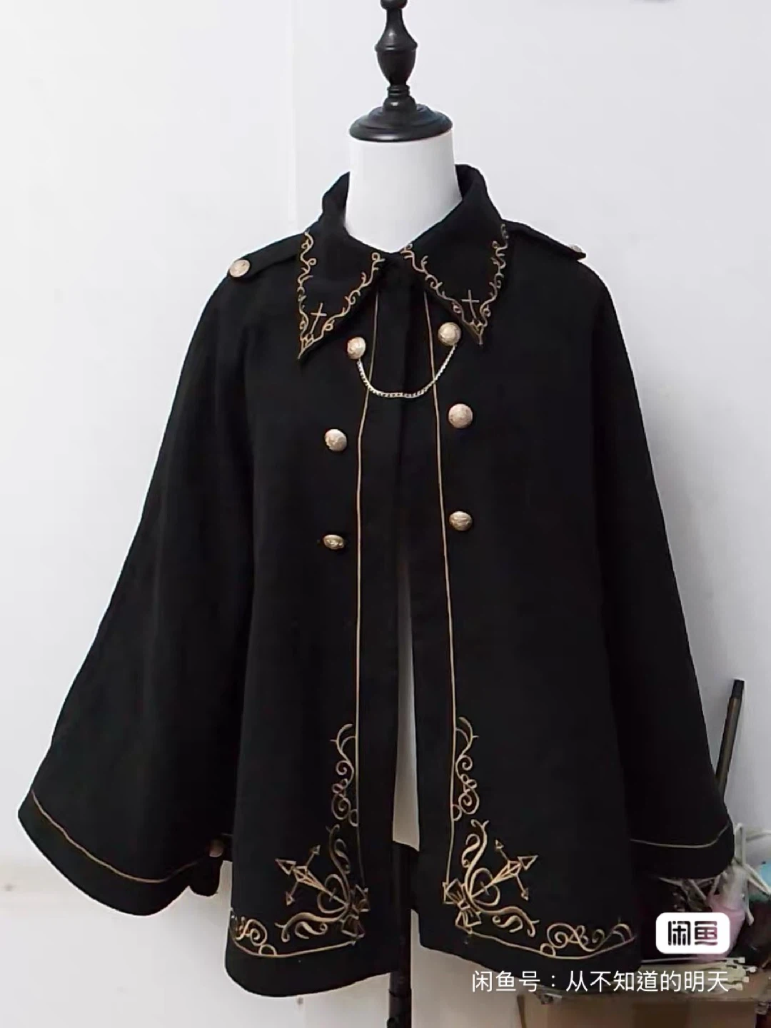 Selling a stylish black cape with elegant gold trim. This cape features a unique design with decorative gold accents and button details. It's perfect for adding a touch of sophistication to any outfit! The material feels comfortable and looks great.