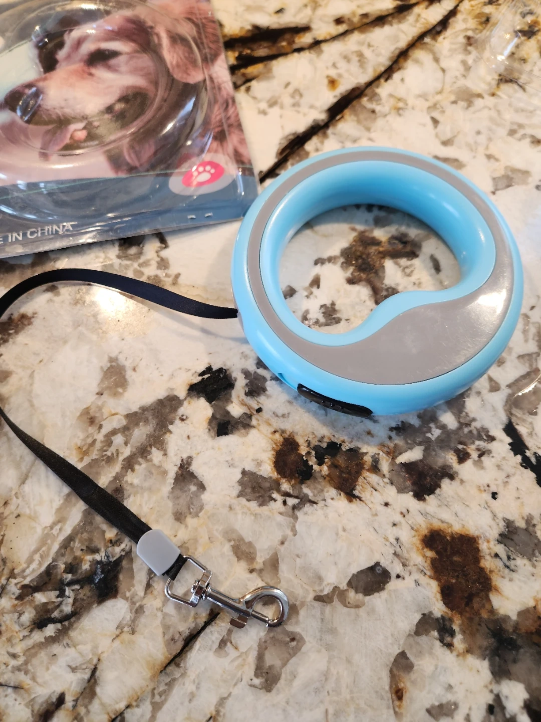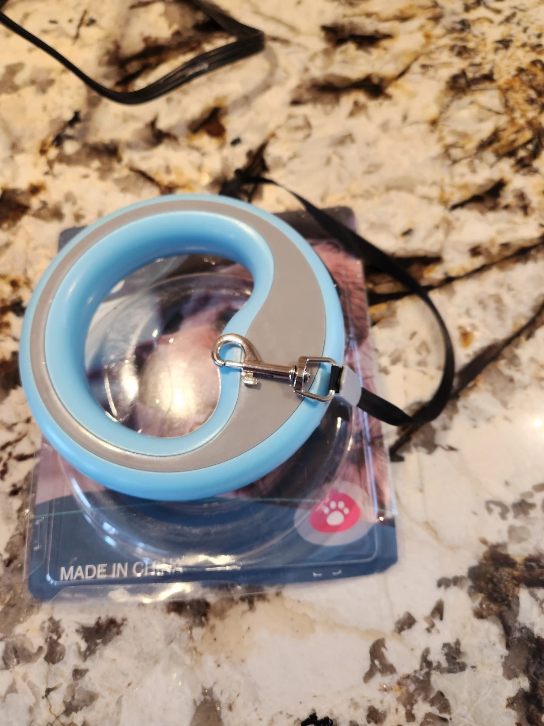 Selling a retractable dog leash ! It's in new condition and ready for your furry friend's adventures. The leash features a comfortable grip and a smooth retraction mechanism. The colours are a nice light blue and grey. Comes with the original packaging. Too bulky for my 4 lbs dogs.