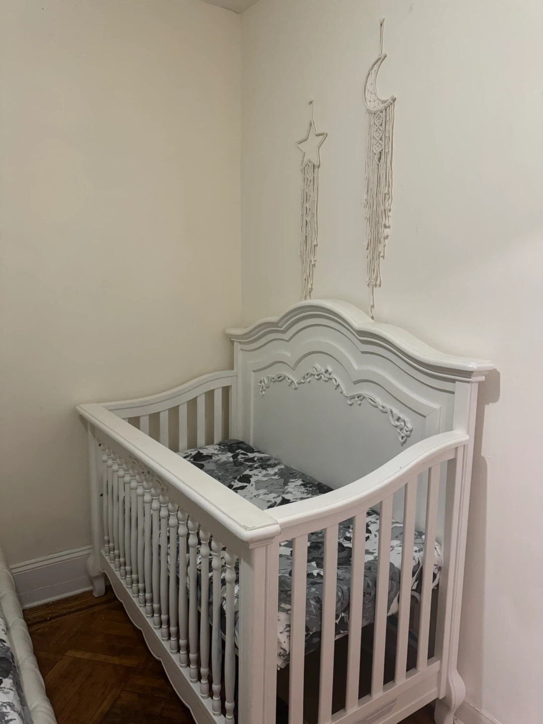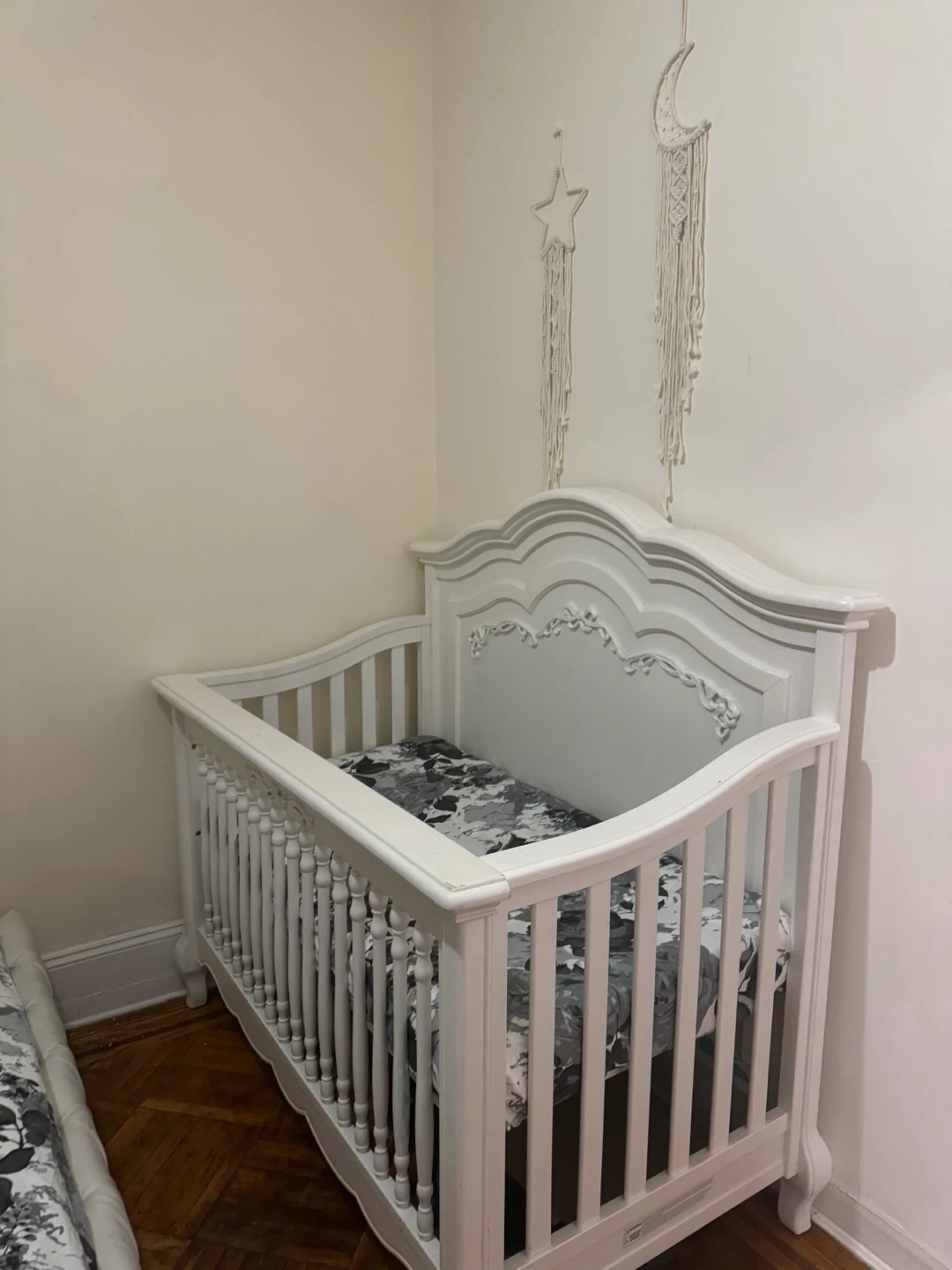 Selling a lovely white baby crib. It's in great condition and ready for a new little one. The crib features a classic design with ornate detailing on the headboard and footboard. Perfect for creating a cozy and stylish nursery!