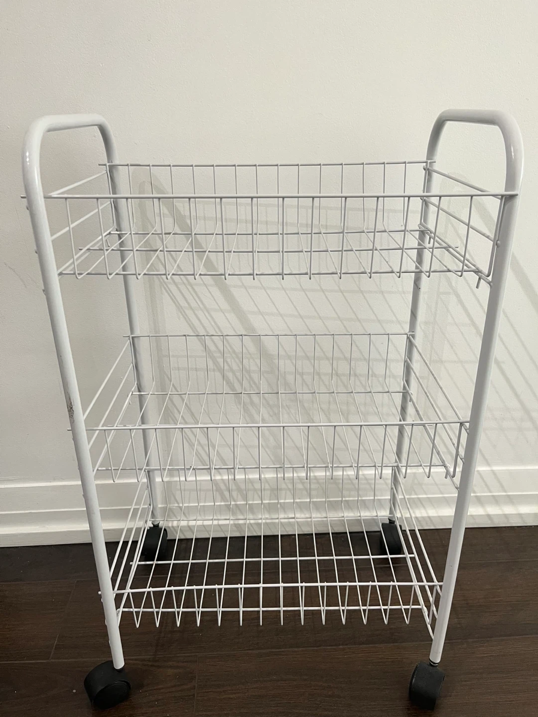 Here's a handy white 3-tier rolling cart! It's perfect for adding some extra storage to any room in your house. It is in good condition and ready to roll!
