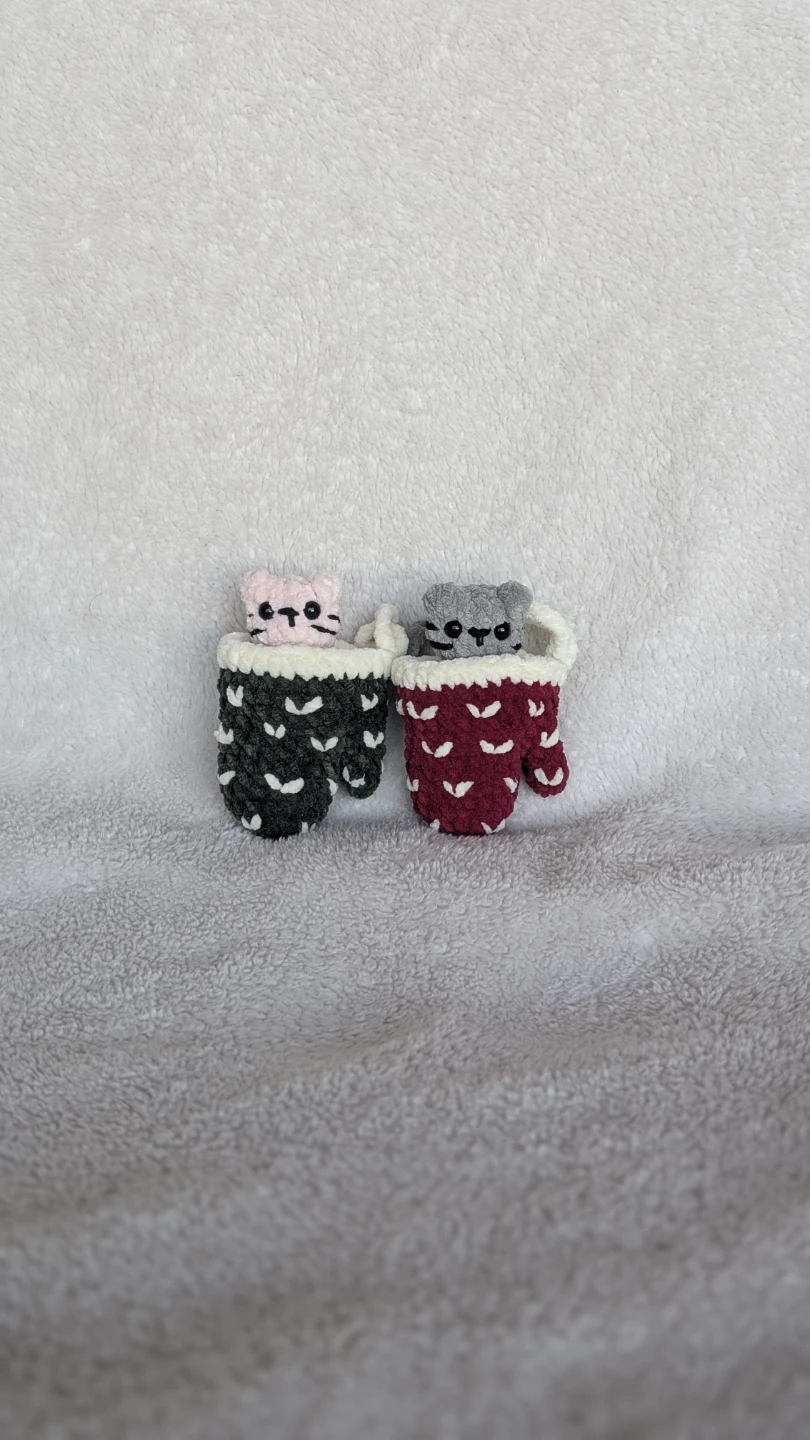 Choose between a grey cat in a red mitten or a pink cat in a green mitten