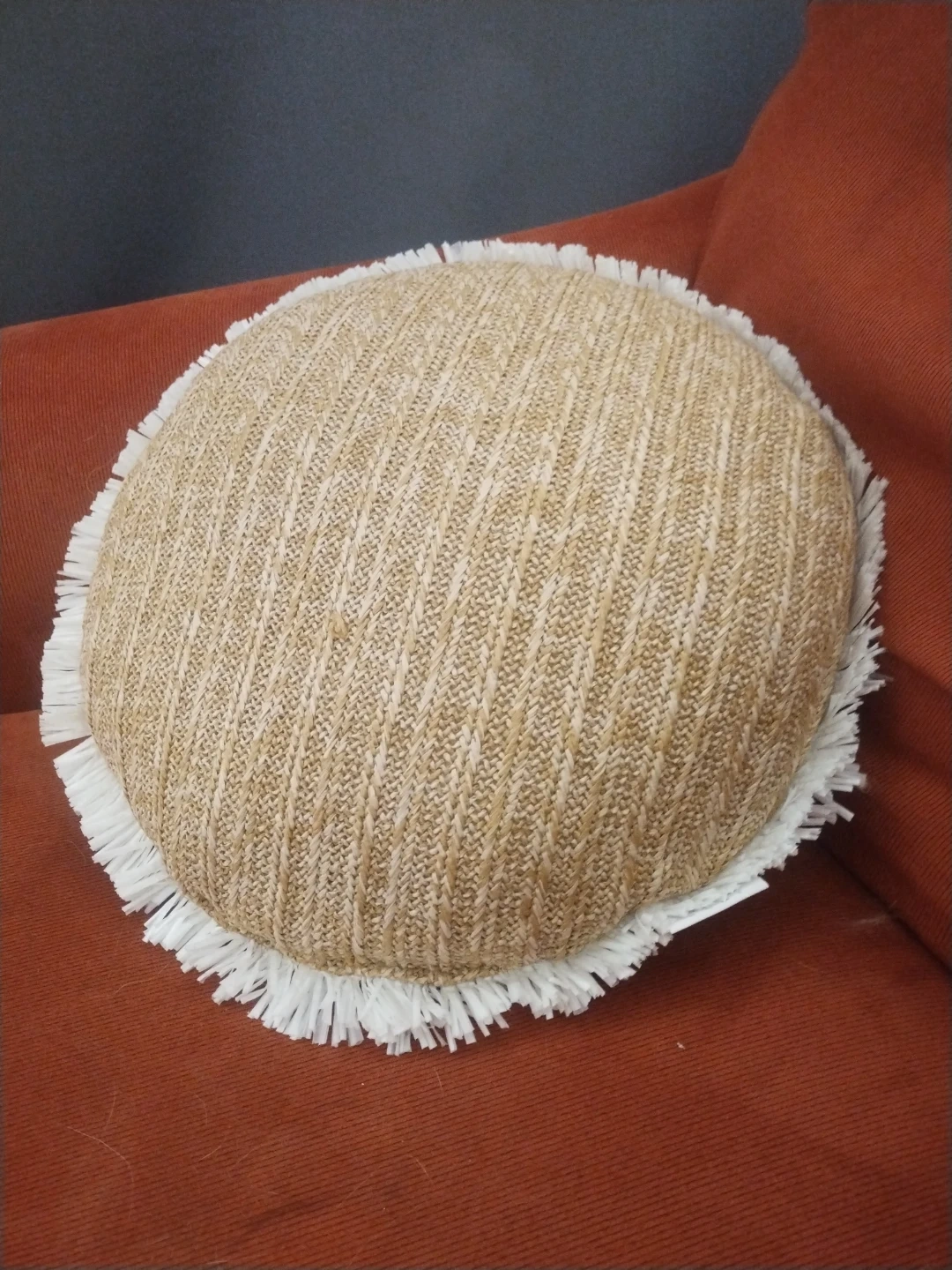 Here's a cute round cushion to add a bit of texture to your space! It features a woven design in a neutral tone and a fun fringe trim. Great for adding a cozy touch to your sofa or bed