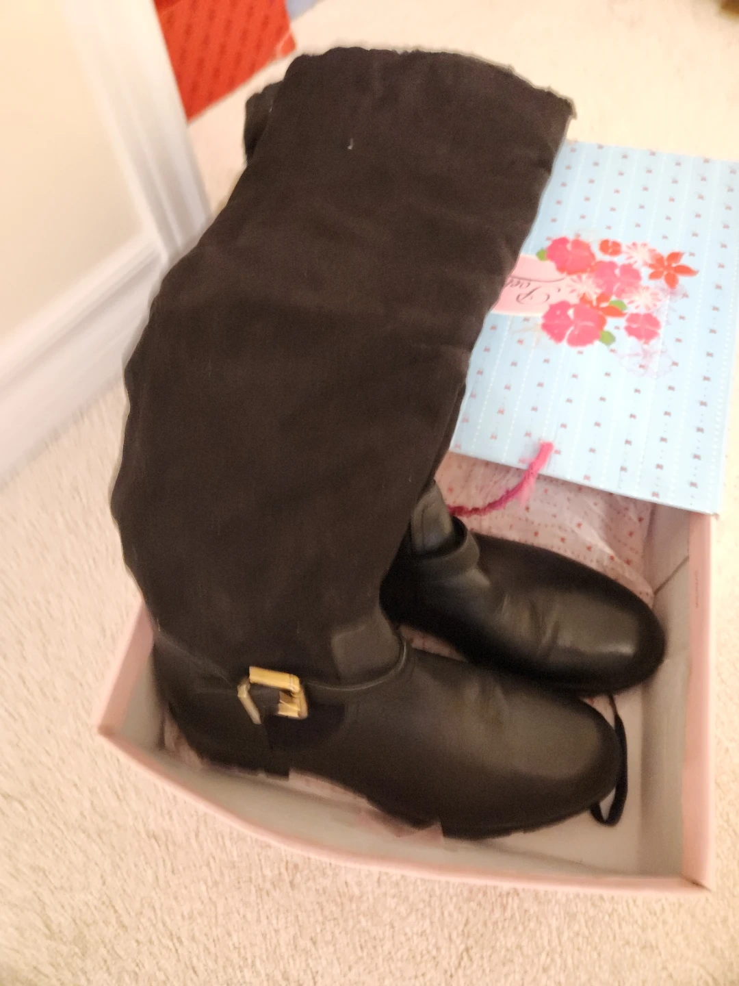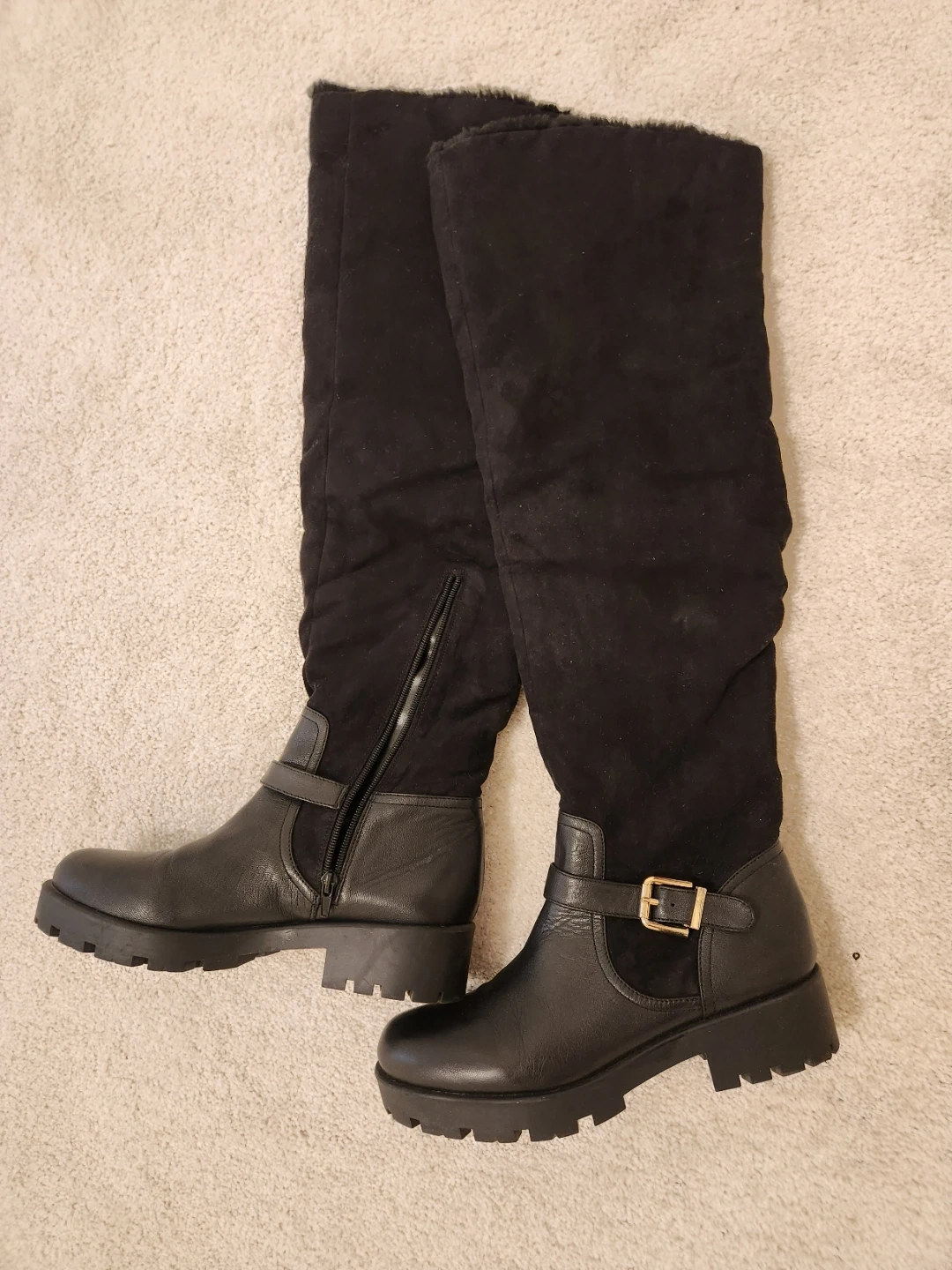 Selling a pair of stylish knee-high boots in black! Warm and comfortable. They feature a combination of leather and suede, giving them a unique look. The boots have a side zipper for easy wear and a comfortable block heel.