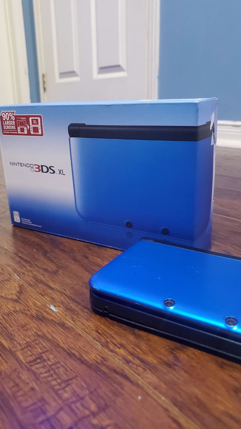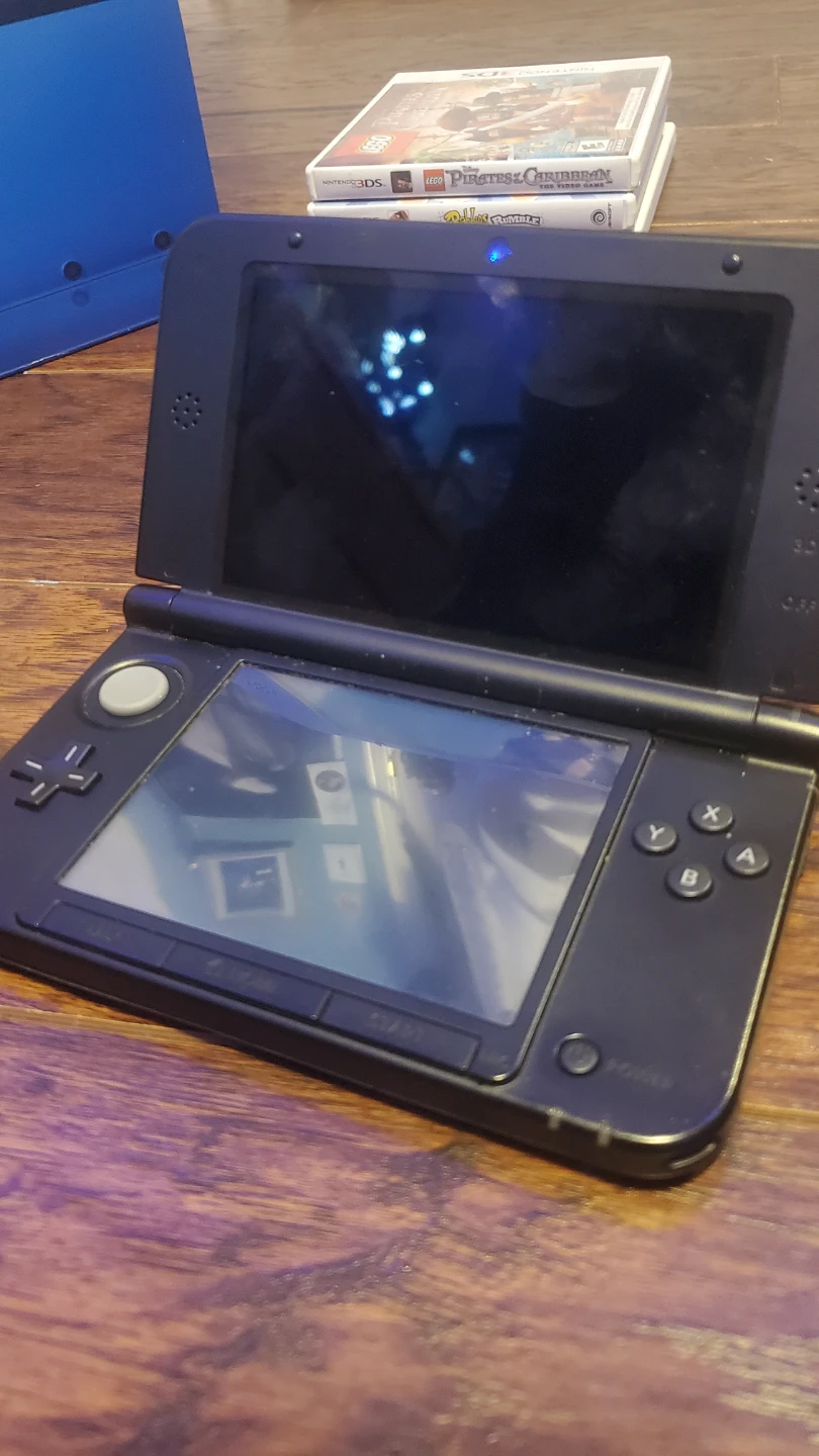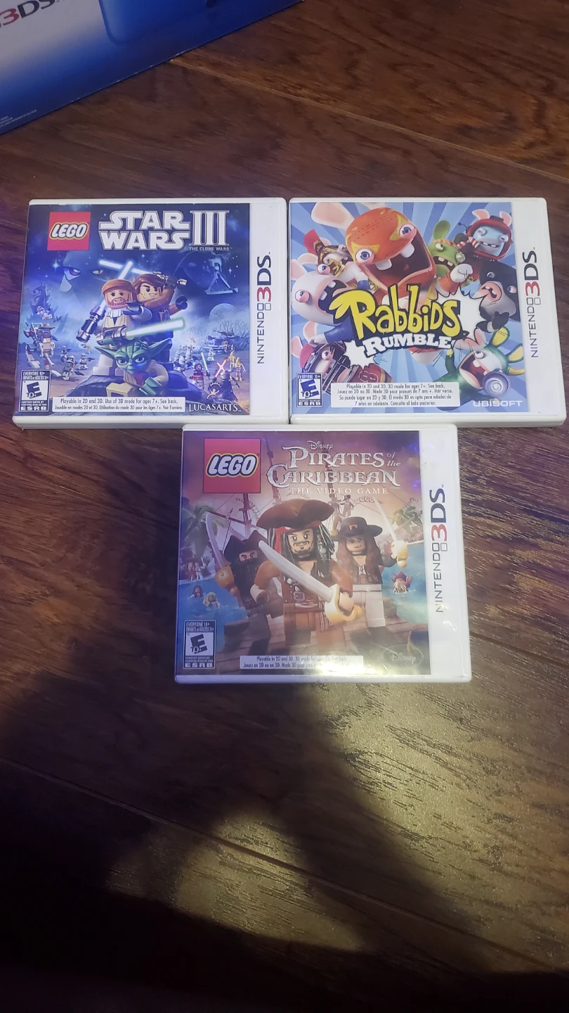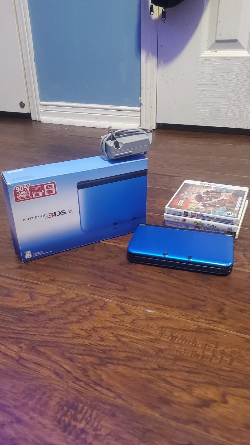 Selling a blue Nintendo 3DS XL with three games: LEGO Star Wars III, Rabbids Rumble, and LEGO Pirates of the Caribbean. Comes with the original box and charger.