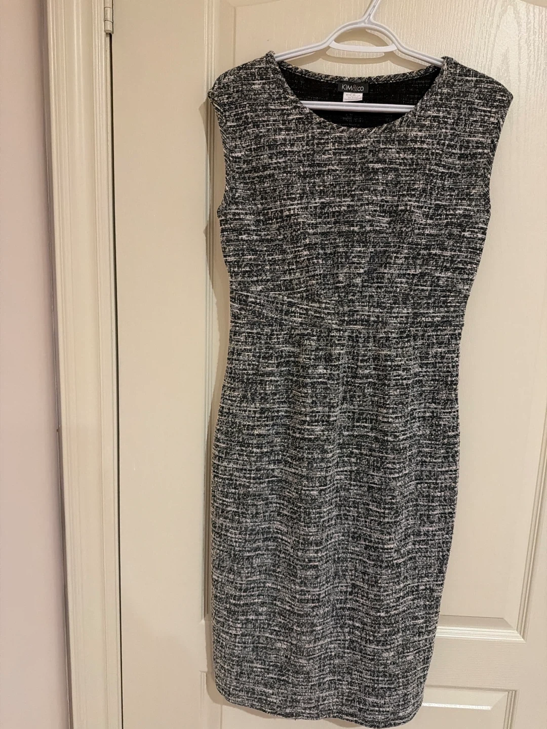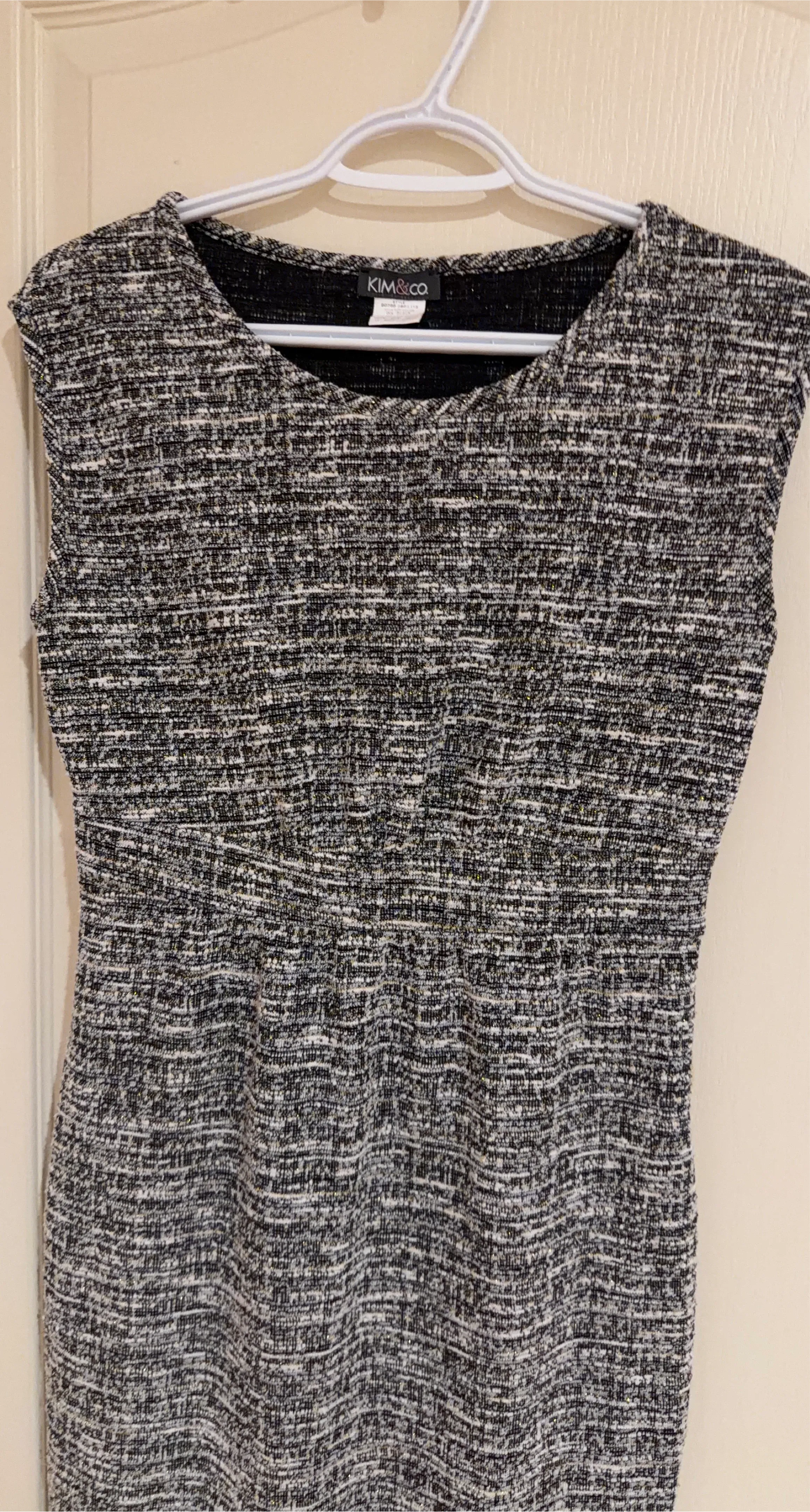 Selling a KIM & CO sleeveless dress in size S. It's in great condition and features a stylish tweed-like pattern. Perfect for any occasion!