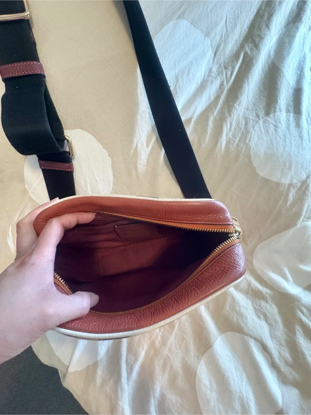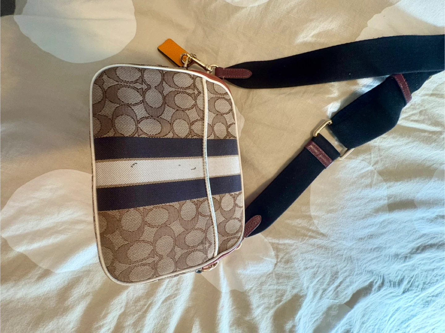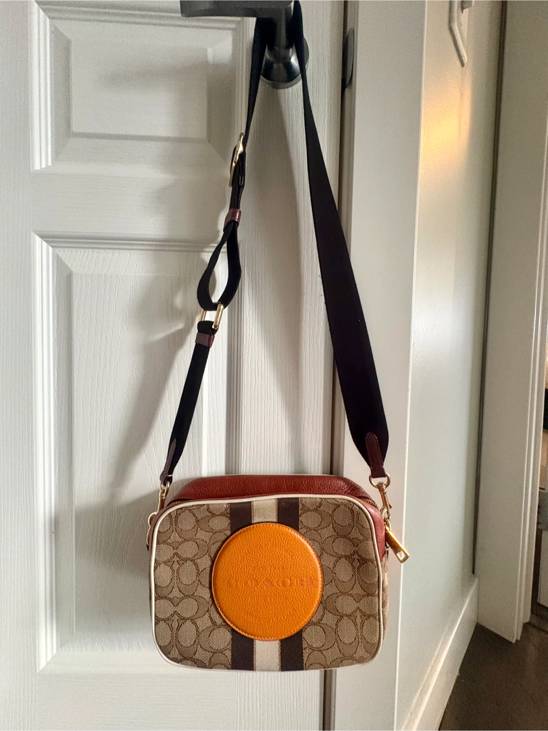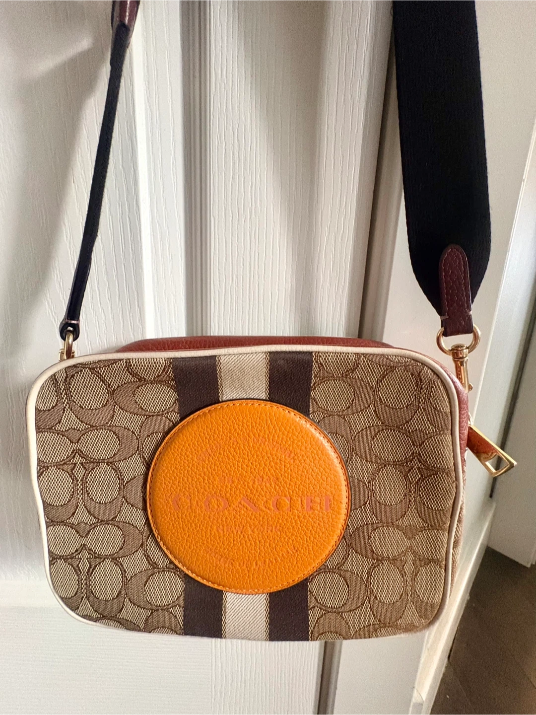 This is a Coach camera bag in the signature canvas print. It features a brown and orange colour scheme with a black strap. Great for everyday use and keeping your essentials close!