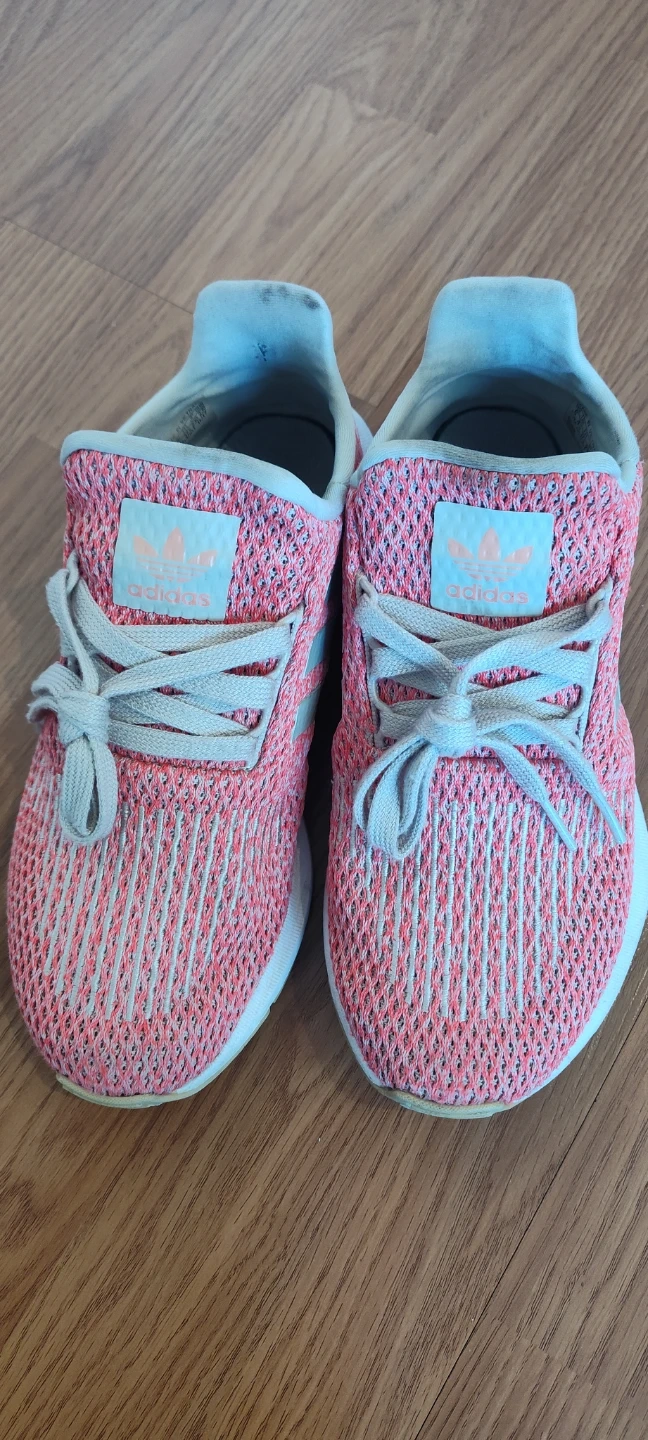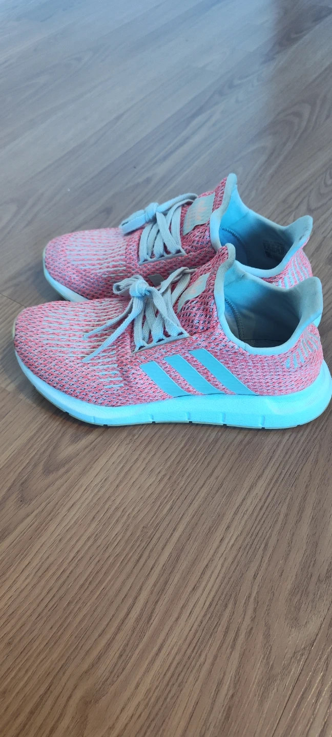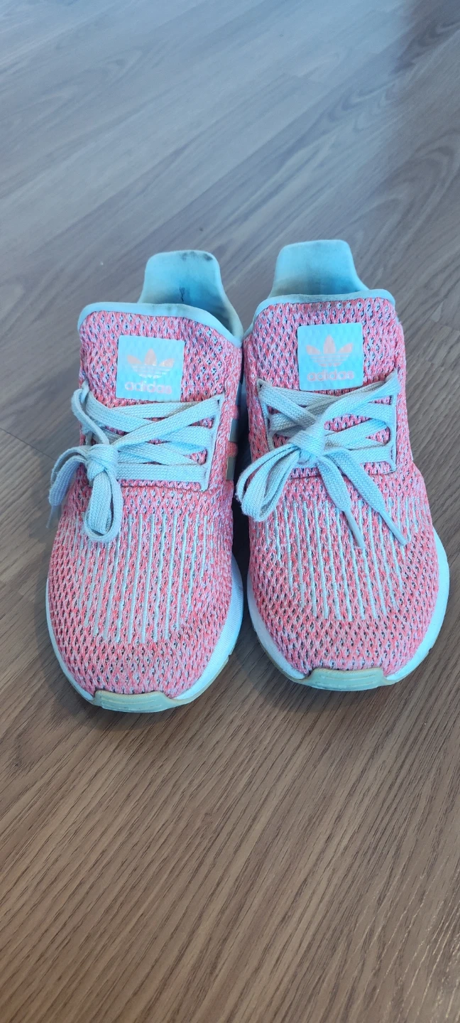 These adorable Adidas running shoes! They feature a stylish pink and white design with the classic Adidas logo. Perfect for your active adventures!