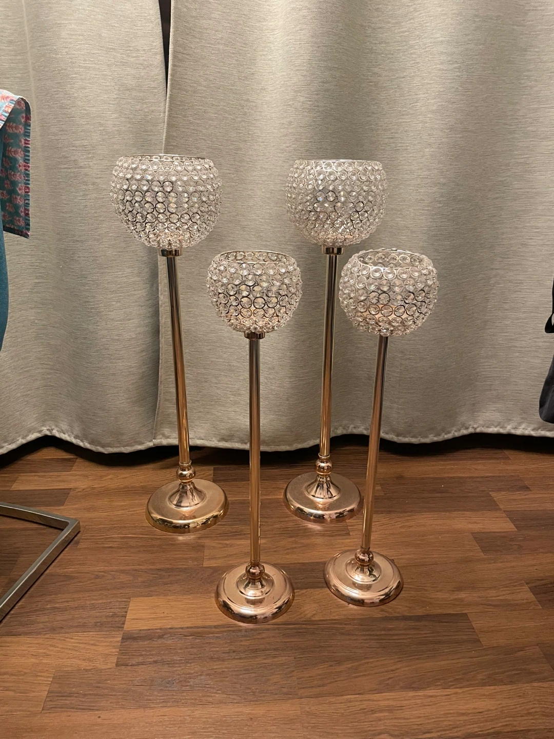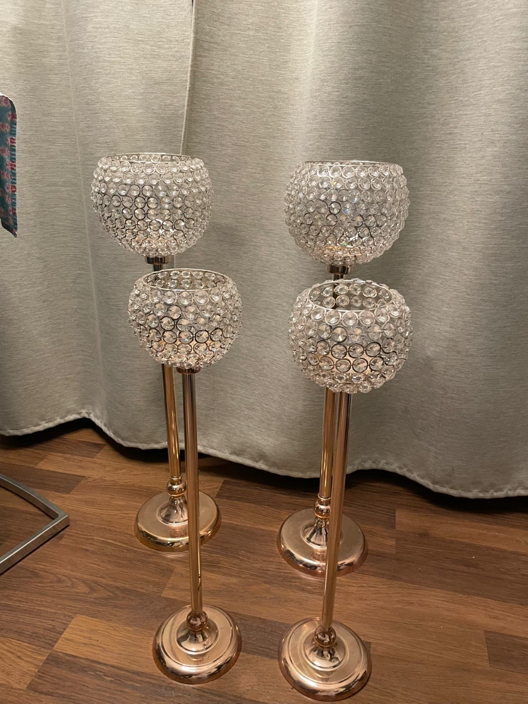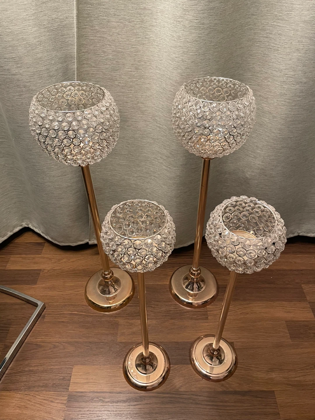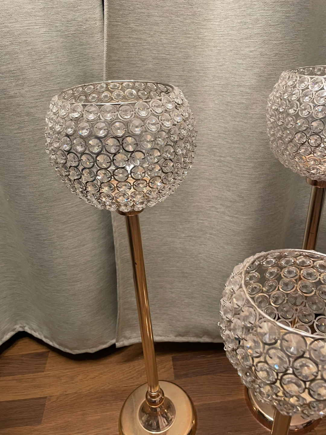 Selling a set of four elegant candle holders. They feature a beautiful crystal design on top of a gold coloured stand. Perfect for adding a touch of sparkle to any room!