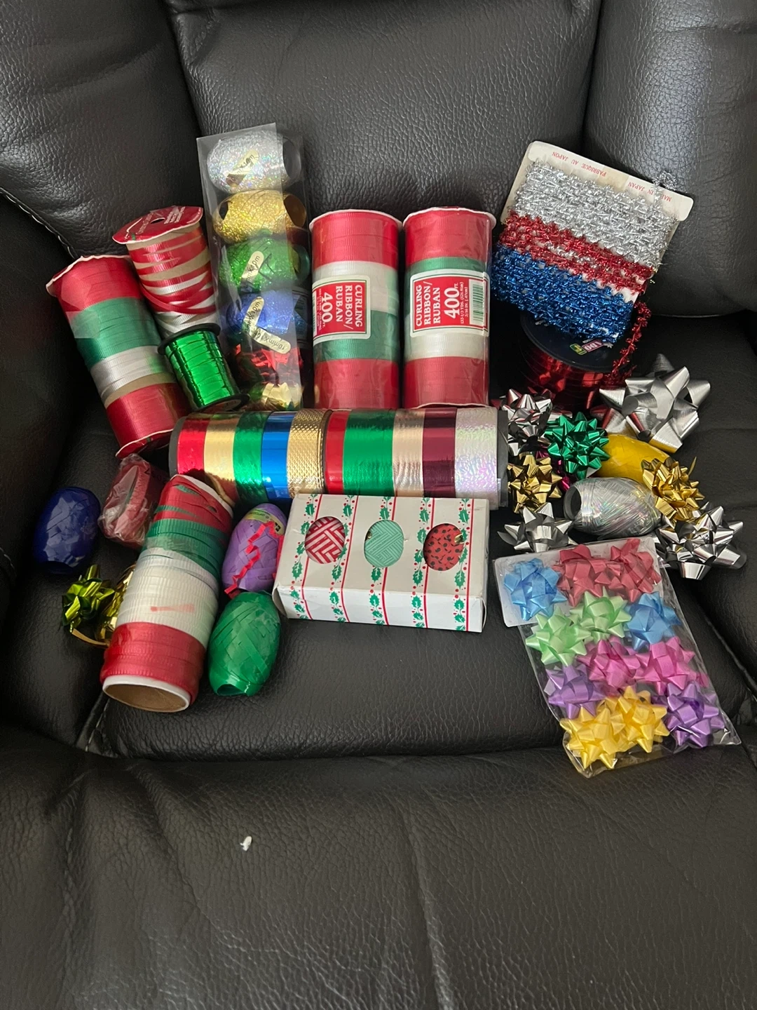 Selling a collection of curling ribbons and bows! Some not opened! There are various colours and styles, perfect for gift wrapping or crafting.
