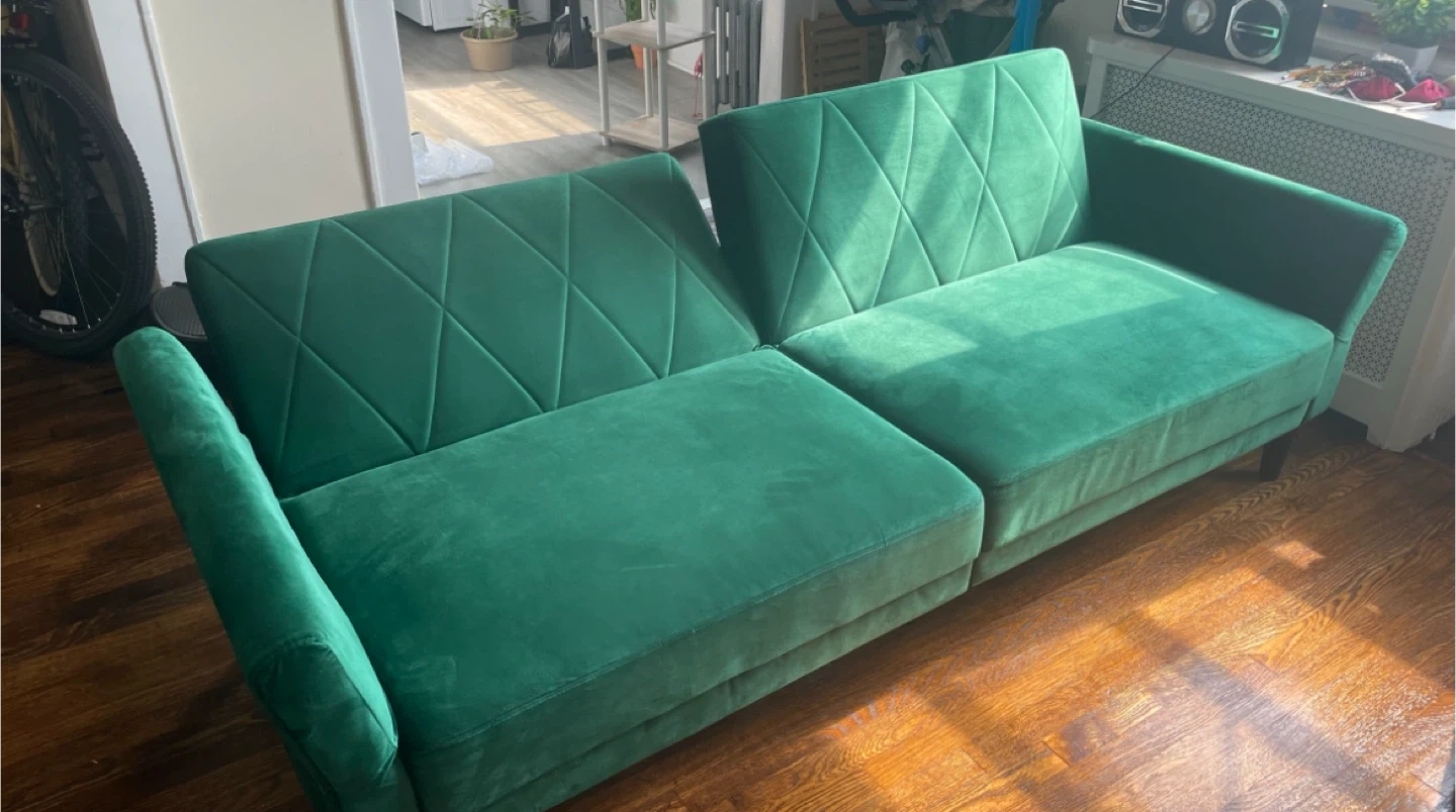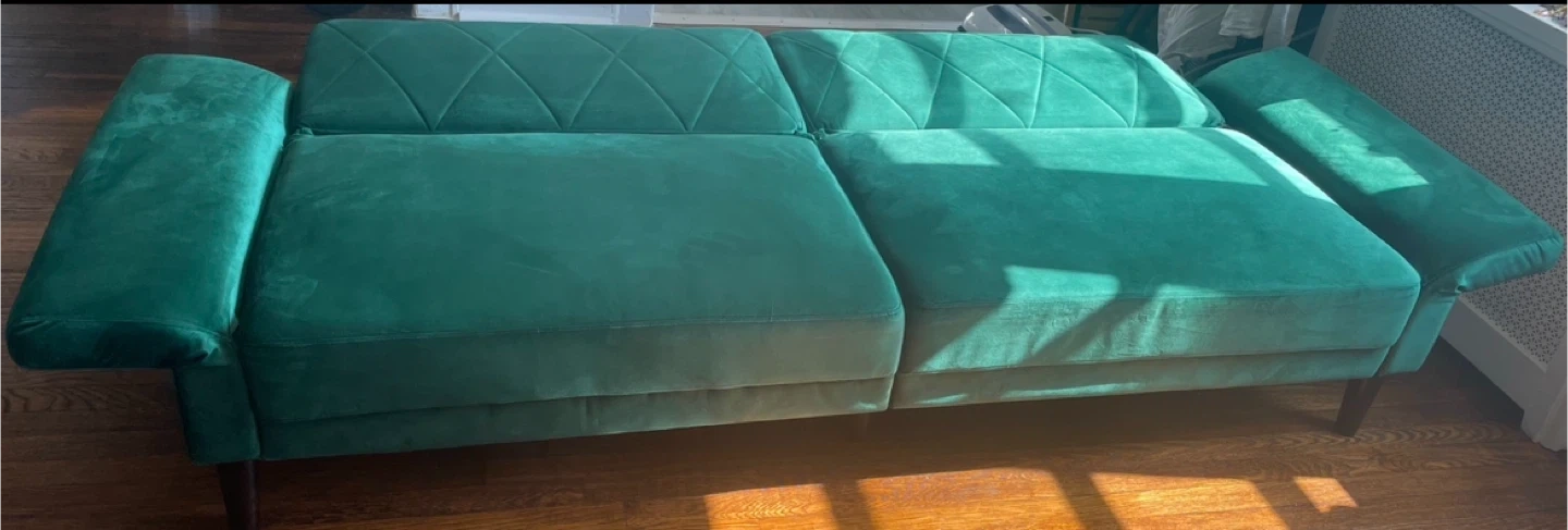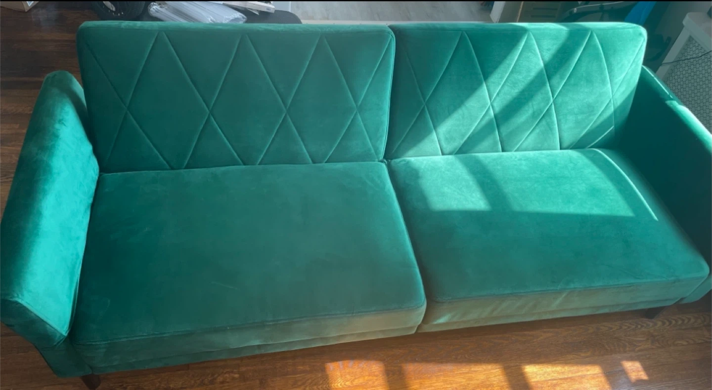 Selling a green velvet sofa bed! It's in great condition and ready for a new home. This convertible couch measures 78.7" in length, 32.3" in height, and 35.4" in depth. Perfect for small spaces or as an extra bed for guests.