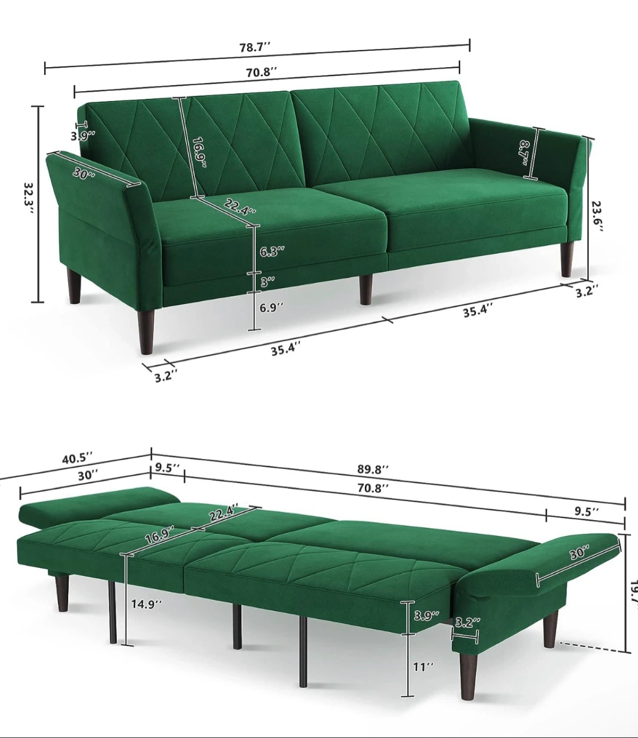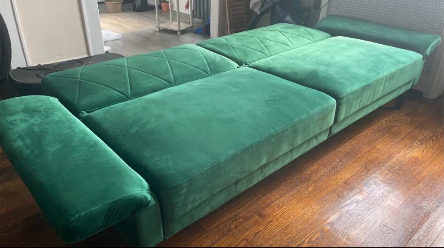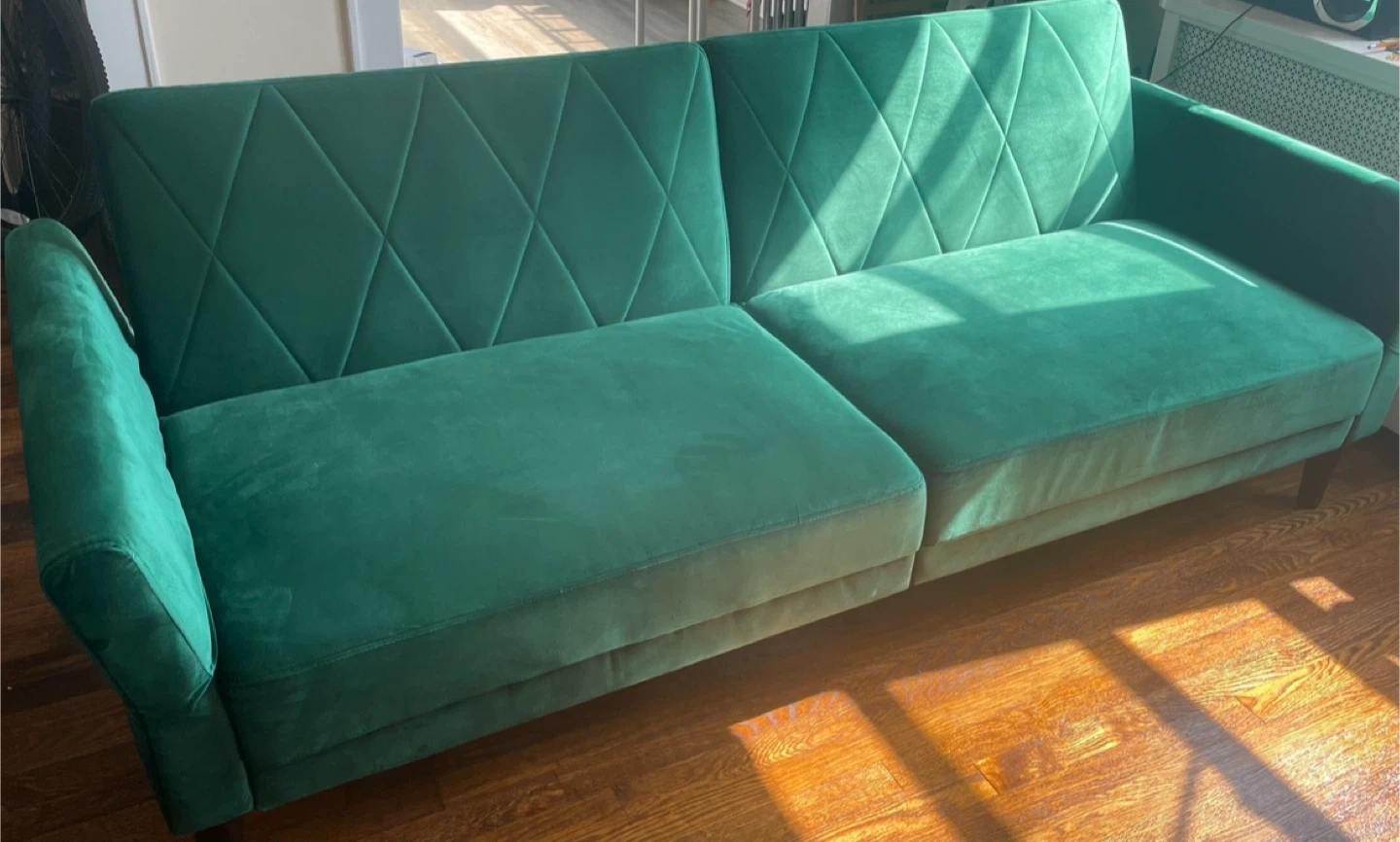 Selling a green velvet sofa bed! It's in great condition and ready for a new home. This convertible couch measures 78.7" in length, 32.3" in height, and 35.4" in depth. Perfect for small spaces or as an extra bed for guests.