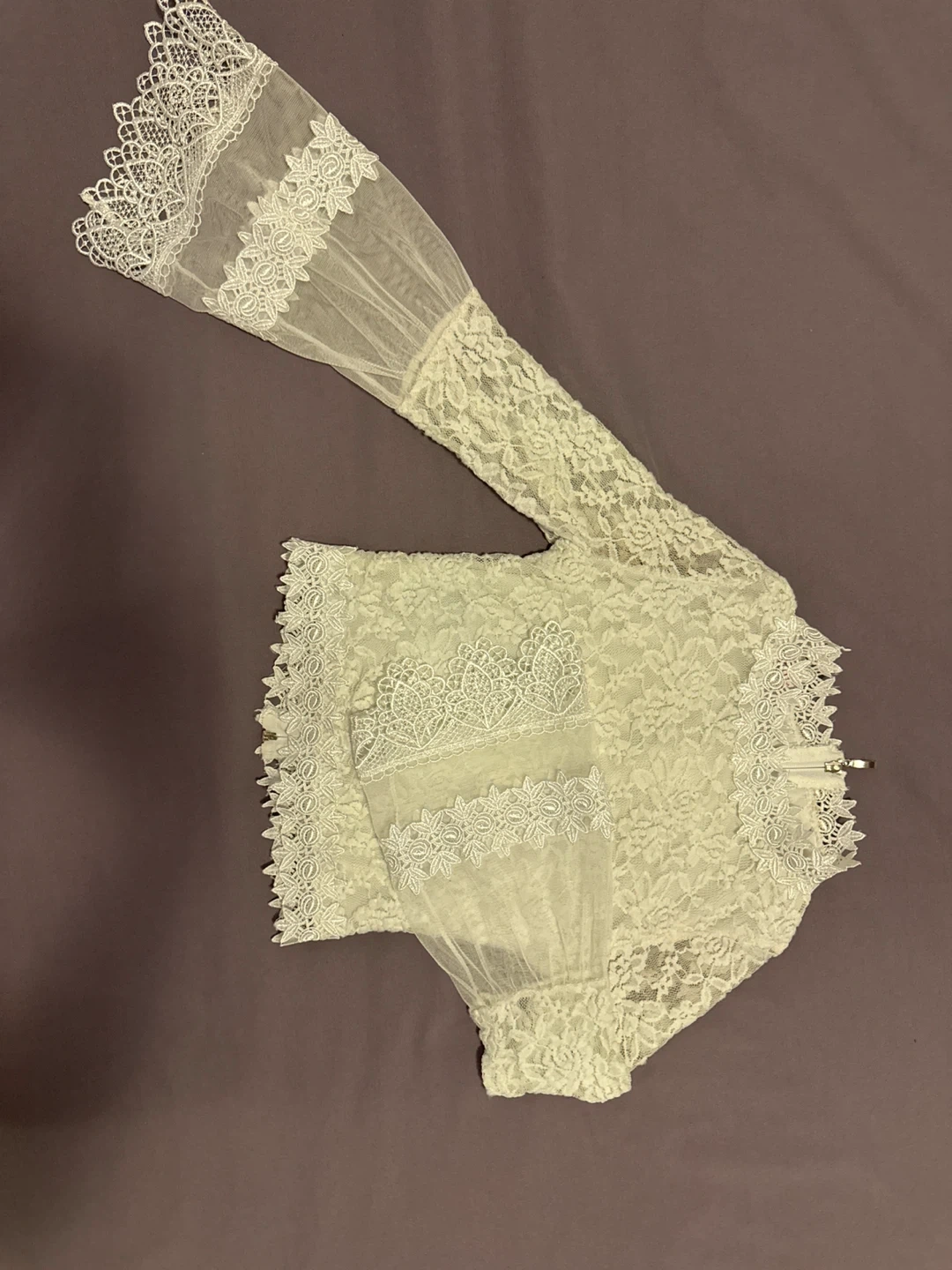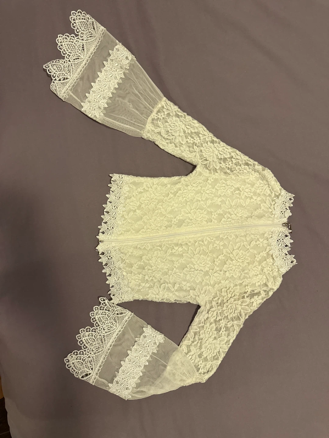 This is a delicate lace top with long sleeves, perfect for adding a touch of elegance to any outfit. It features intricate lace detailing throughout and a flattering silhouette. The material is lightweight and comfortable, making it ideal for layering or wearing on its own. It would be a lovely addition to your wardrobe! Size SX