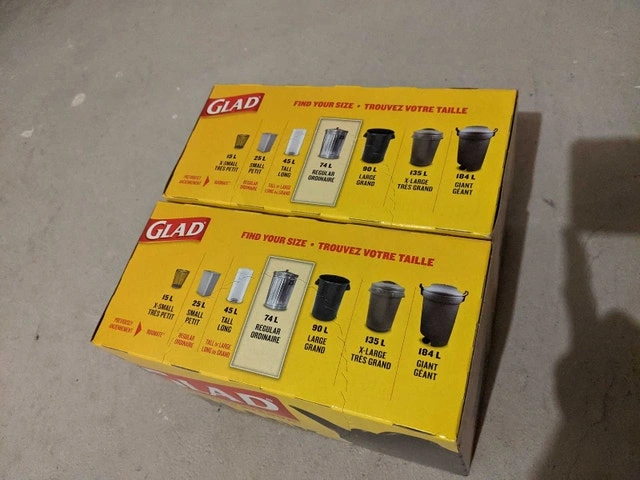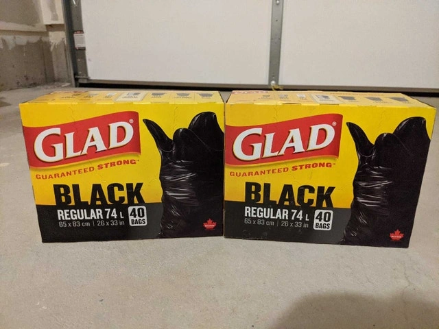 I'm offering two boxes of Glad Black Regular 74L garbage bags, each containing 40 bags, for a total of 80 bags. These bags are new and ready to handle all your waste disposal needs.