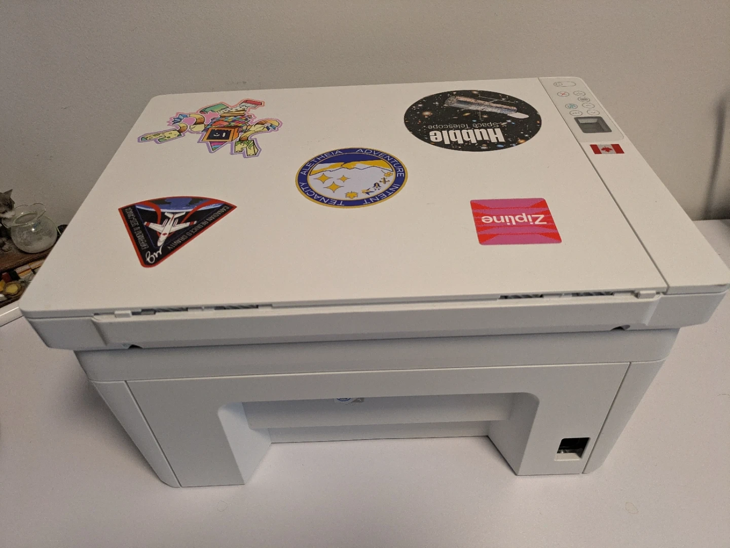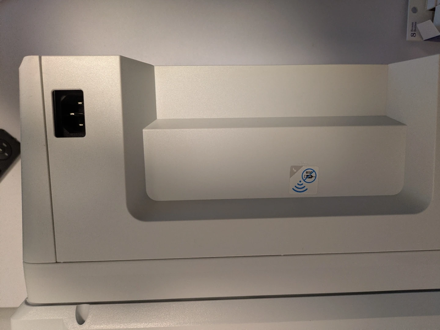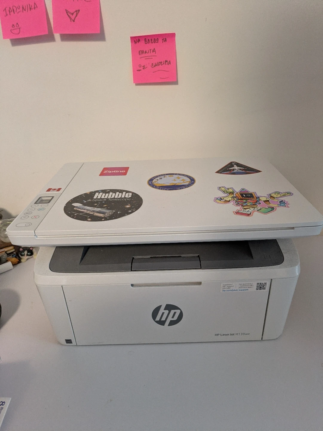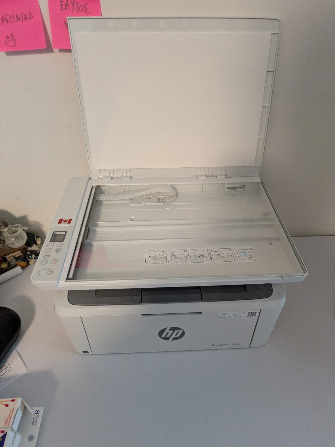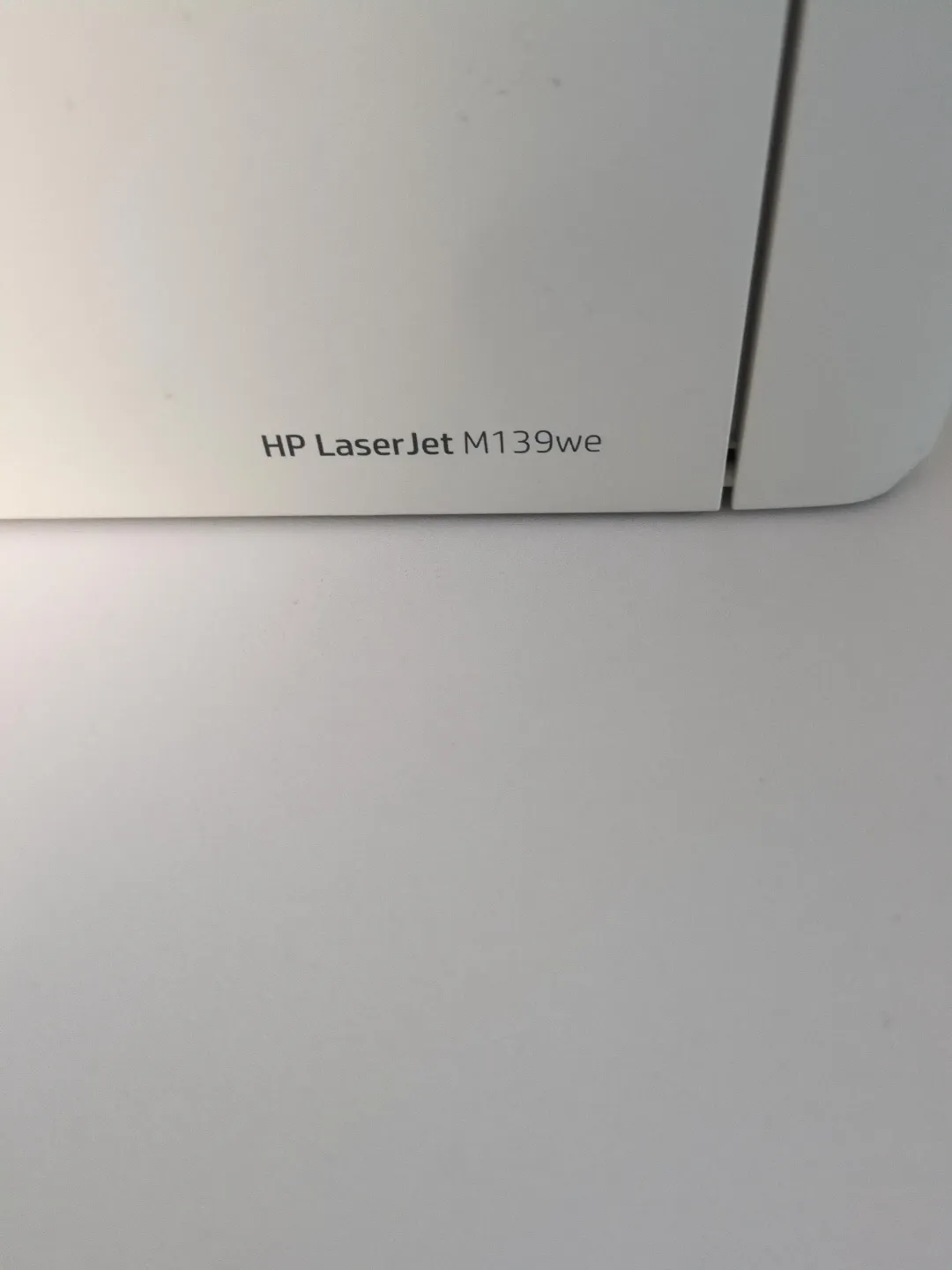 White HP LaserJet M139we printer. It's a monochrome laser printer. Ideal for home or small office use. Works only with wifi network, not cable. Please look the instructions online how to set up. Does not include cable but you only need a computer cable (I included pic of the back in the profile). Thats why I have it at half price