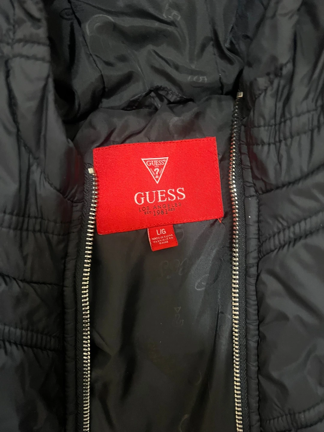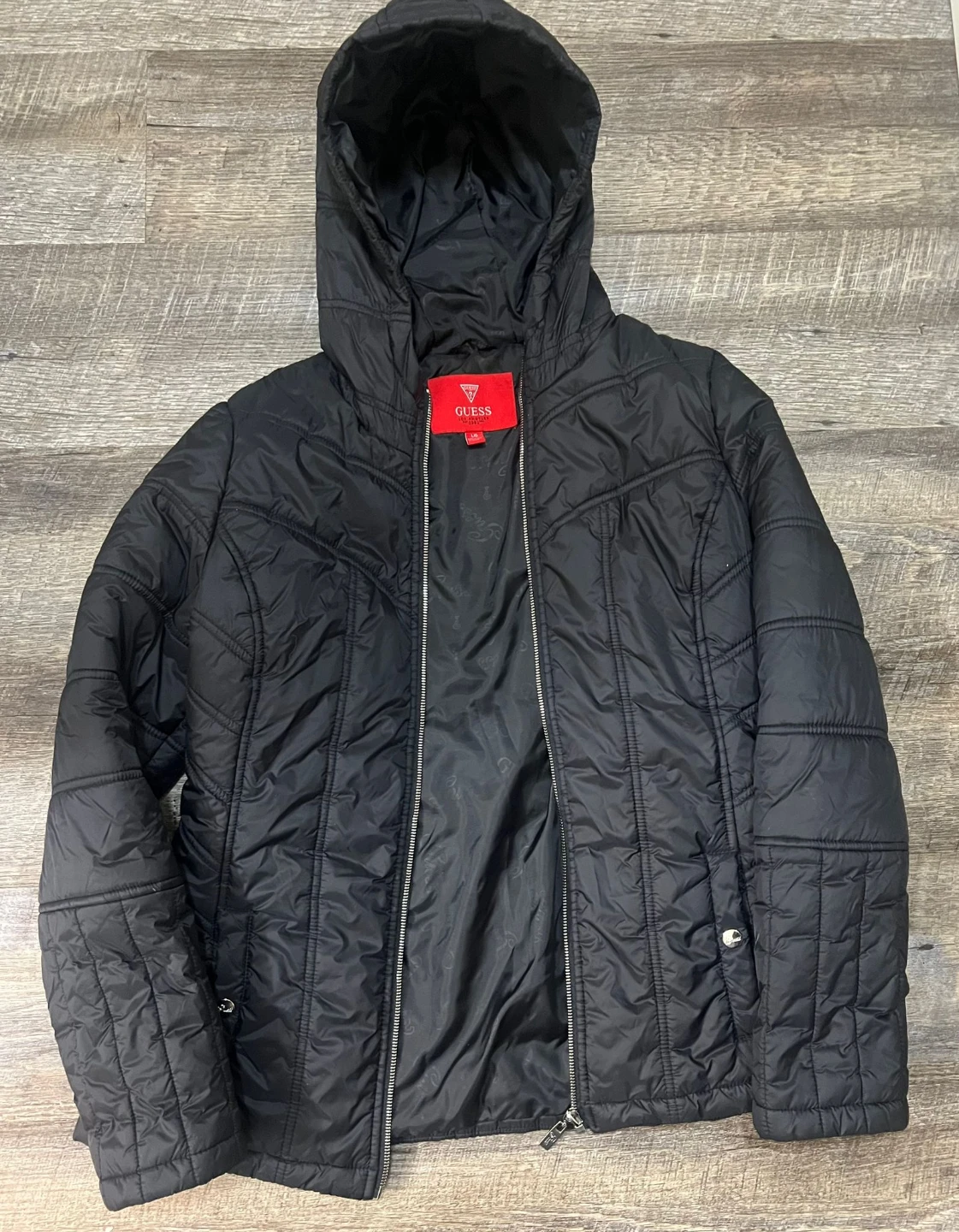 Selling a Guess black puffer jacket in size large. It's in great condition and ready for the colder weather! The jacket features a quilted design and a full zip closure.