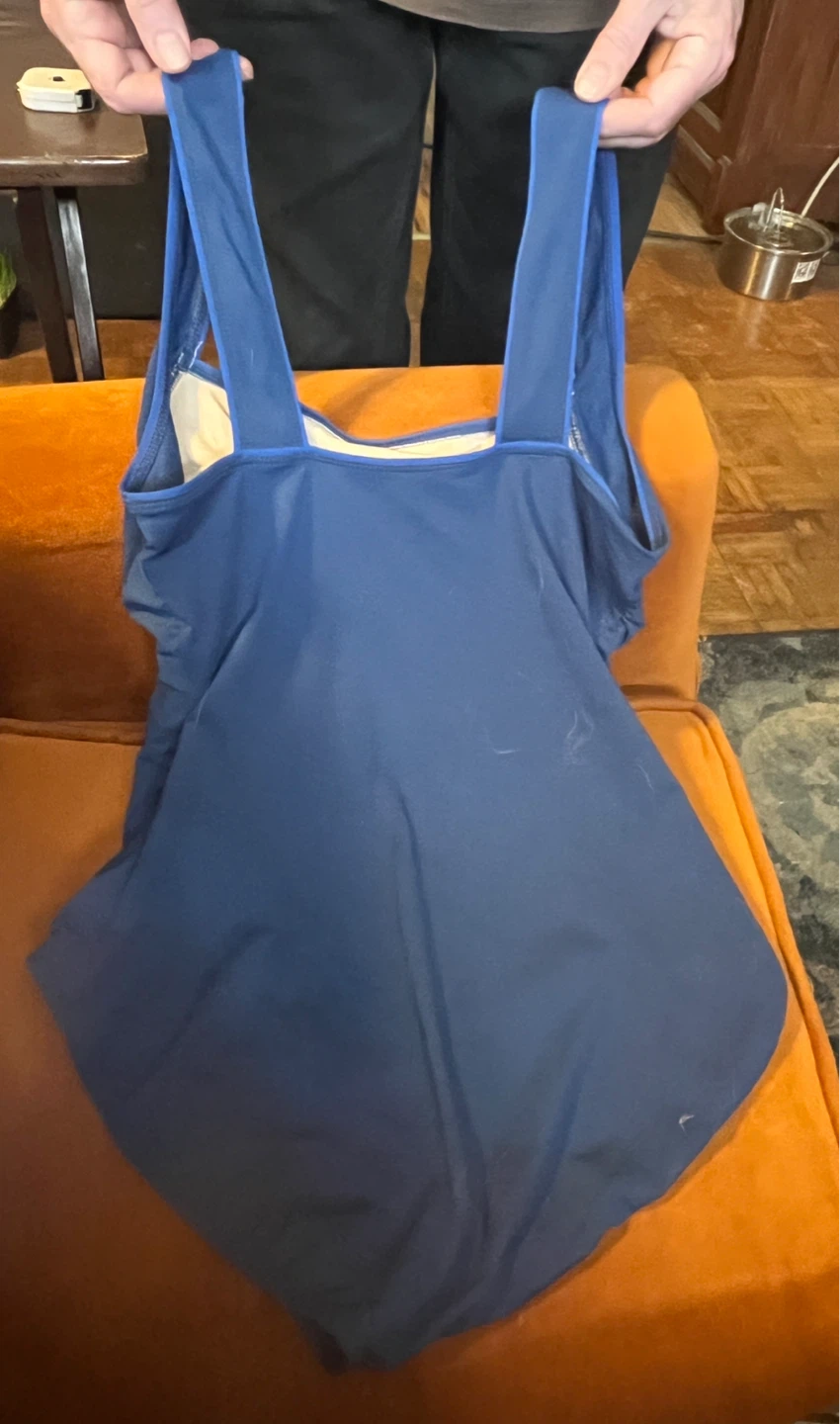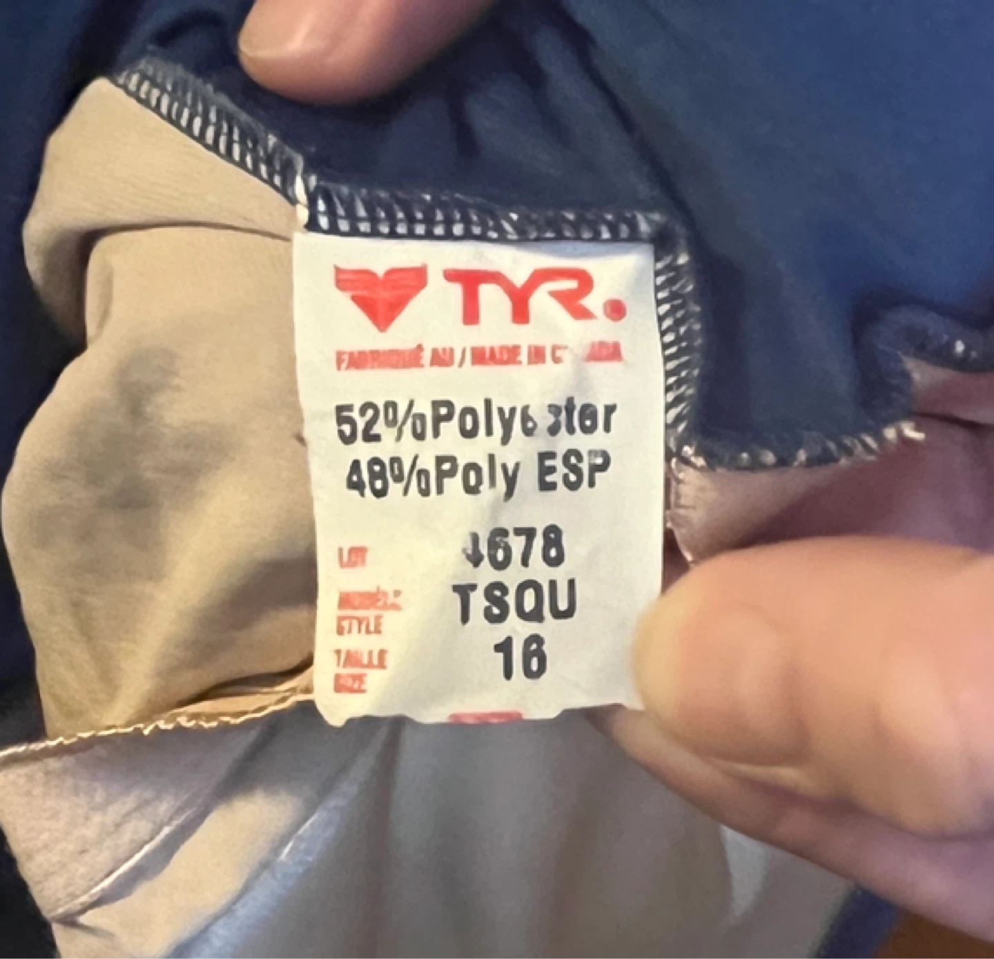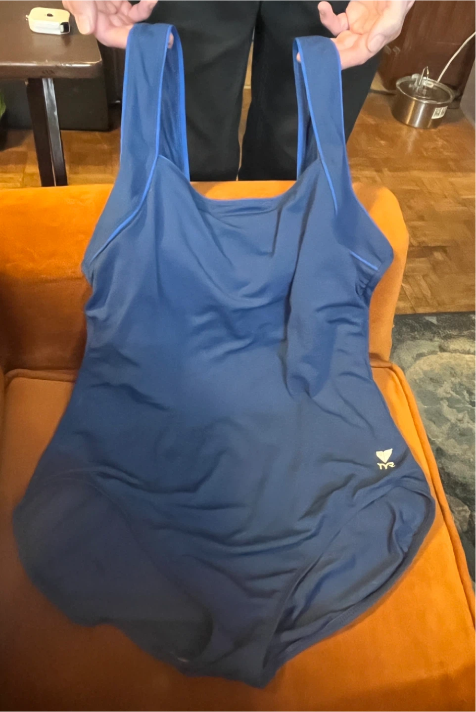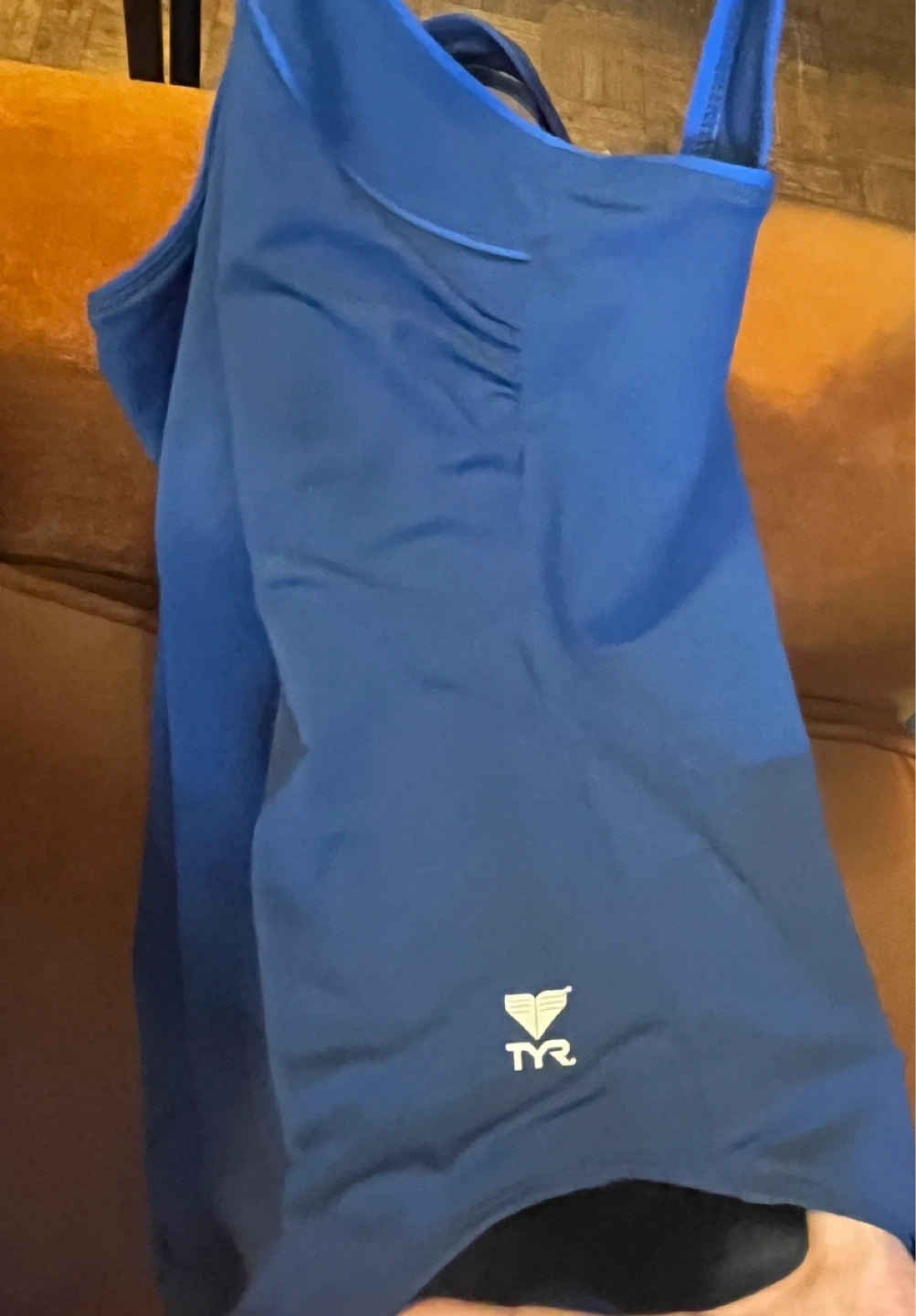 Selling a TYR swimsuit in a lovely blue colour! It's a size 16 and made of 52% polyester and 48% poly ESP. Perfect for swimming laps or just relaxing by the pool.