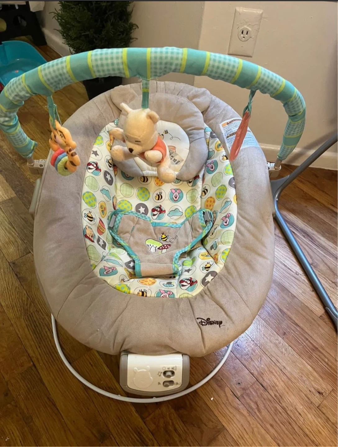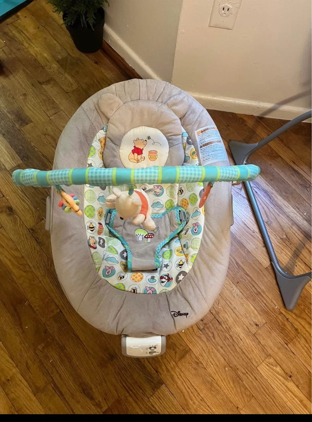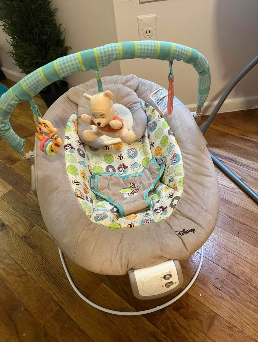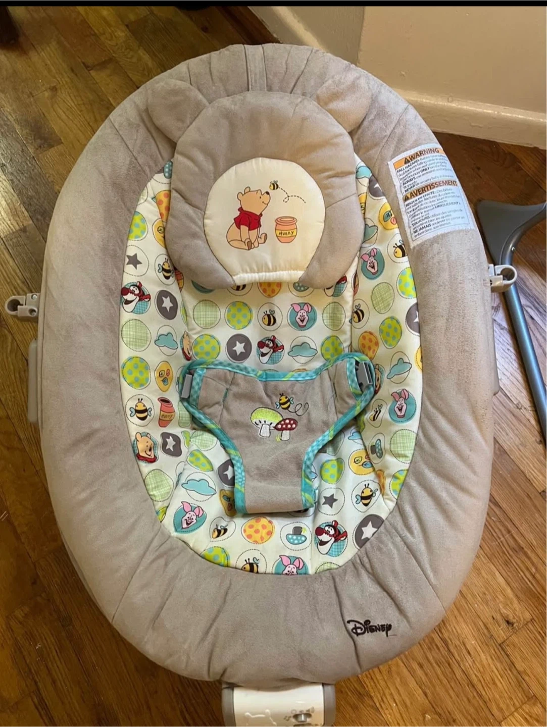 This is a Winnie the Pooh themed baby bouncer by Disney Baby! It's in great condition and ready for a new little one. It features a cute design with Winnie the Pooh and friends, and has a soft, comfortable seat for your baby to relax in. It also includes a toy bar with hanging toys to keep your baby entertained.