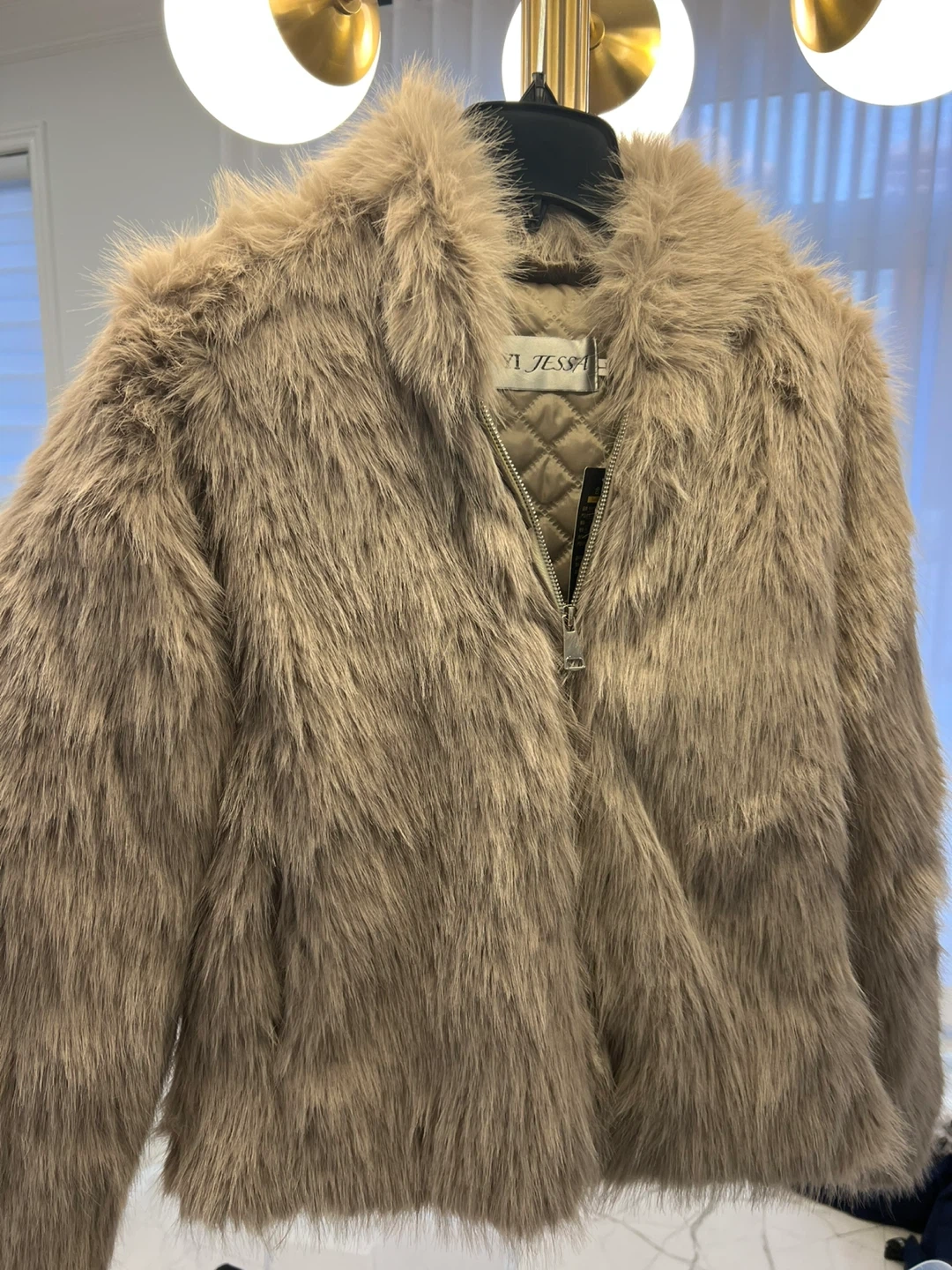 Here's a stylish fur coat from Yi Jessa! It's in great condition and ready to keep you warm and fashionable. The neutral colour is versatile and easy to match with any outfit. Perfect for adding a touch of luxury to your wardrobe!