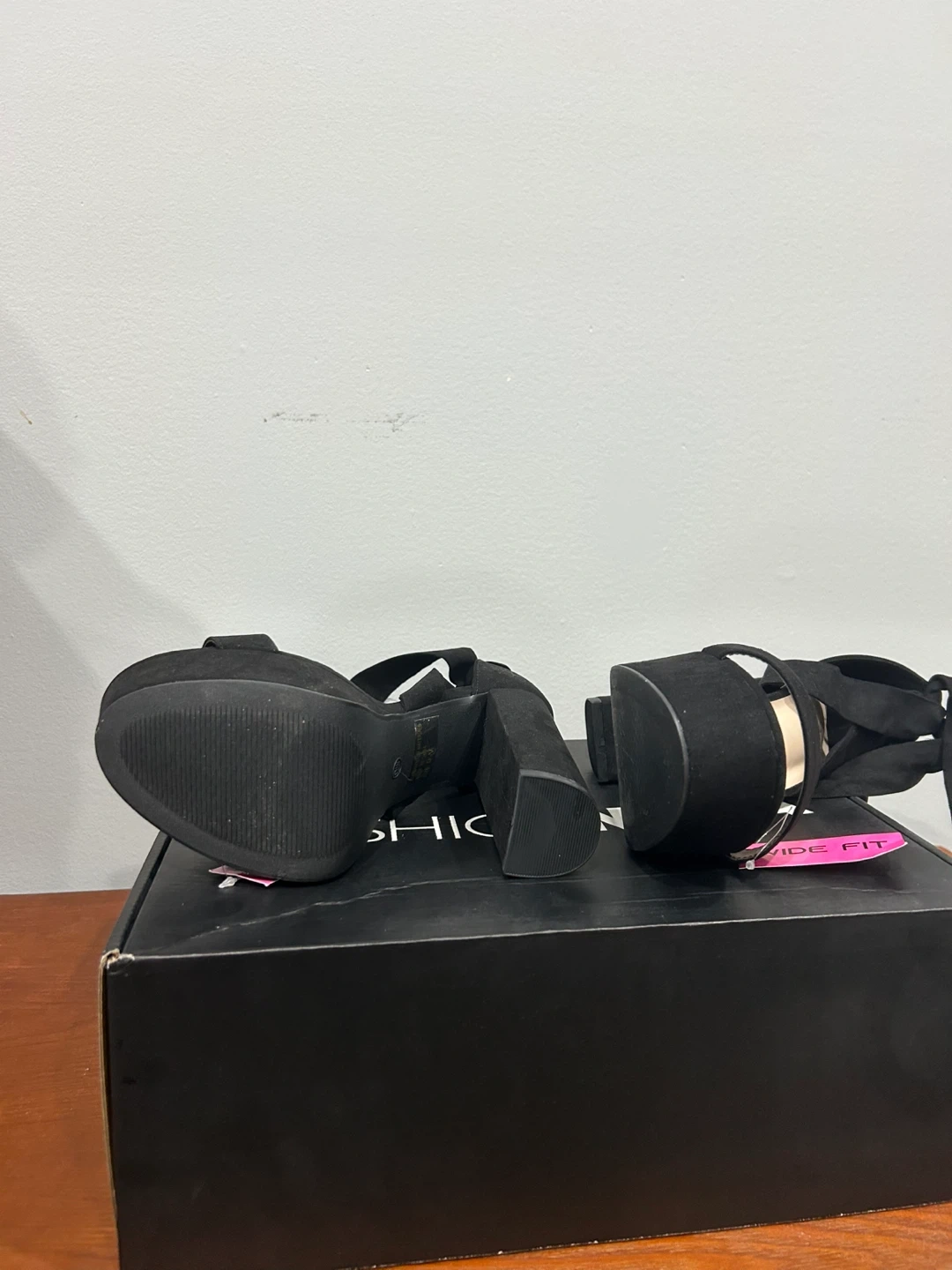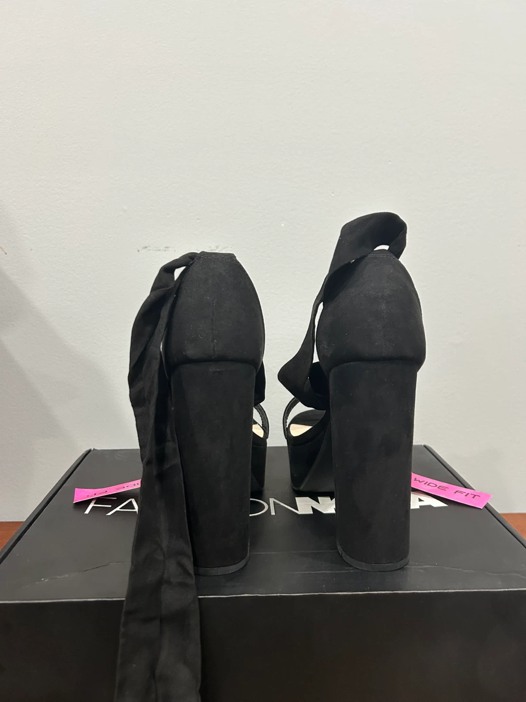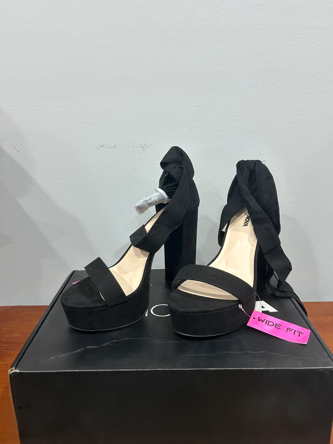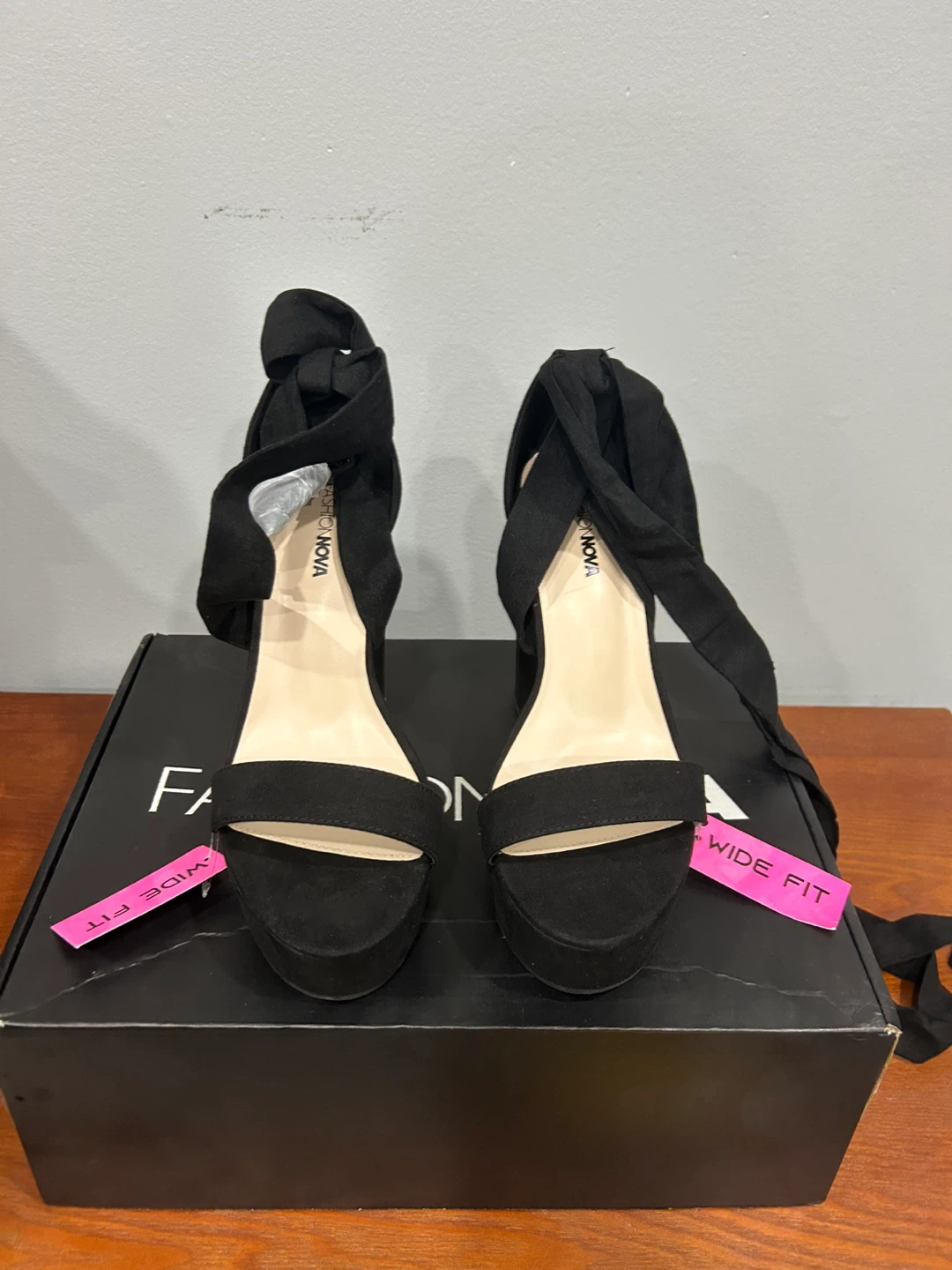 Size 9 wide. Super comfortable fit, has been tried on but a bit too big for me. Purchased for $63 after tax. 1.5” platform, 4.75” ultra high heel, Wrap ribbon straps. Buy new in box.