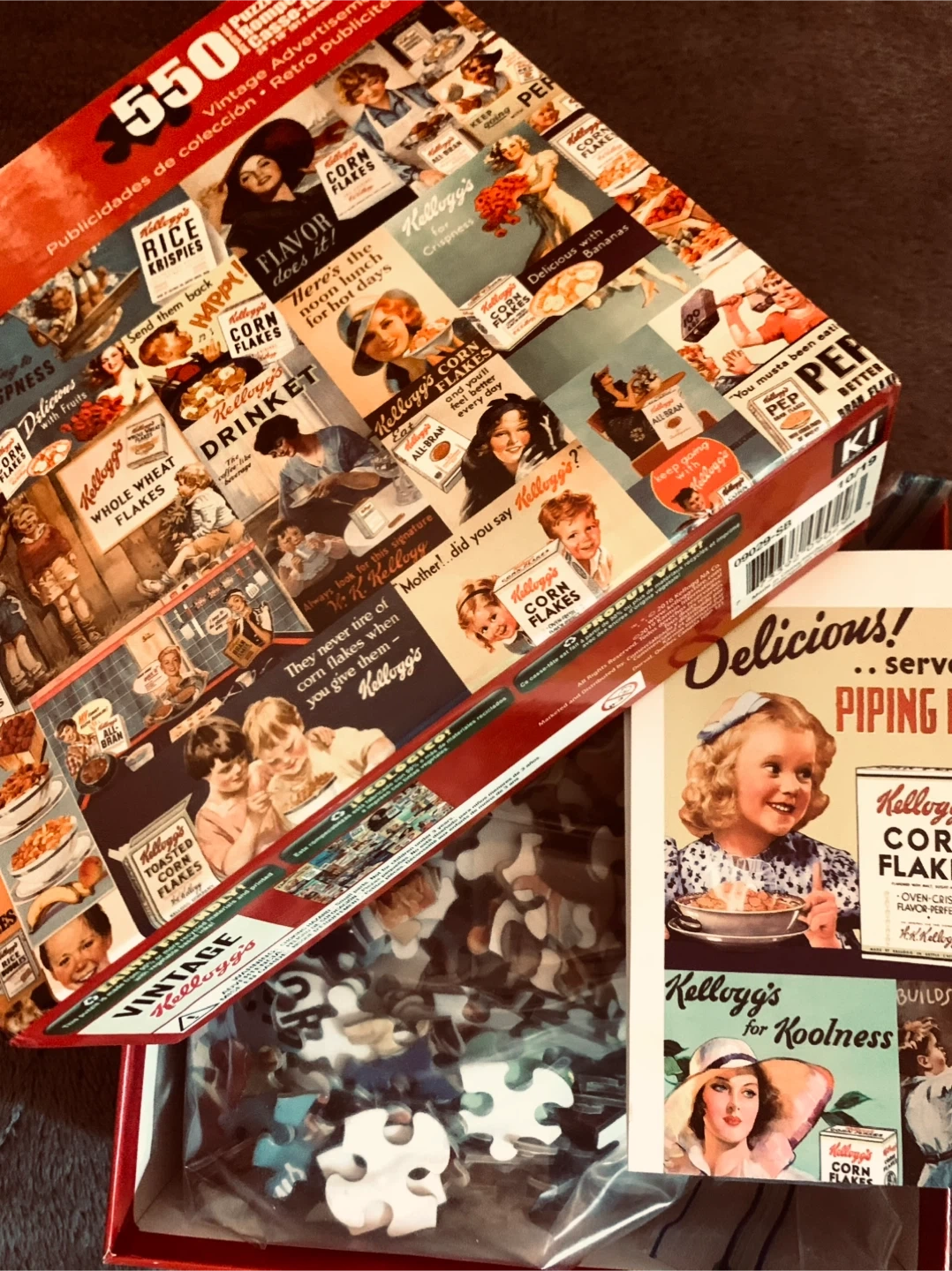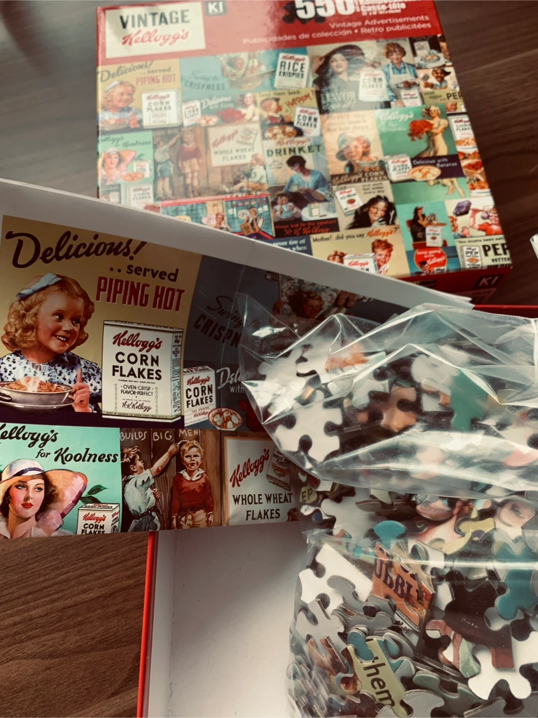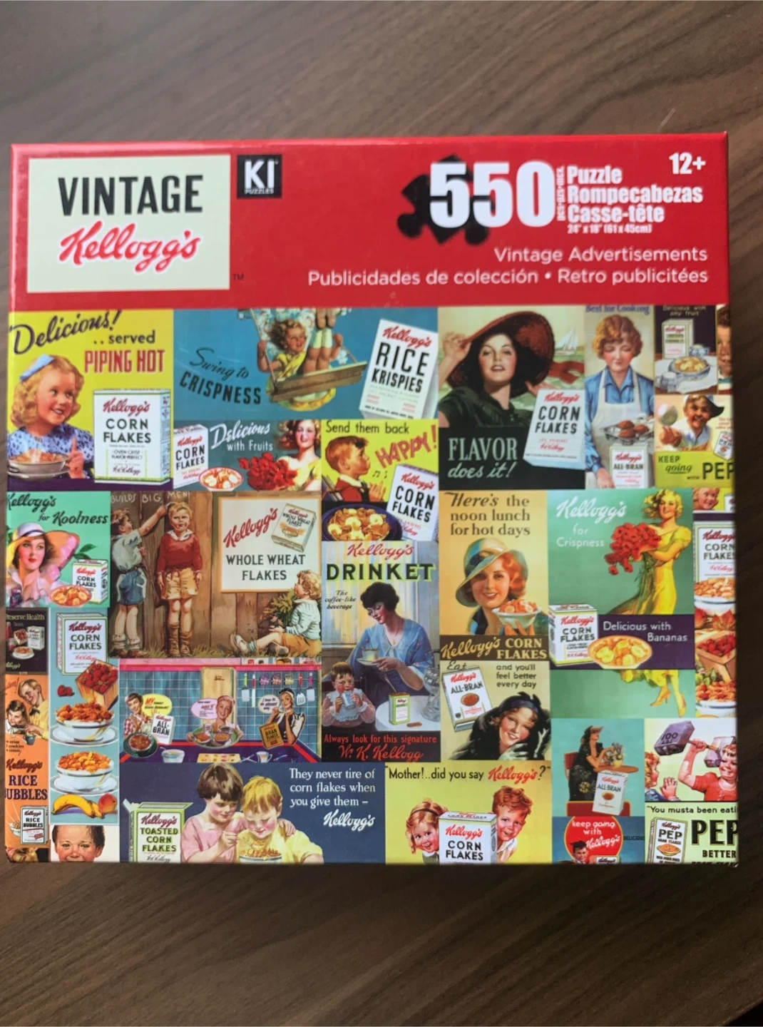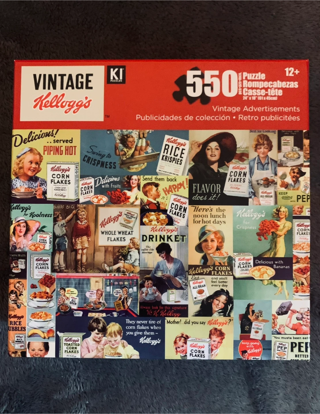 Selling a vintage Kellogg's 550 piece puzzle! The puzzle features vintage advertisements and is suitable for ages 12+. It comes with all the pieces and the original box with a poster.