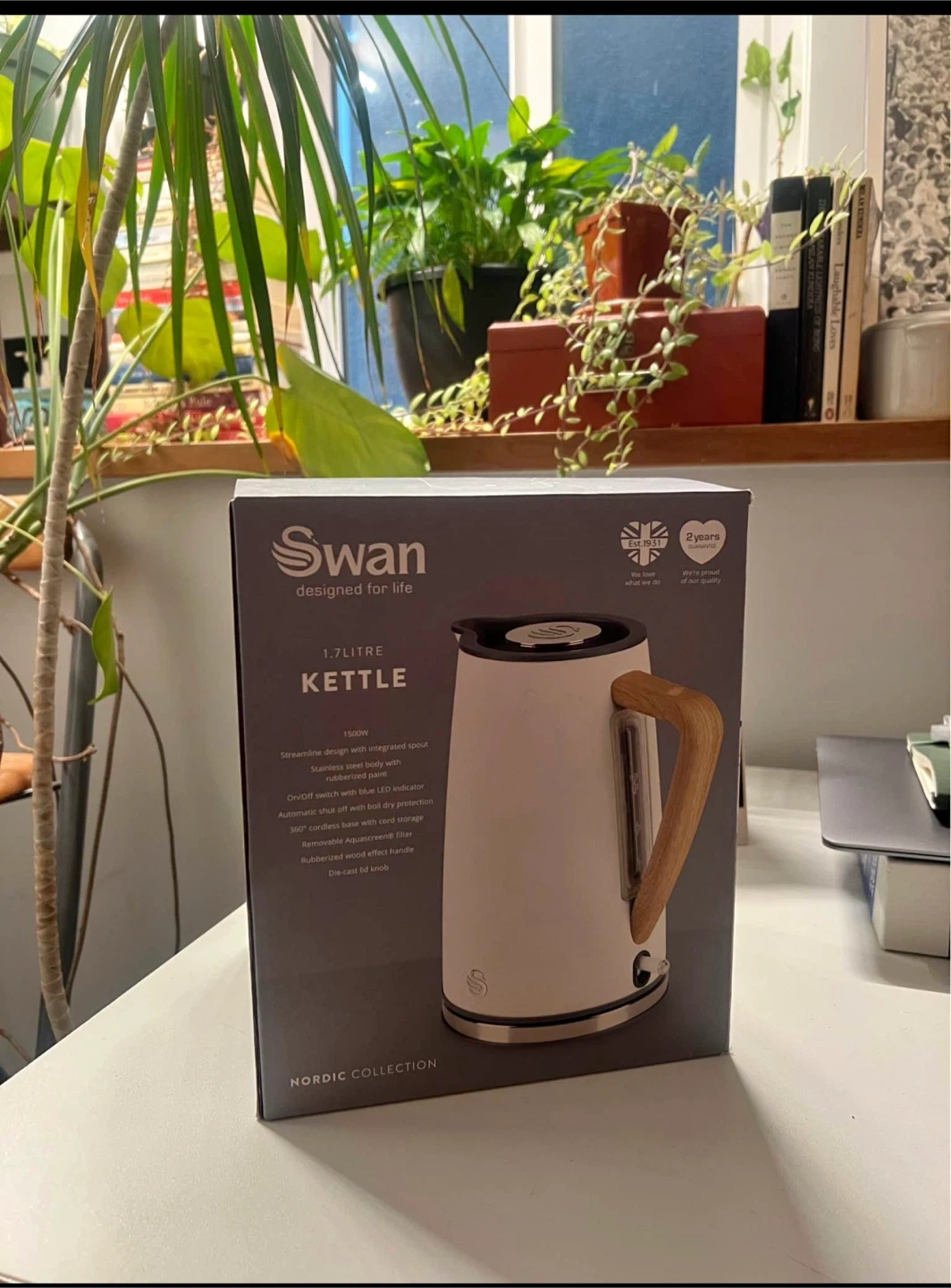 Selling a Swan Nordic Collection kettle! It's a 1.7L kettle with a streamline design and integrated spout. It features a stainless steel body with rubberized paint, an on/off switch with a blue LED indicator, and automatic shut-off with boil-dry protection. It also has a 360° cordless base with cord storage, a removable Aquascreen filter, a rubberized wood effect handle, and a die-cast lid knob. The box is included!