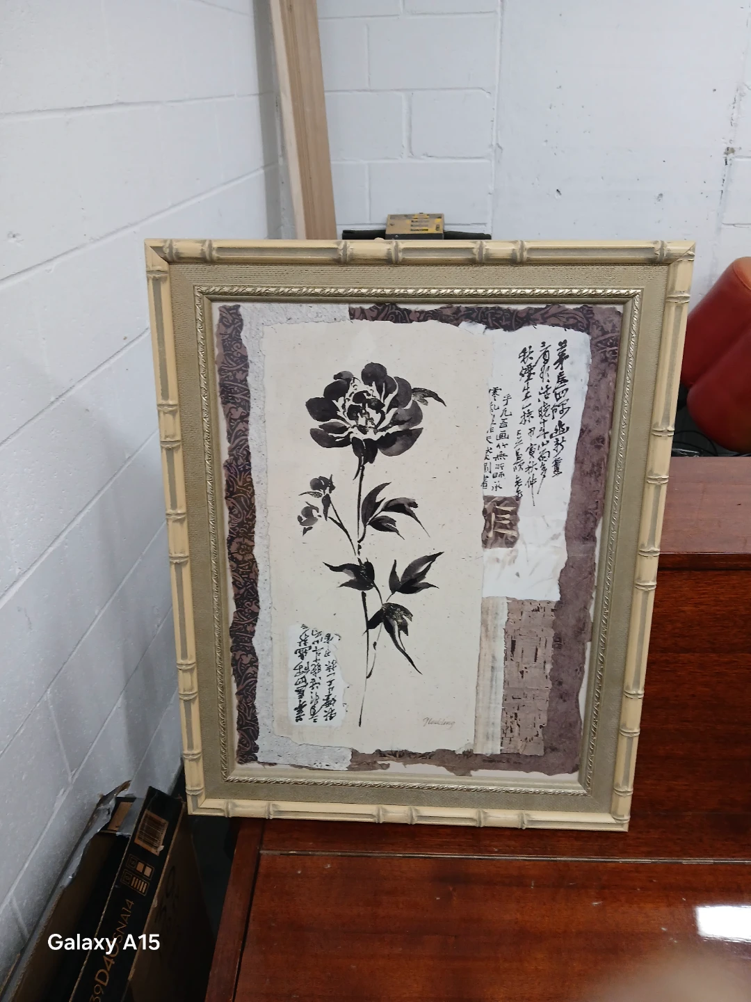 This is a framed piece of floral art featuring what looks like a peony and some Asian calligraphy. The frame has a faux bamboo design. It would be a lovely addition to your home decor!