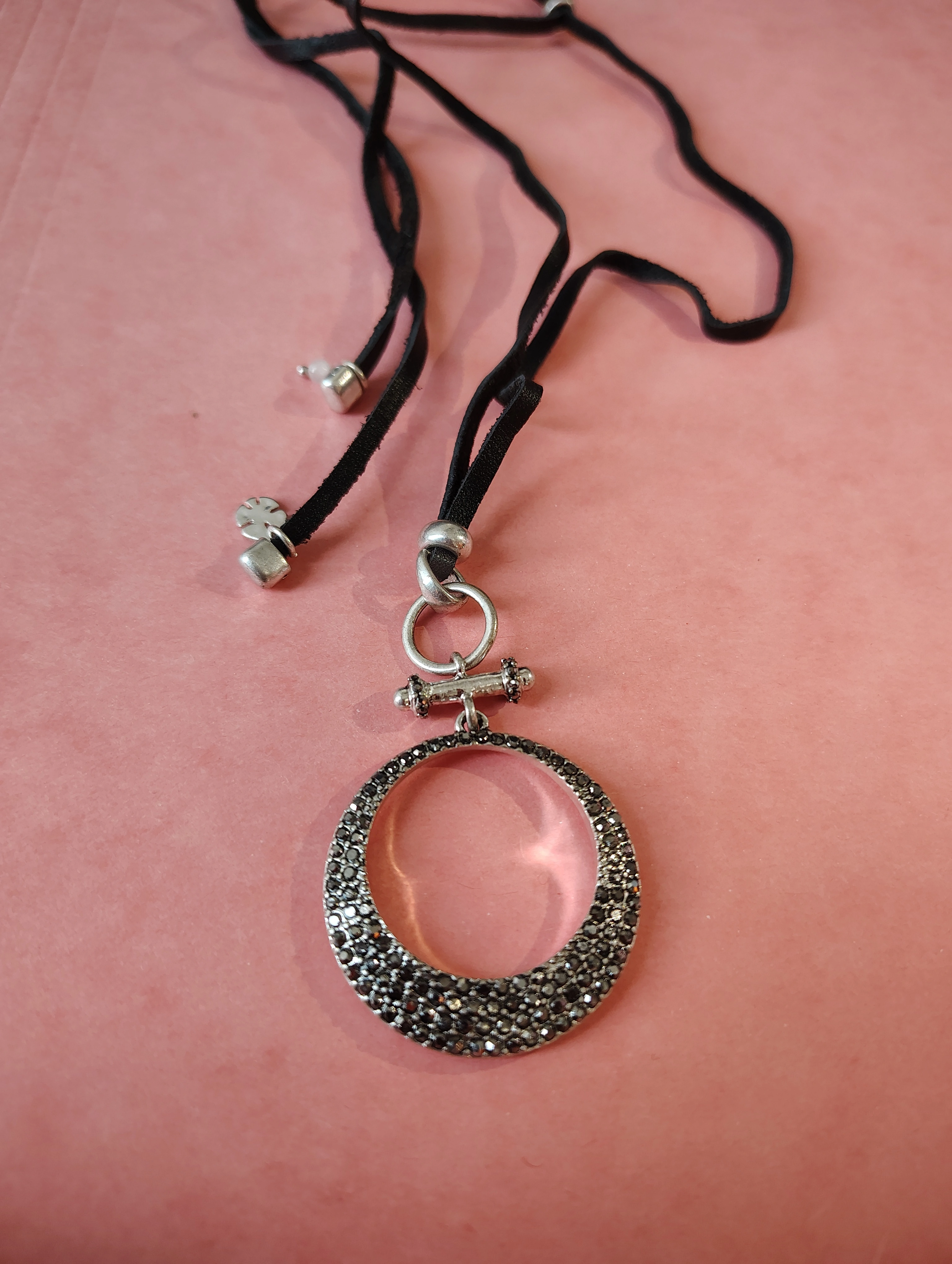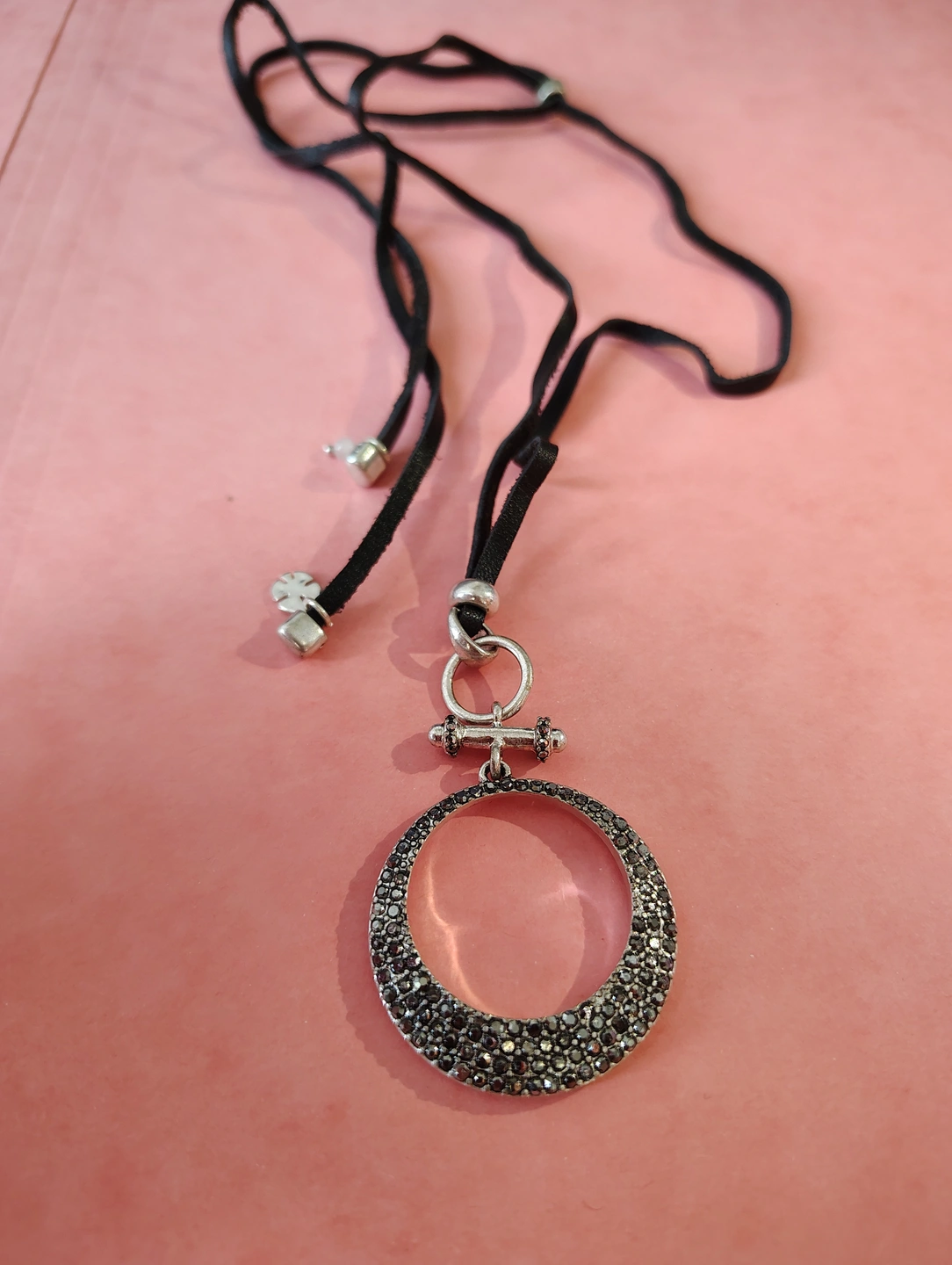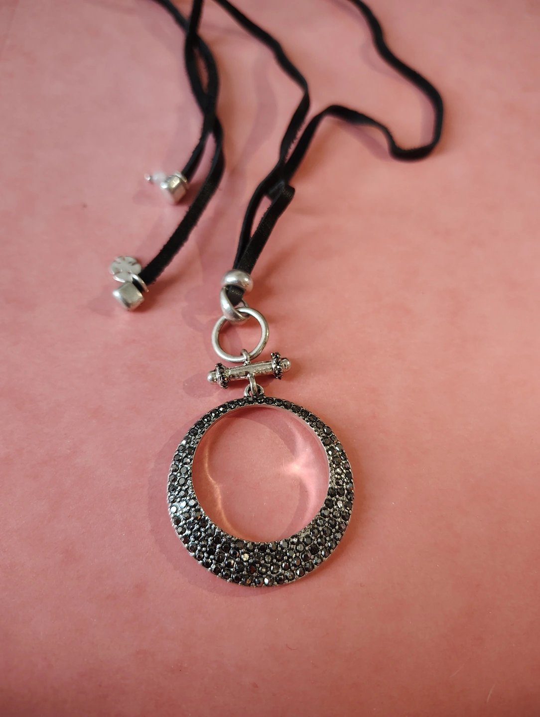 ✨Silver Tone Black Leather Pave Pendant Adjustable Necklace✨