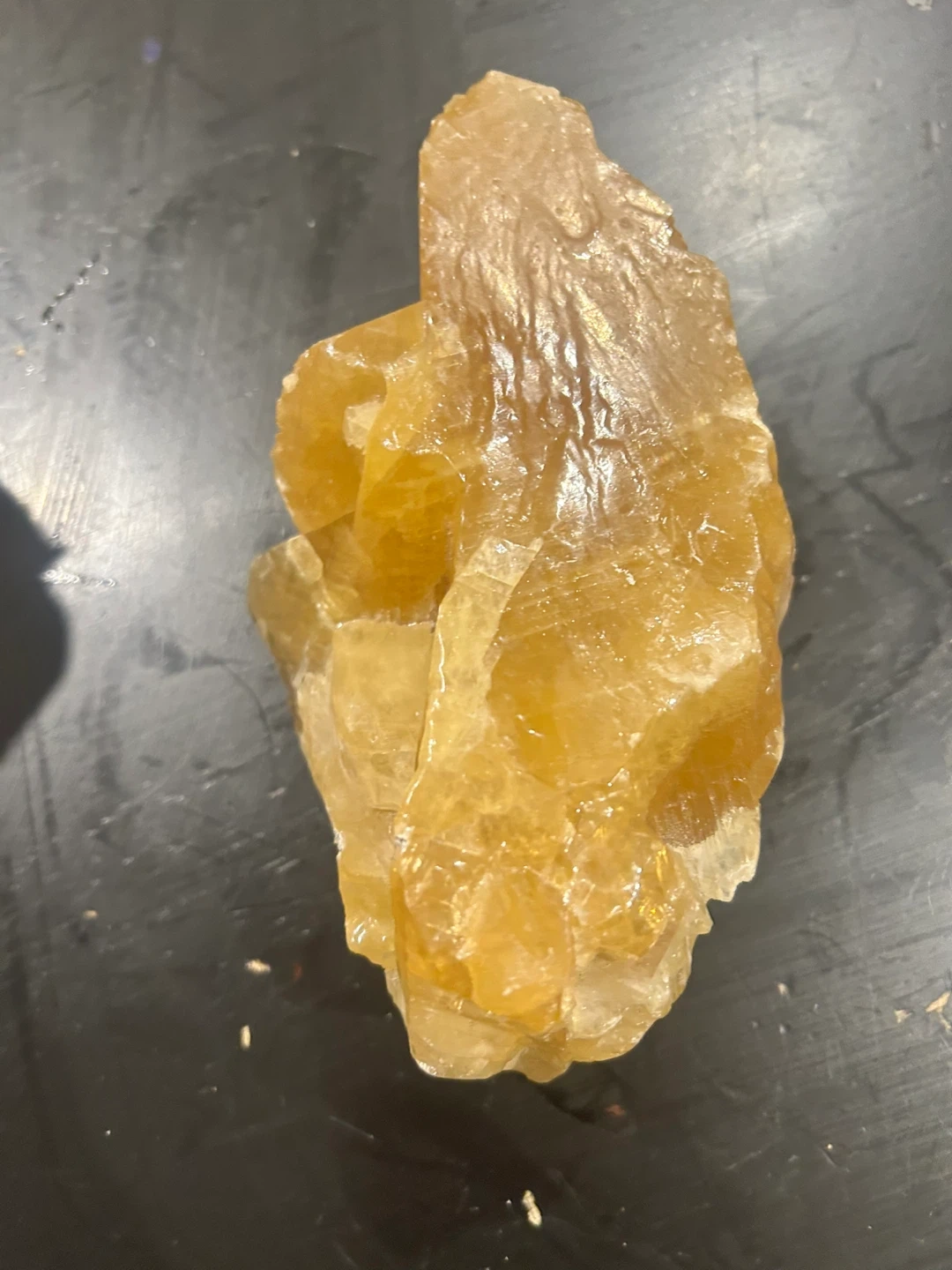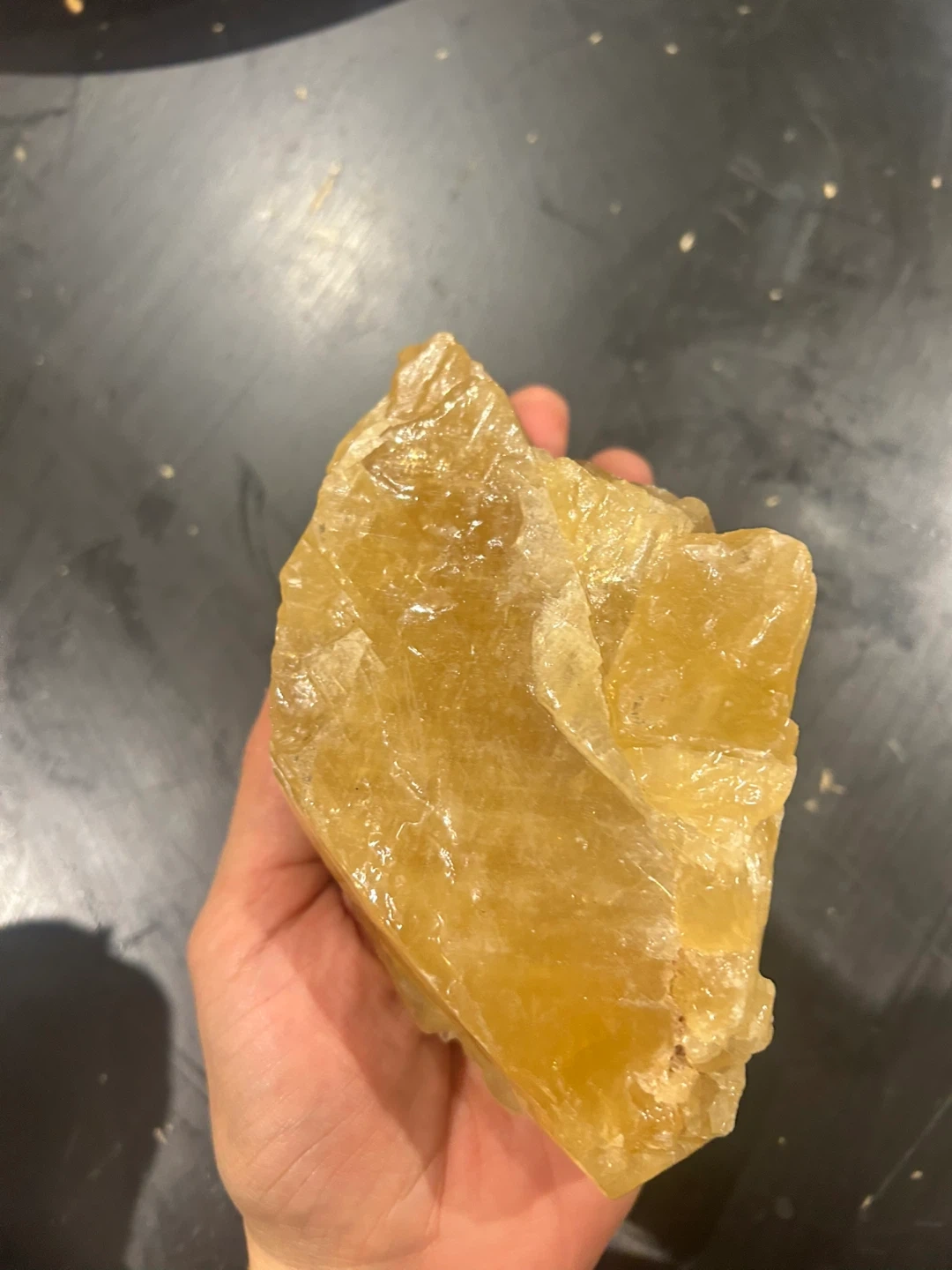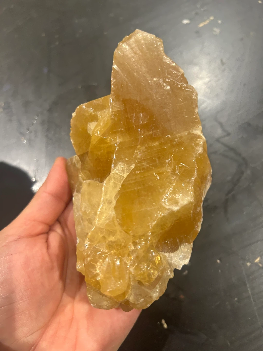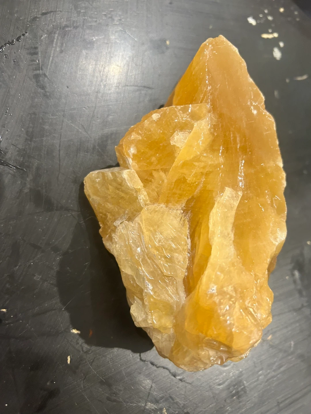 Here's a beautiful huge piece of yellow calcite crystal! It has a lovely translucent quality and would make a great addition to any collection or a nice decorative piece for your home.