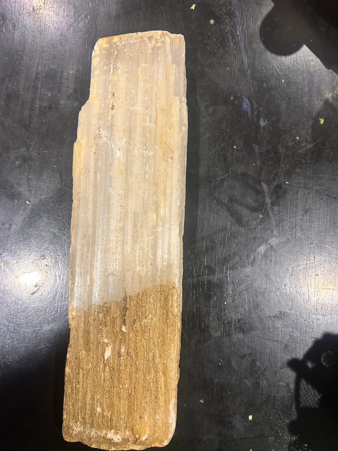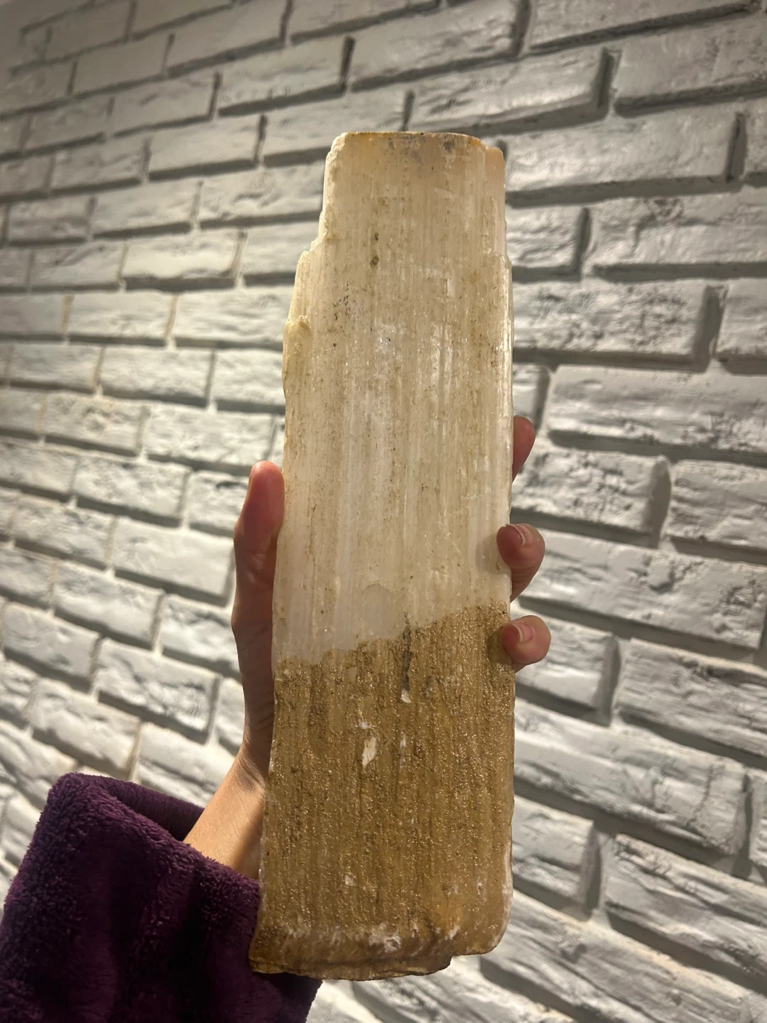 Selling a selenite crystal. It has a unique look with a sandy textured bottom half and a translucent white top half. It's perfect for adding a natural touch to your space