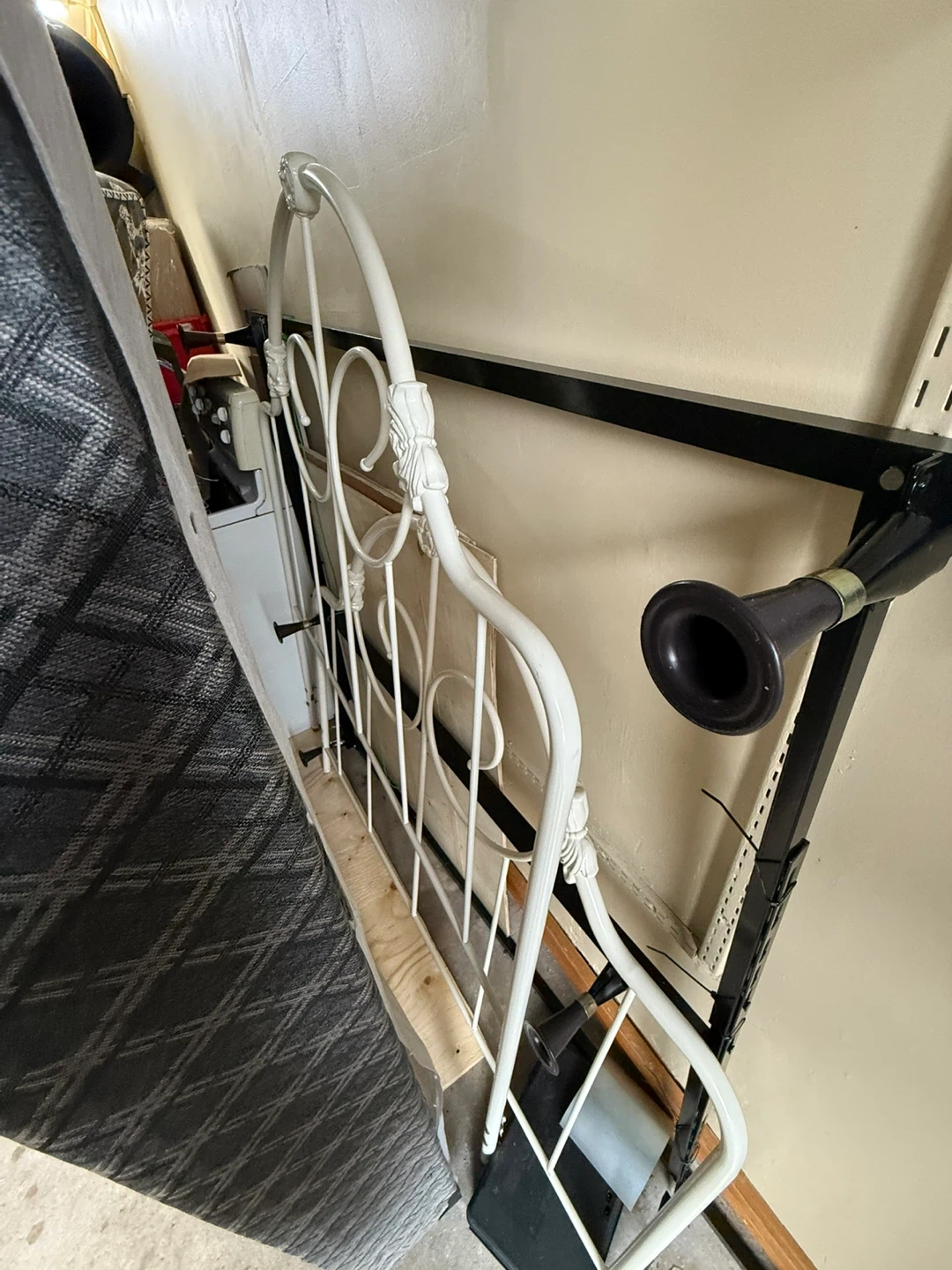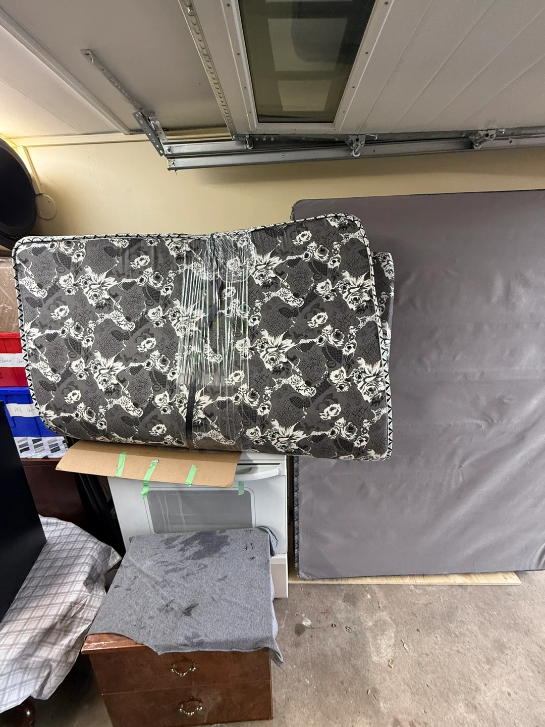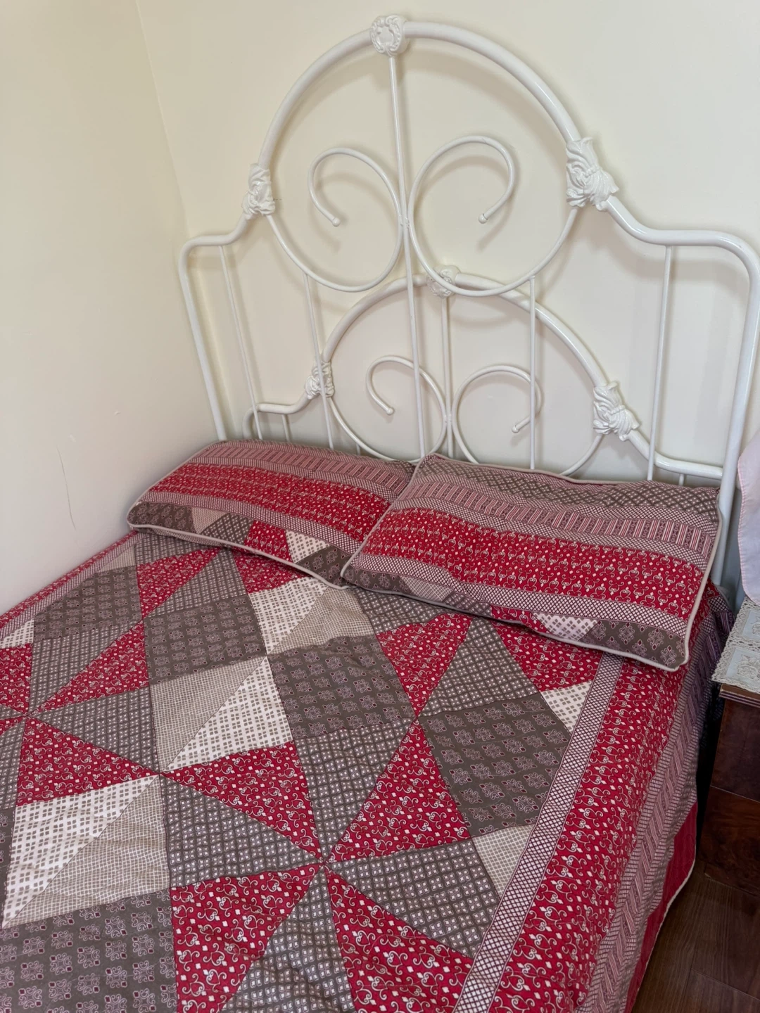 Selling a double size bed frame along with a mattress. The bed frame appears to be white metal with a decorative design. The mattress has a grey and white floral pattern on one side and a solid grey colour on the other. It's in good condition and ready for a new home!